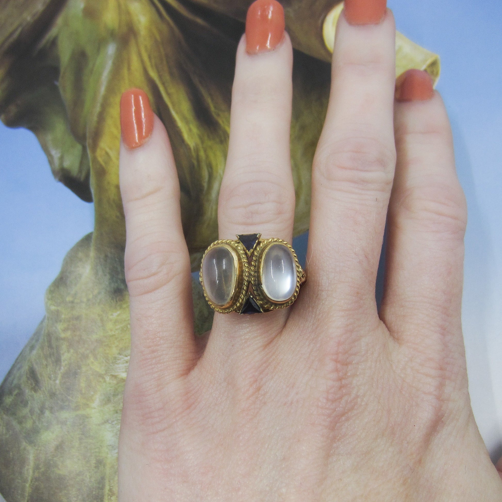 In overall good vintage condition. Evidence of previous resizing. Break to the bezel on one moonstone that is stable and not noticeable in person.