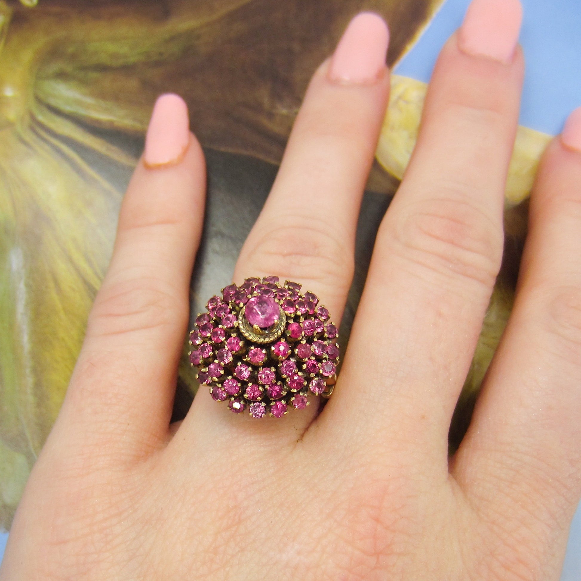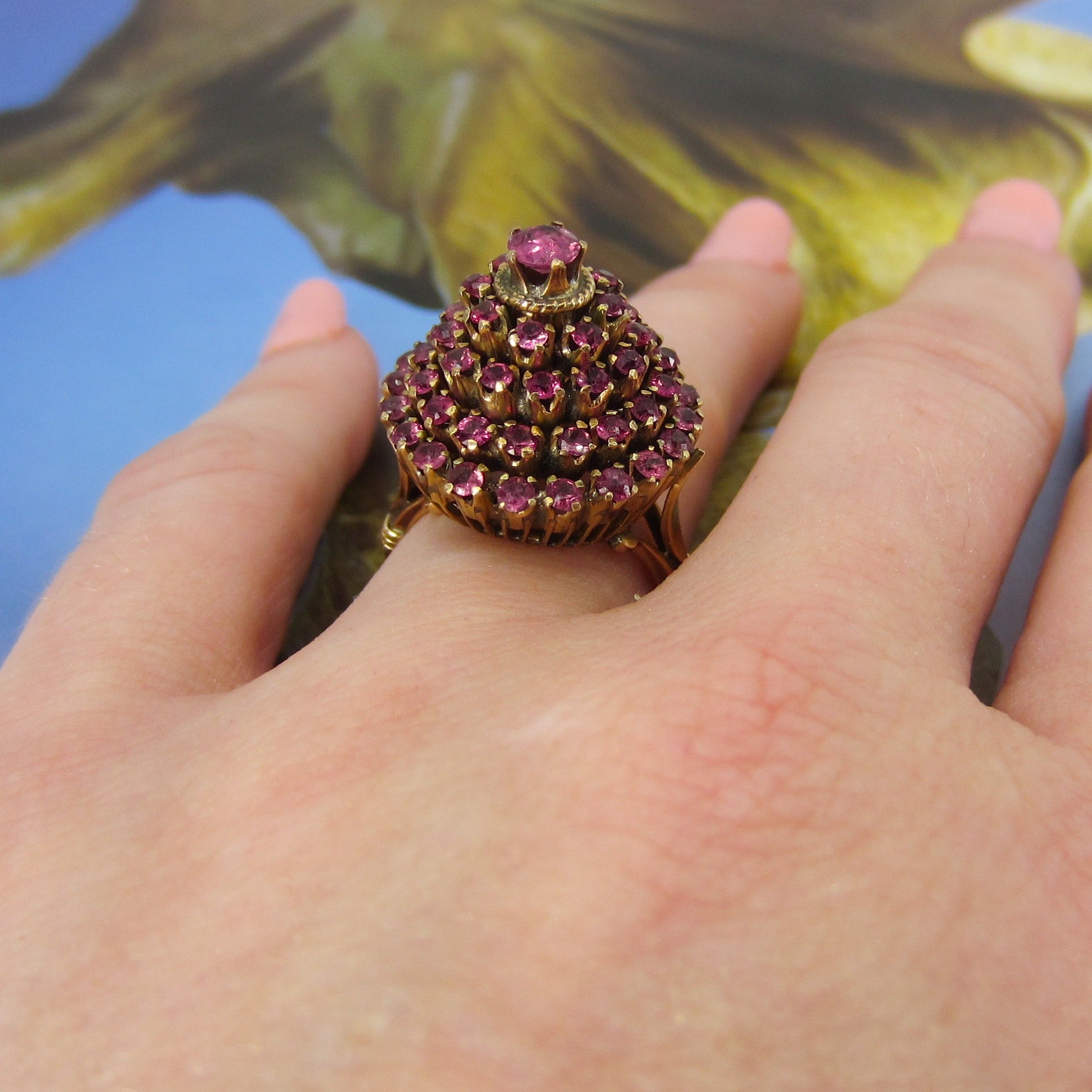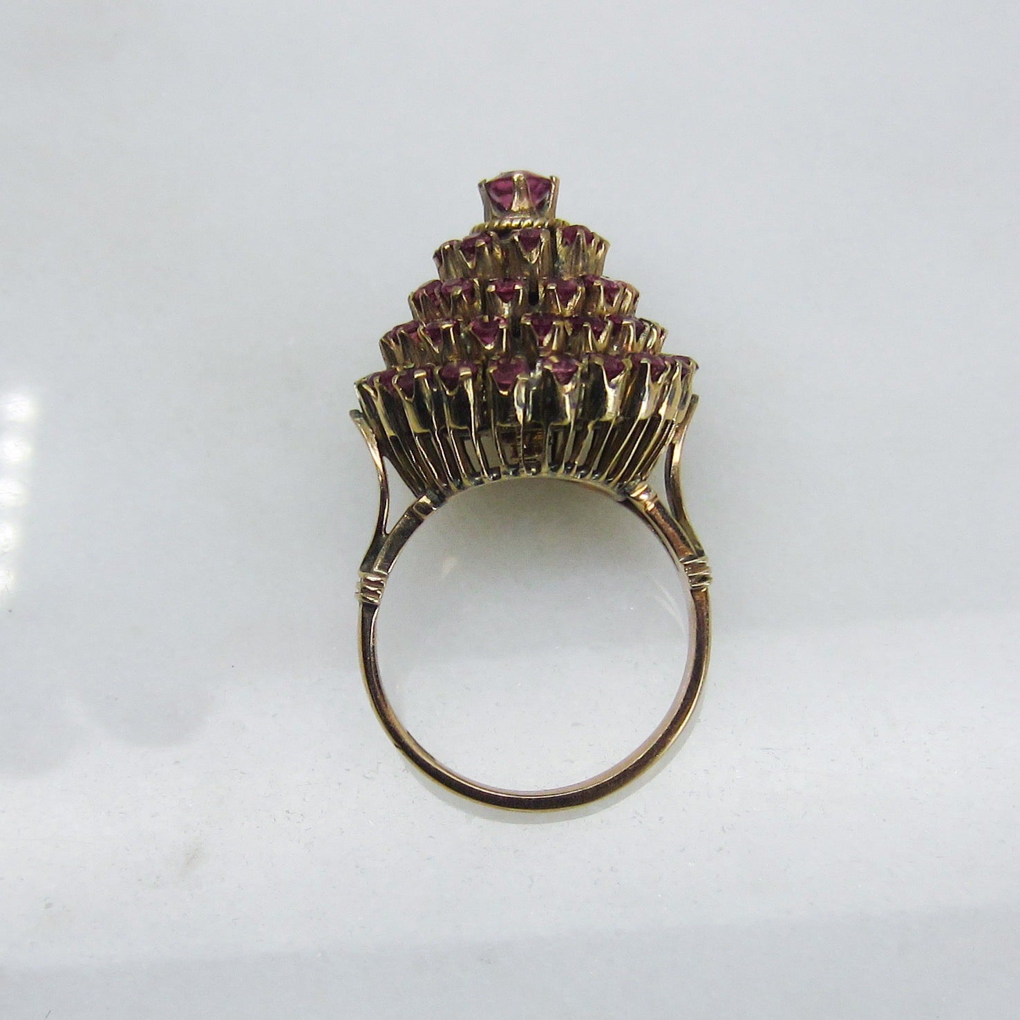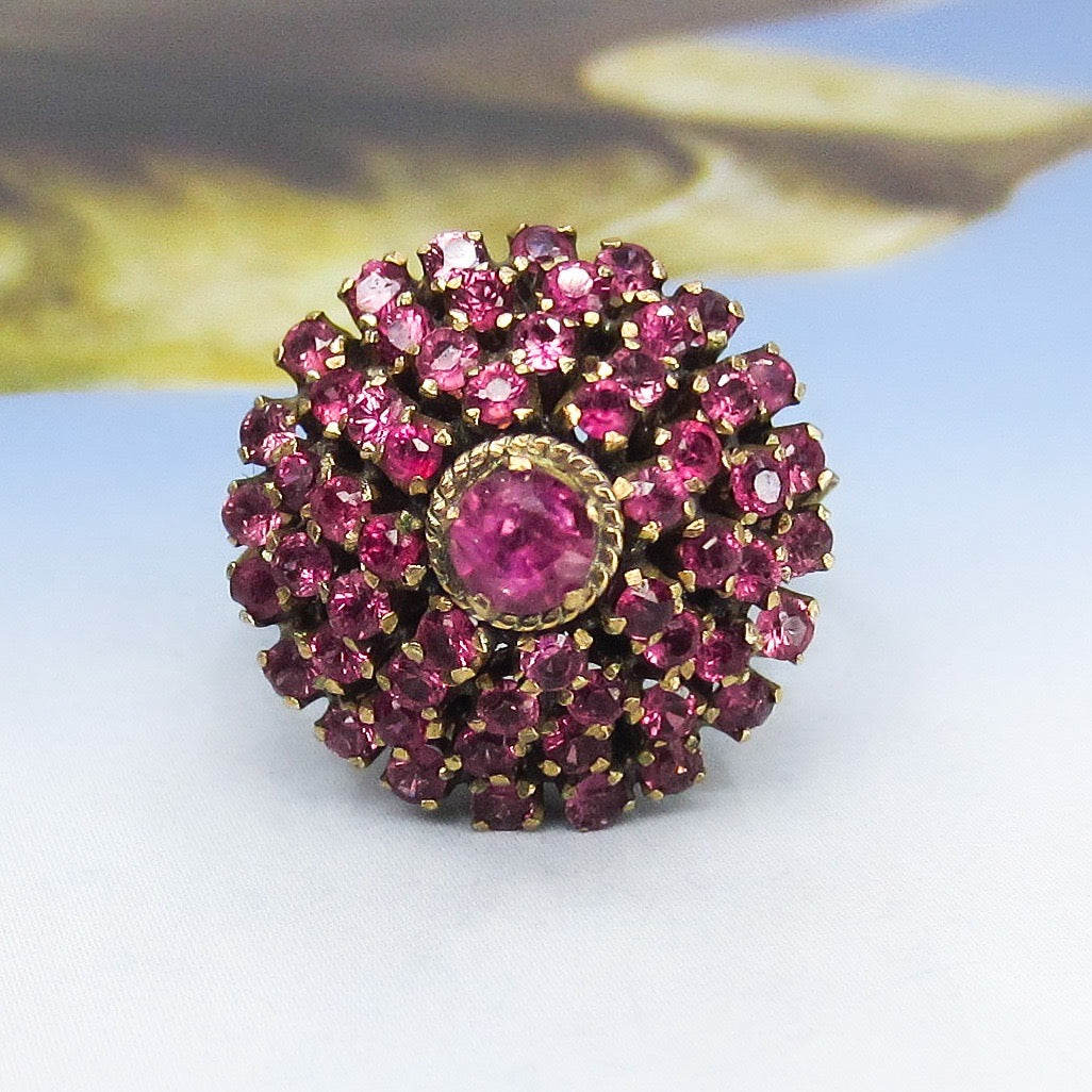 This vibrant vintage ring holds fifty-seven natural raspberry colored pink sapphires set in a tiered 14k setting and made circa 1960s. This ring is commonly referred to as a princess ring and I can't think of anything more princess-y than a ring full of pink stones! Pretty and very fun to wear.