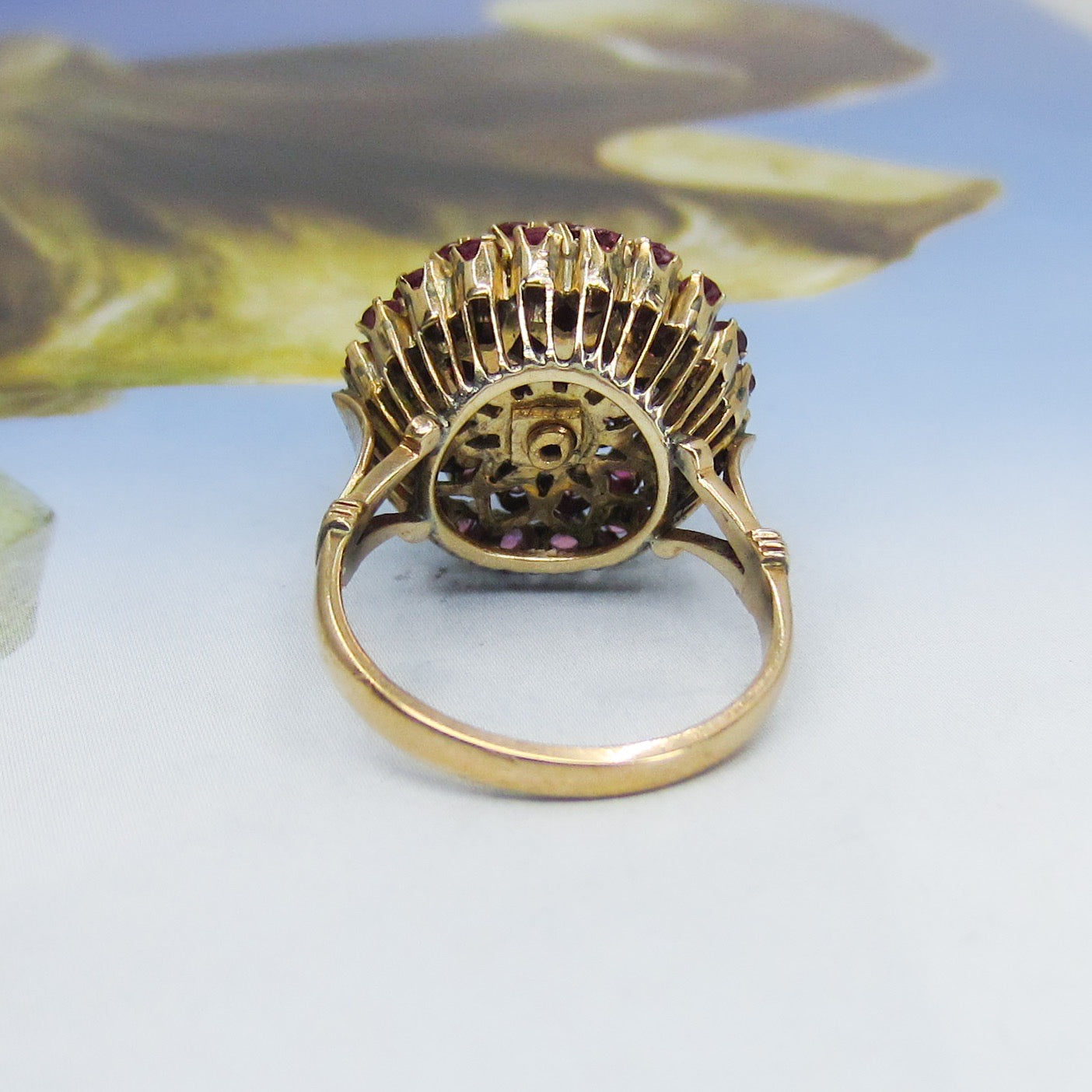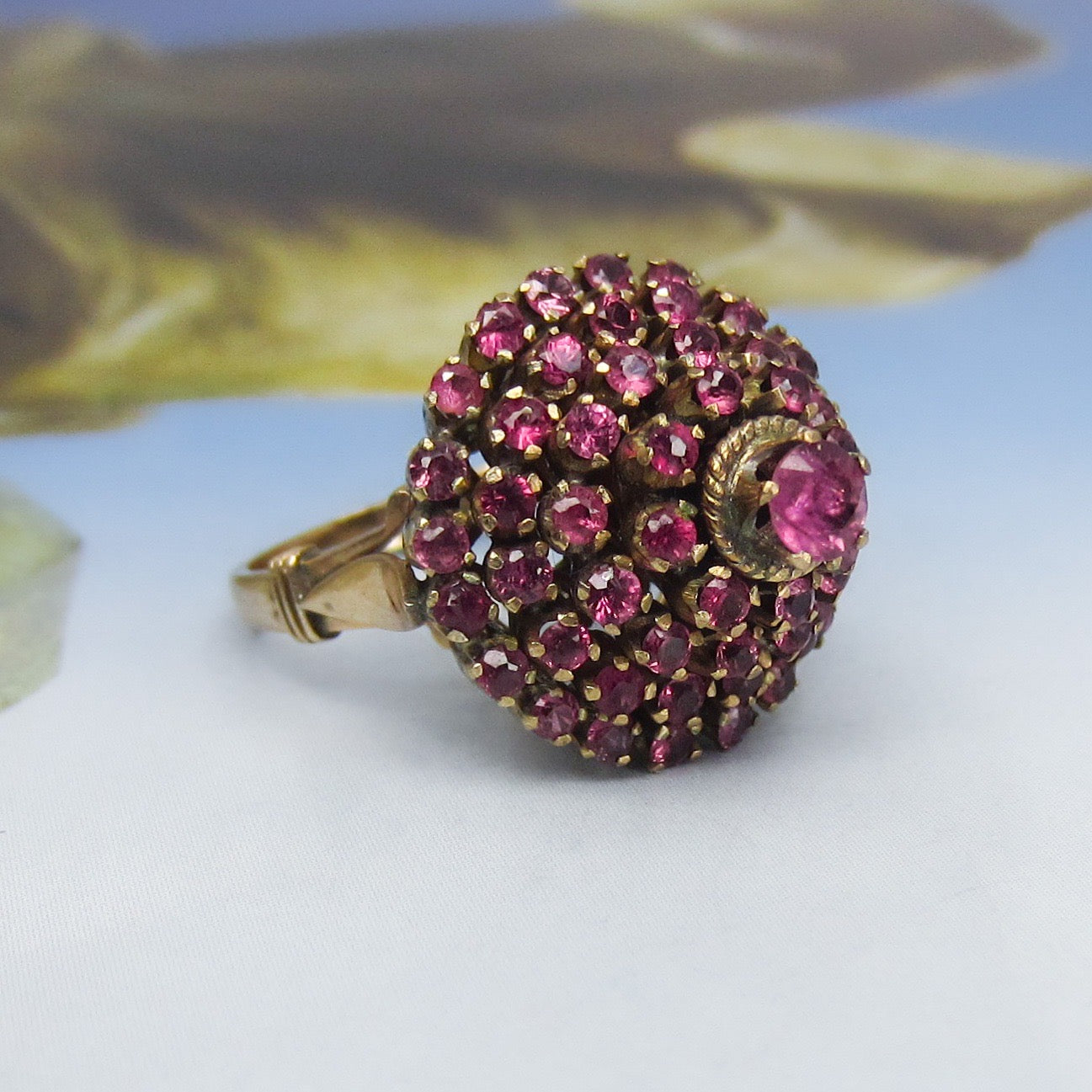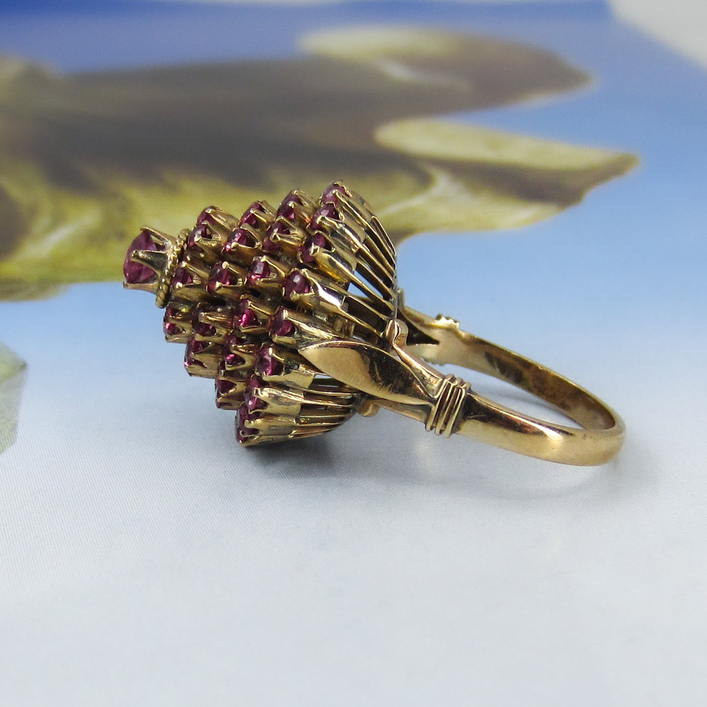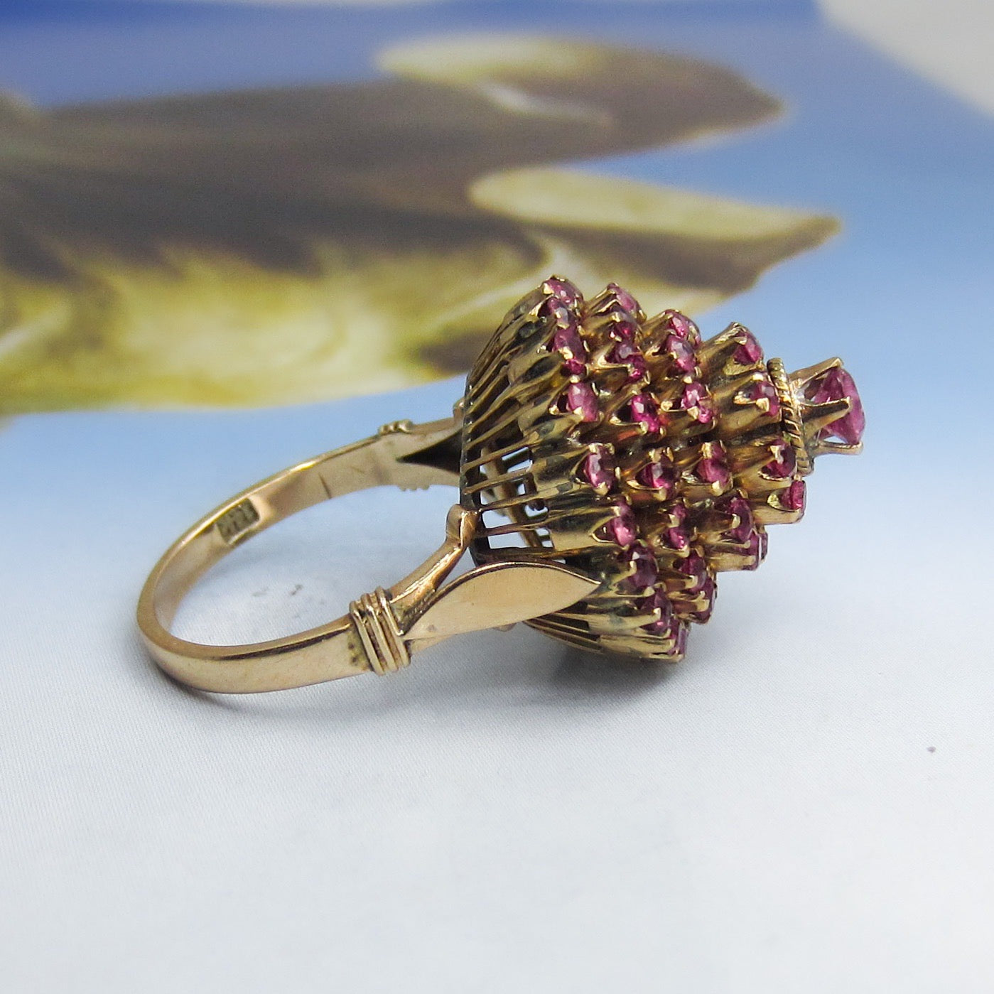 This vibrant vintage ring holds fifty-seven natural raspberry colored pink sapphires set in a tiered 14k setting and made circa 1960s. This ring is commonly referred to as a princess ring and I can't think of anything more princess-y than a ring full of pink stones! Pretty and very fun to wear.