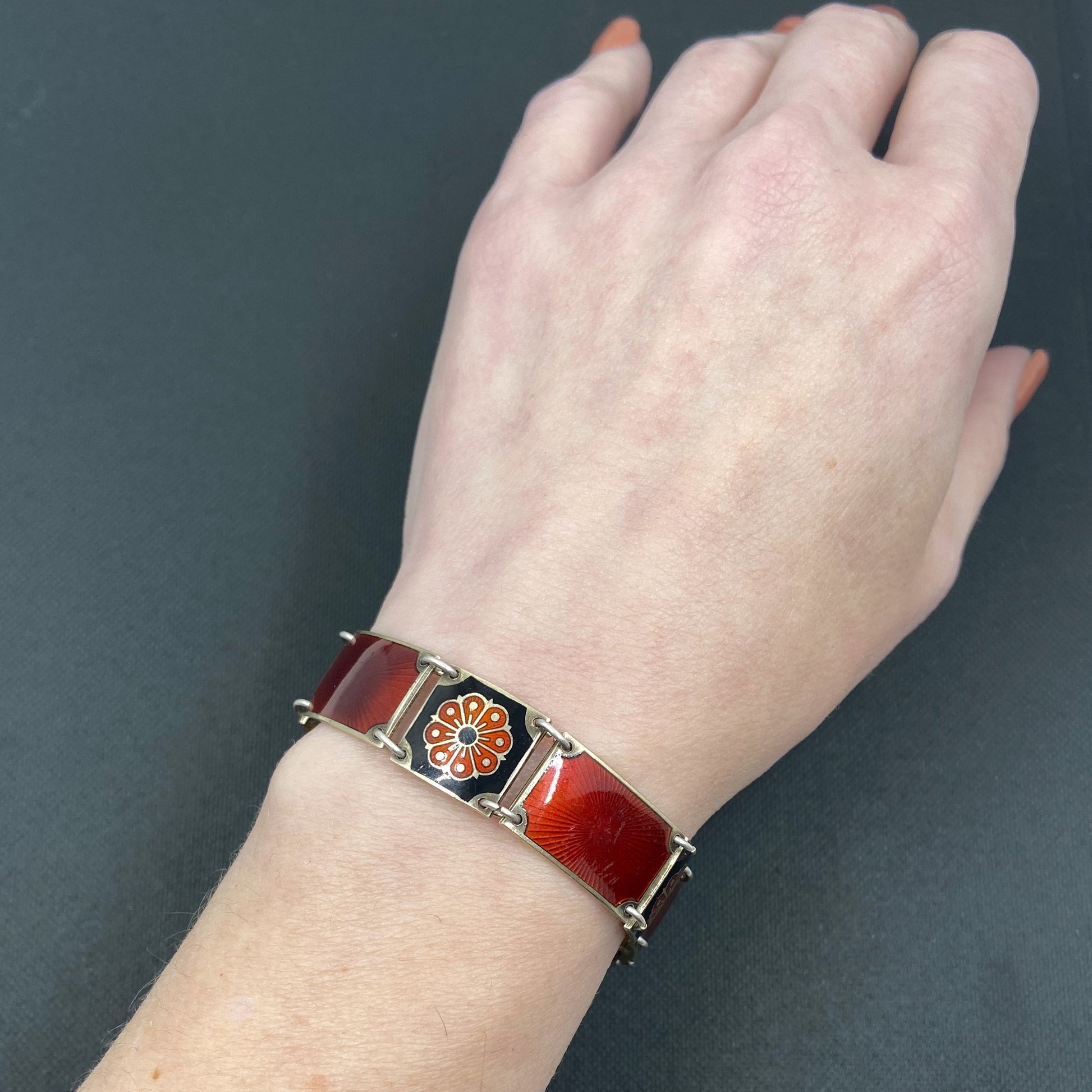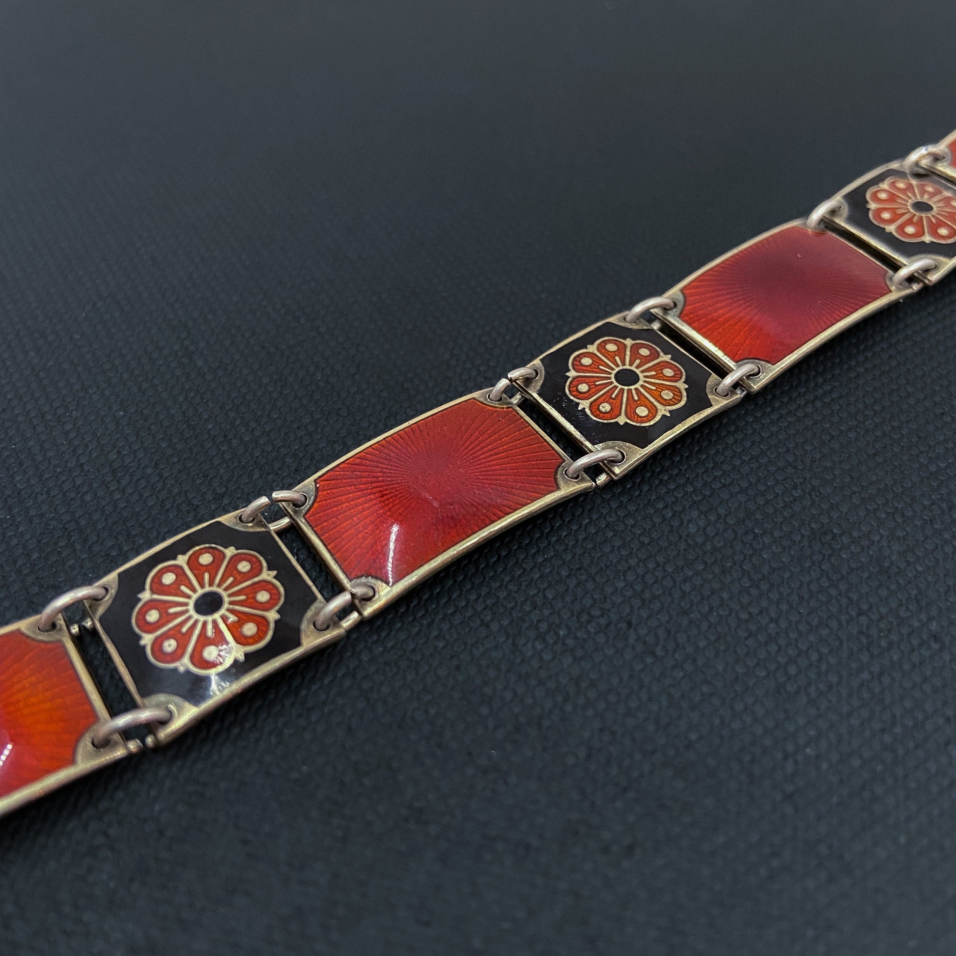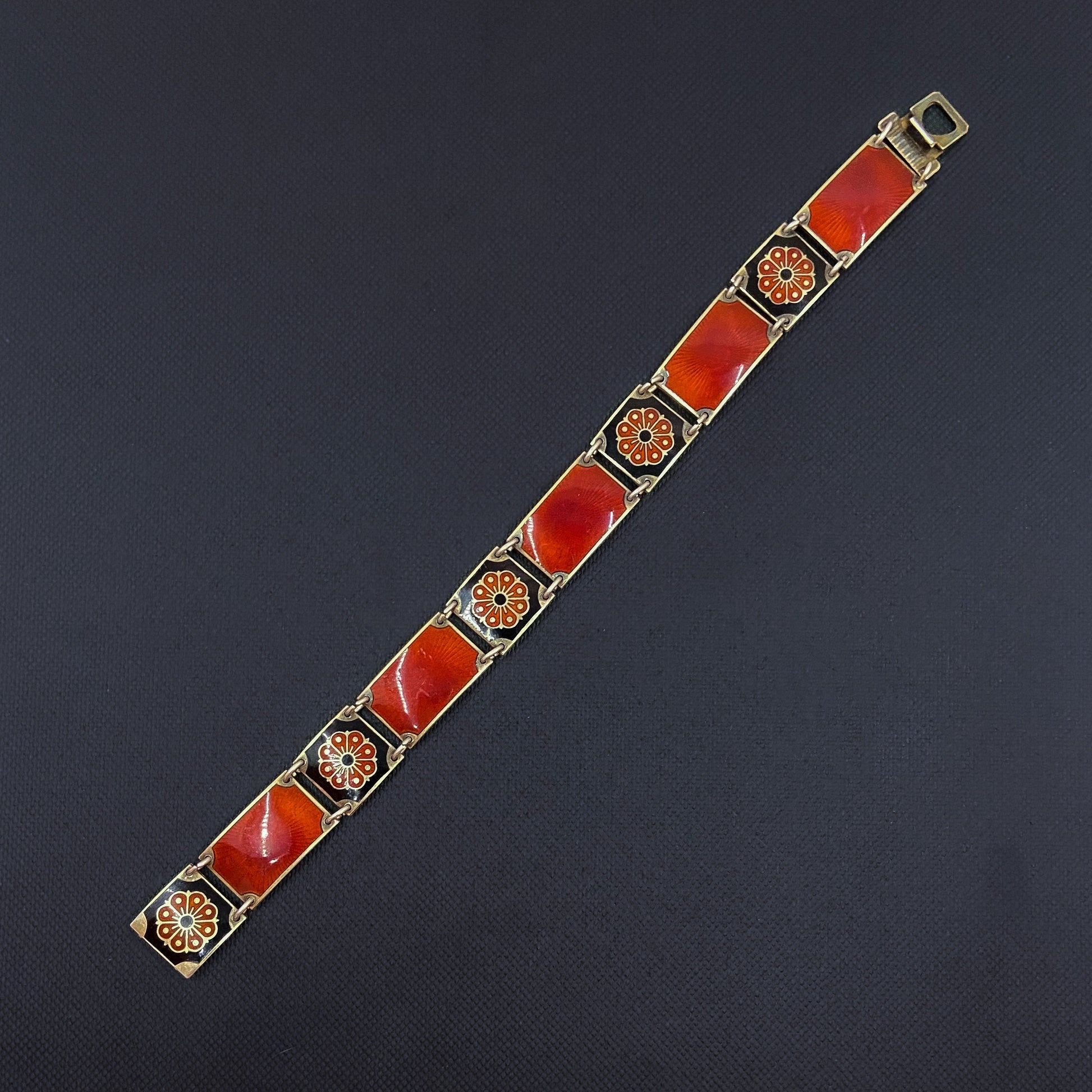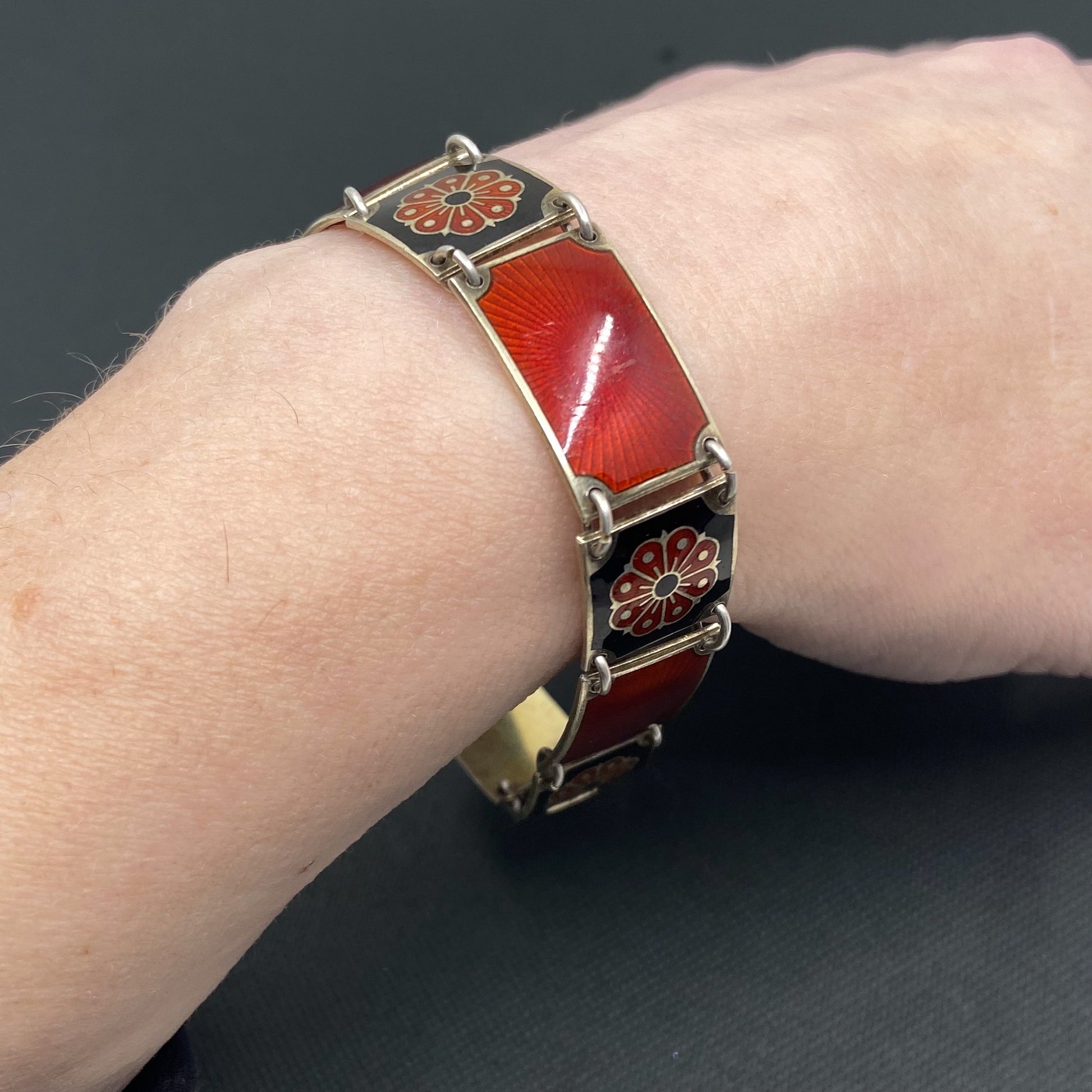 A vibrant enamel bracelet by renowned jewelry house David Andersen of Norway, featuring red Guilloche enamel panels with black and red enamel floral segments. Made in gilt silver cIrca 1950.