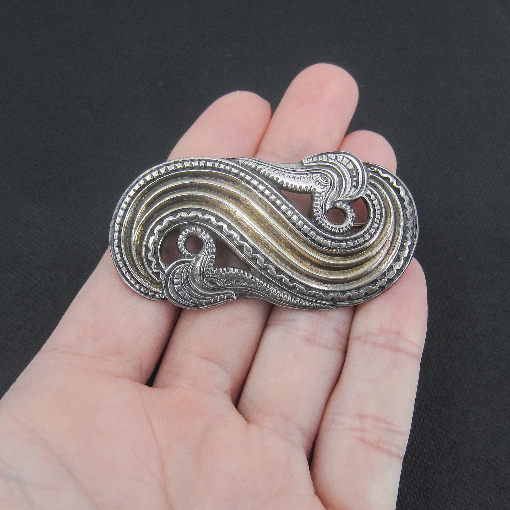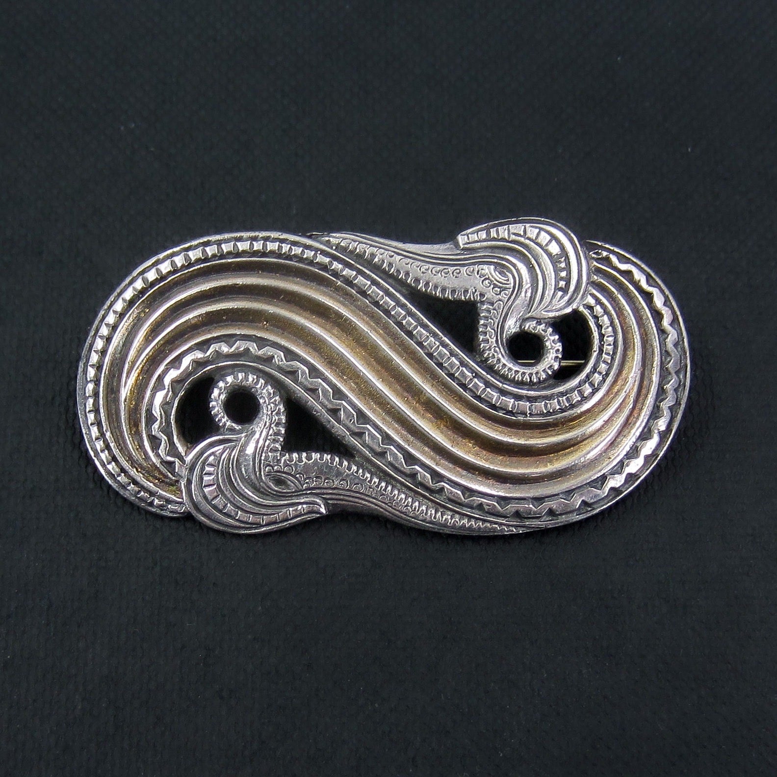 This is a very rare piece by Norwegian silversmith Henrik Moller, done in the Dragestil style of the Scandinavian Arts & Crafts movement. The Dragestil movement was a resurgence of Viking and Medieval motifs and styles, originating in Norway in the late 1800's. On the reverse of this brooch it is engraved "COPY OF BROOCH FROM 5TH CENTURY A.D." I haven't been able to locate the original brooch this was copied from but it certainly fits with the early Medieval decorative style from this region--and it was nice of Henrik to give credit! Featuring tentacles from a sea creature? A serpent perhaps? This undulating and textured brooch was made in 850 silver has a gold-washed center that is still intact and very lovely patina. It's not large but it is dense with a nice weight and fine quality workmanship!