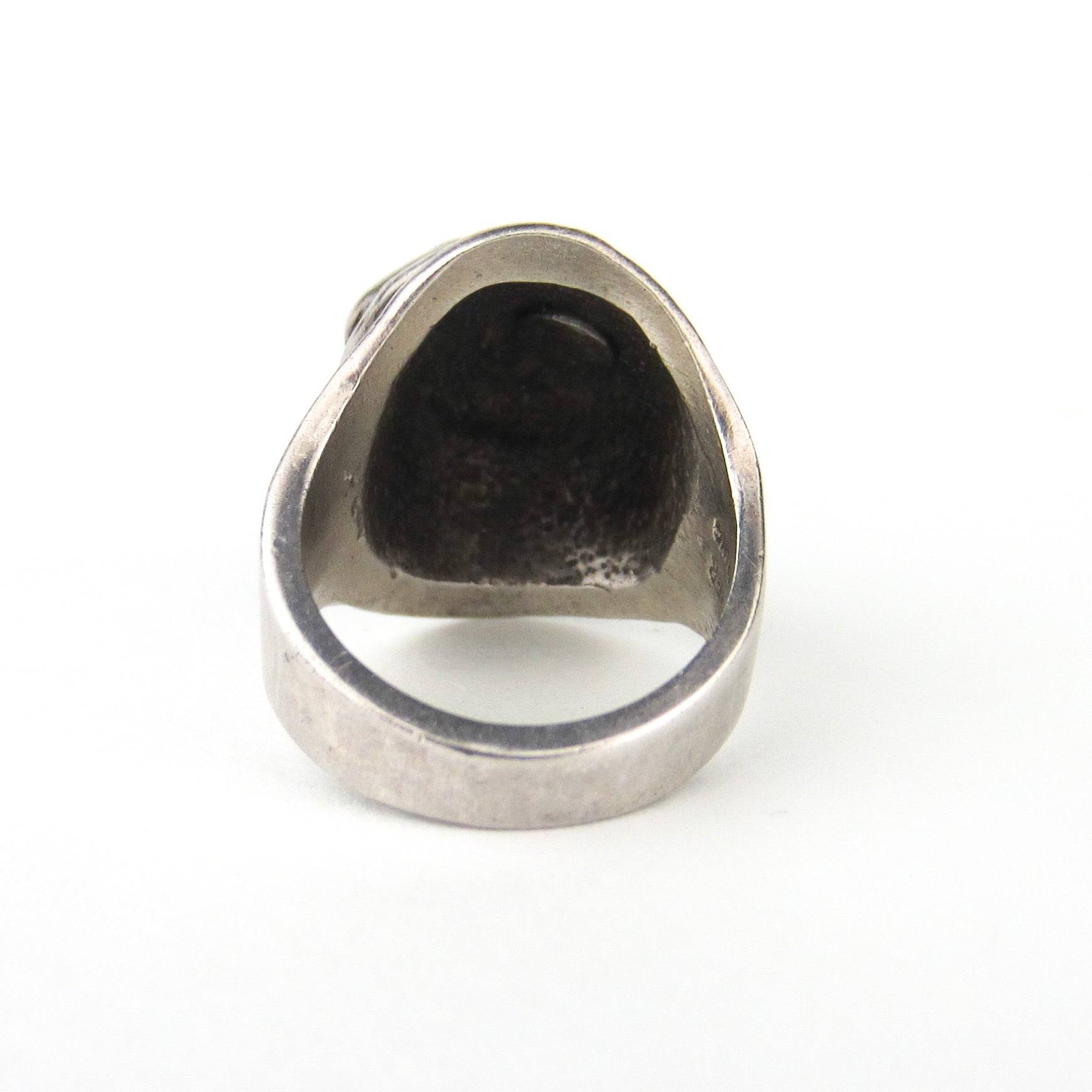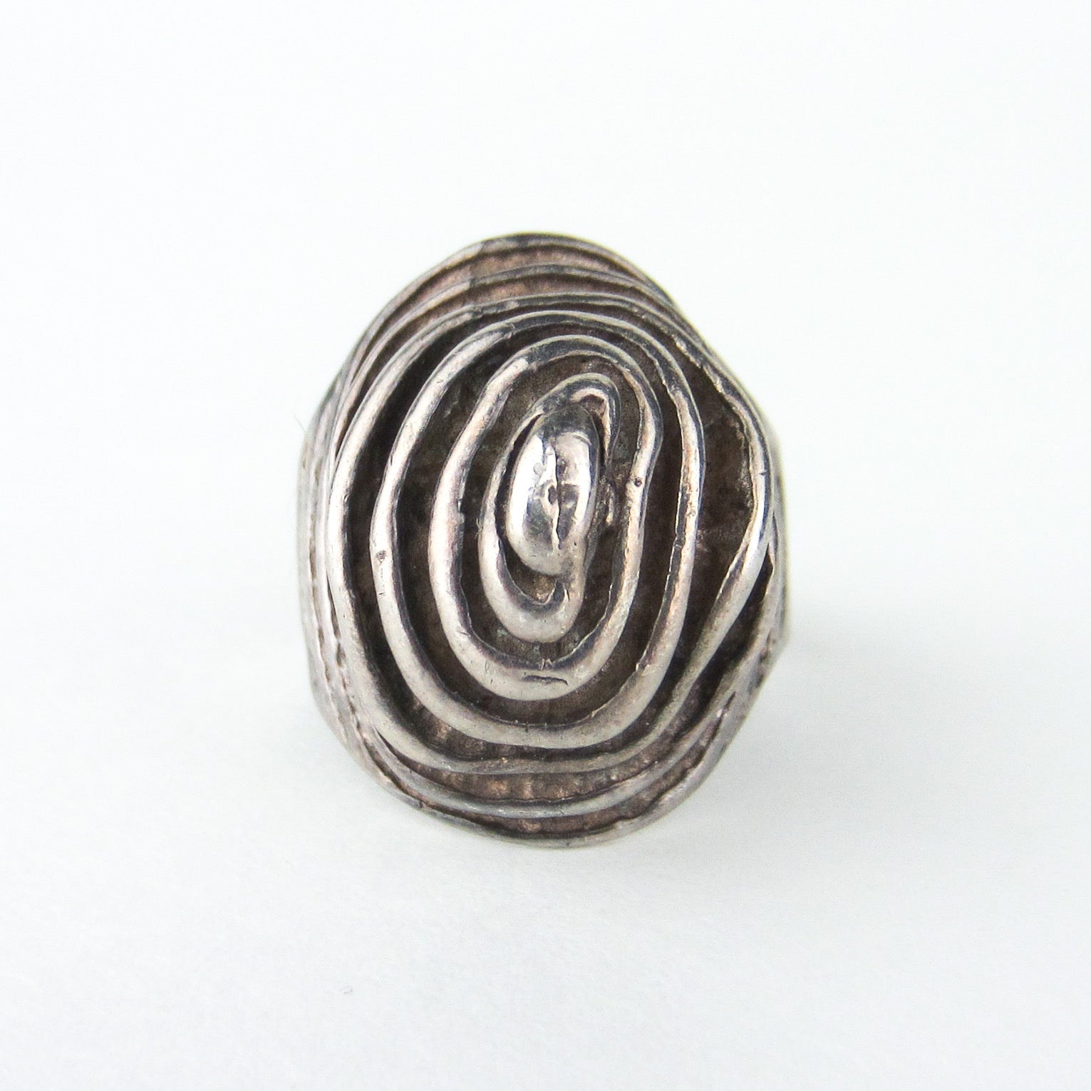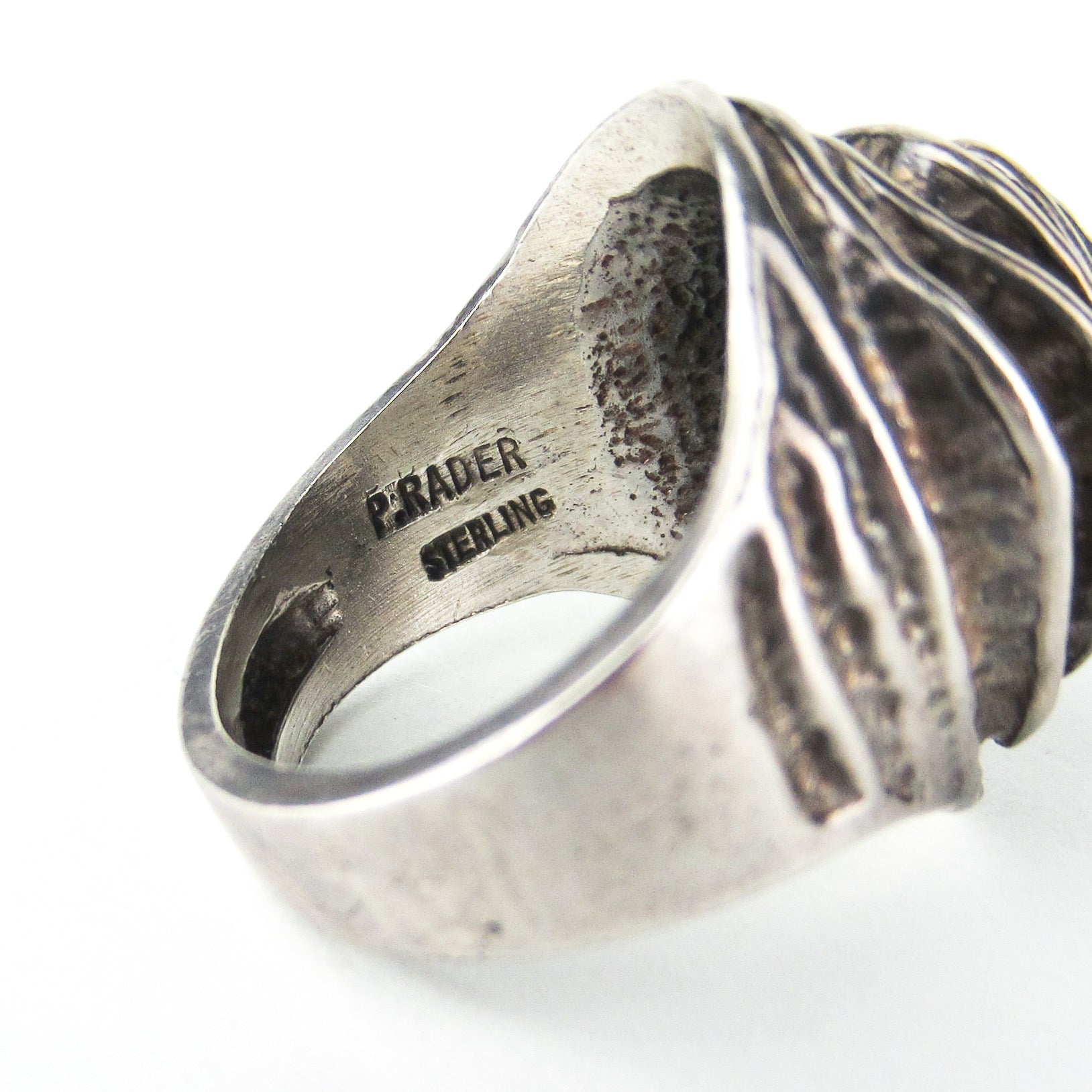 A fantastic modernist ring and rare sterling silver piece by famed jewelry designer Pauline Rader. Pauline is best known for her large and fabulously whimsical pieces from the 1960's. This ring is weighty and very well made, and is unisex and would look great on anyone who dares to wear it!