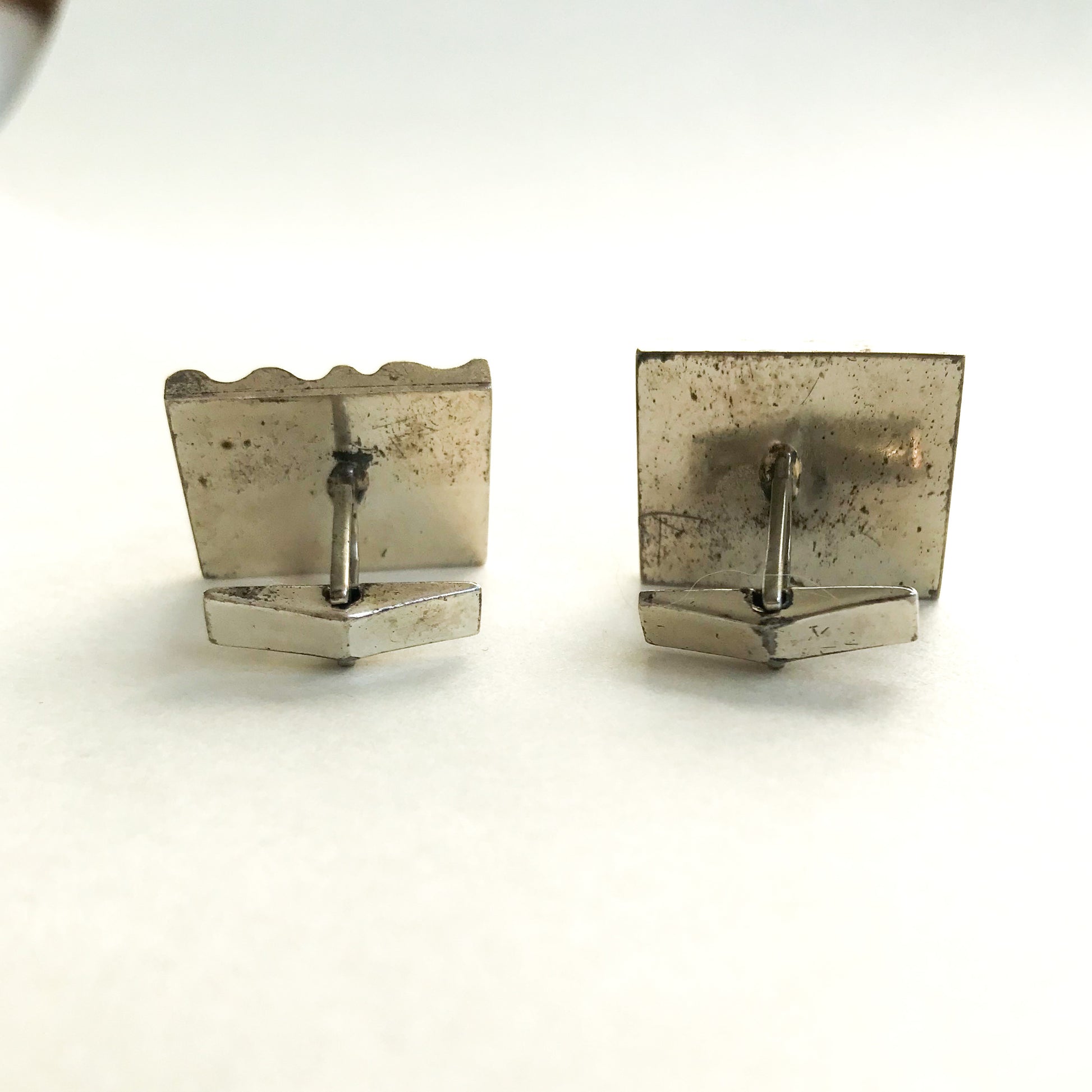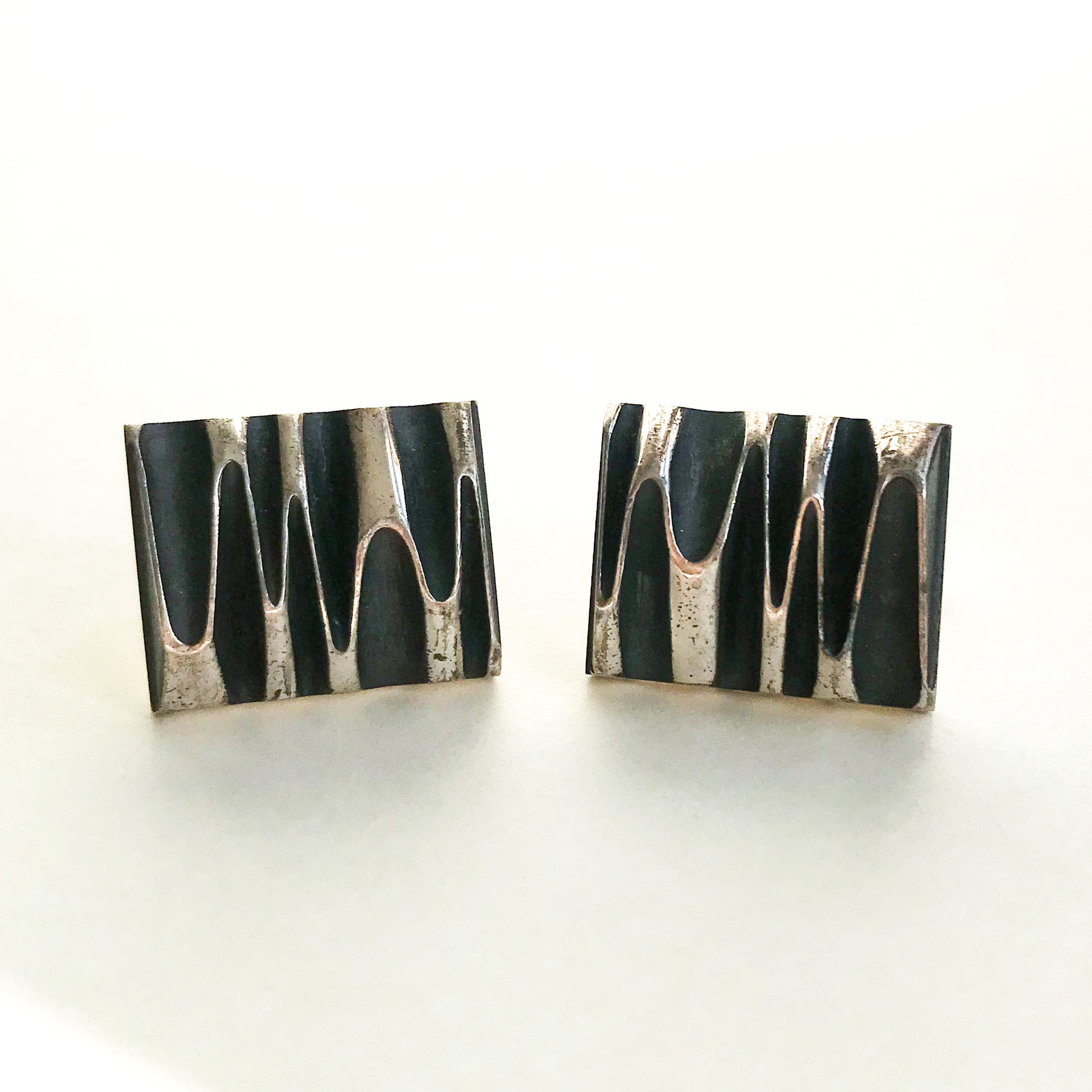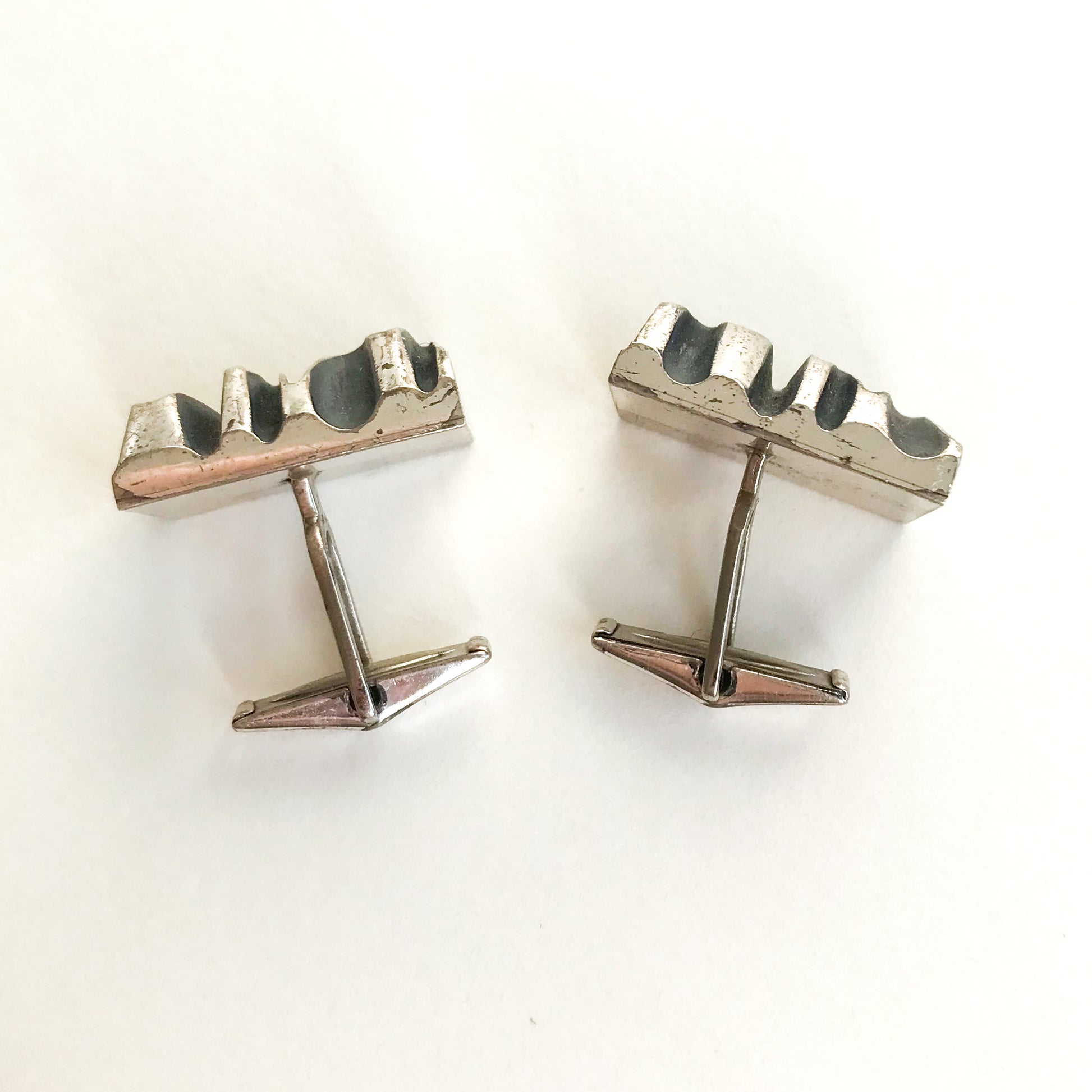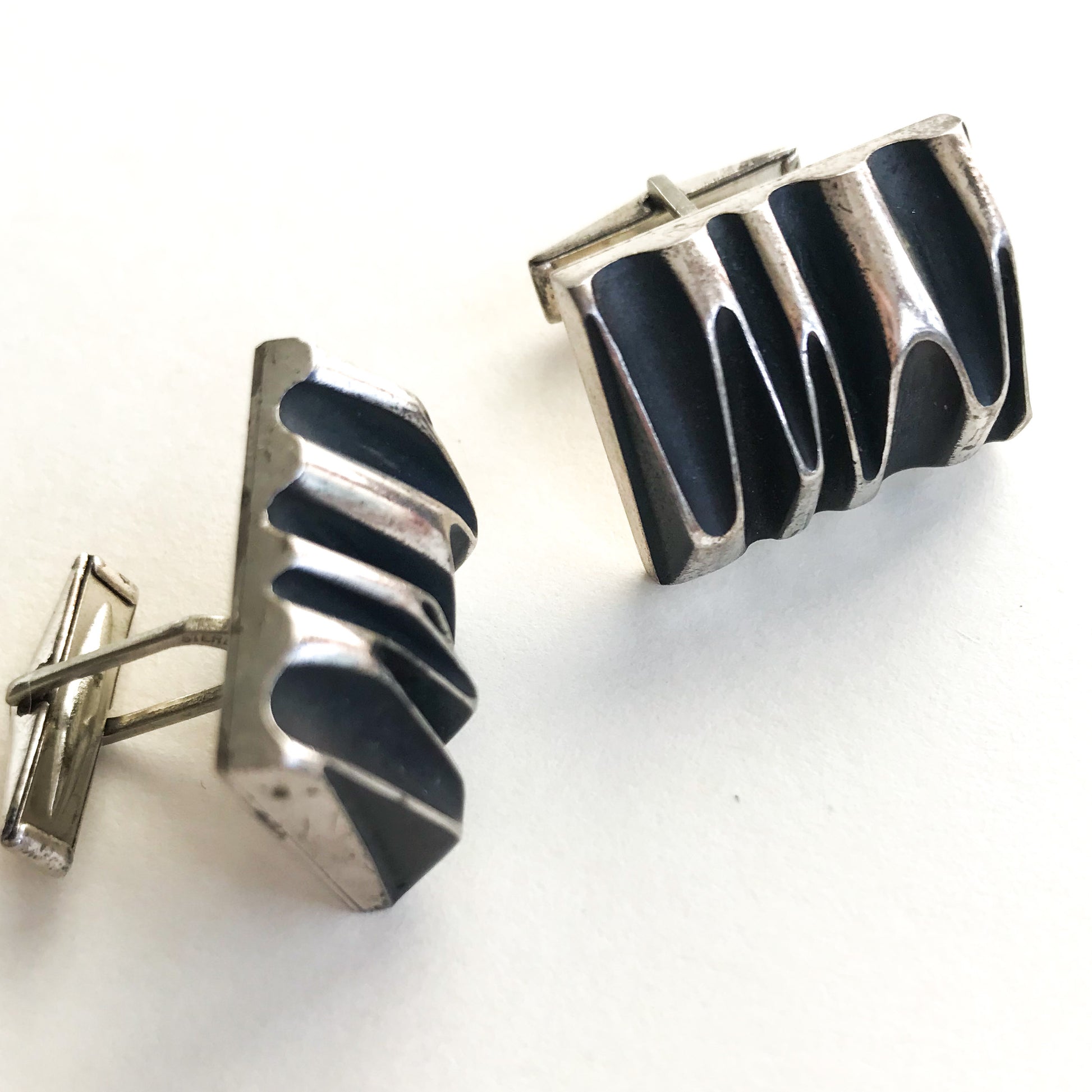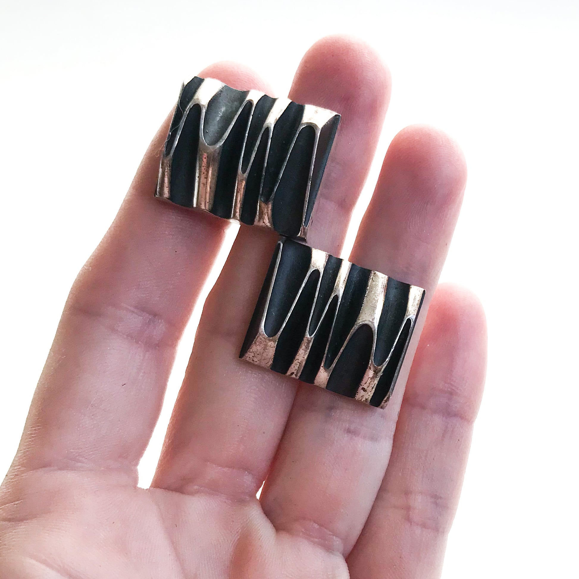 I really wish there was a way for women to wear more cufflinks because damn these are good! These ultra mid-century Modernist cufflinks were made by Harold Fithian c. 1960 and are made of sterling silver (cufflink) and silver plate (toggles). Designed as an undulating three dimensional surface with oxidized background, they look great from all angles and add that Mad Men elegance to your ensemble!