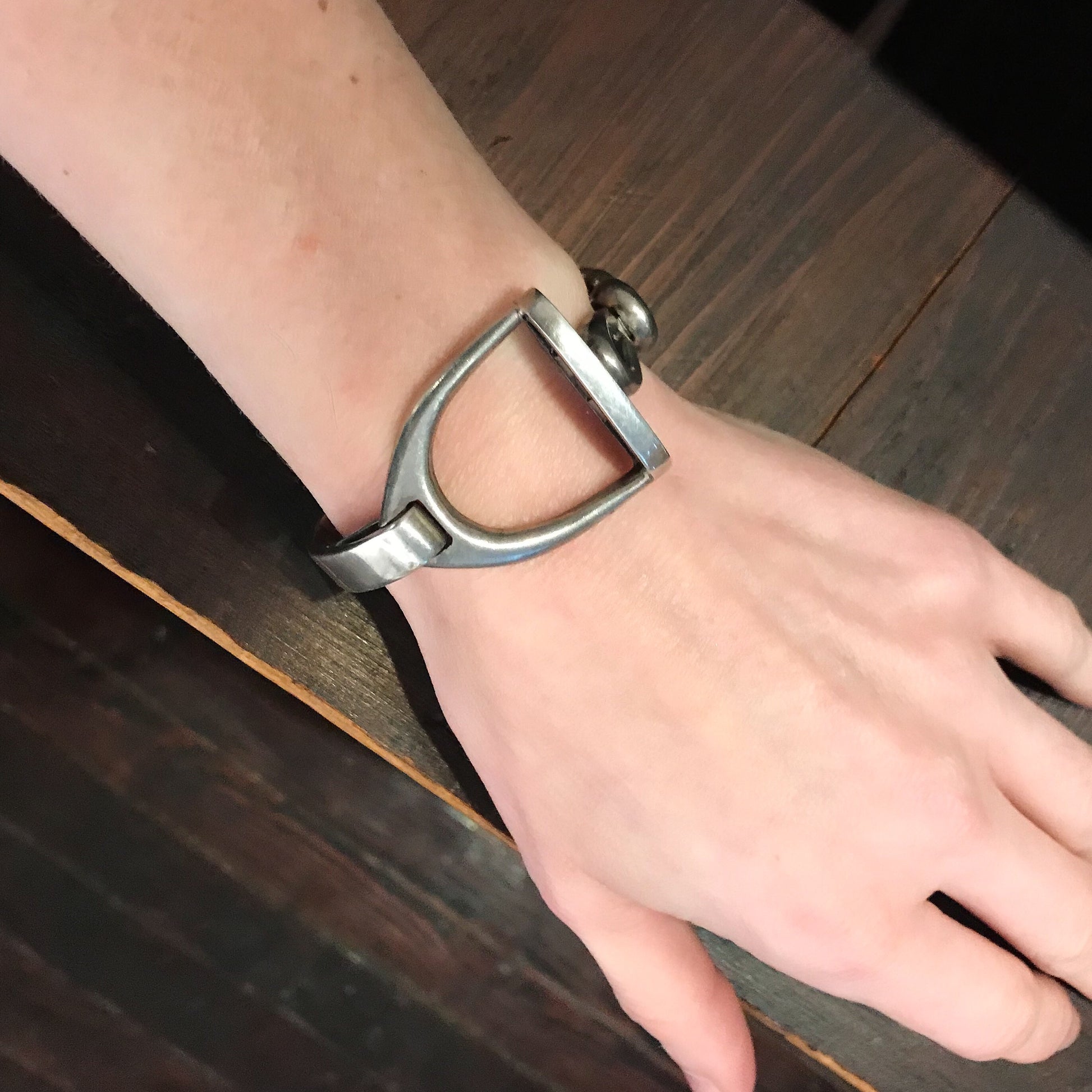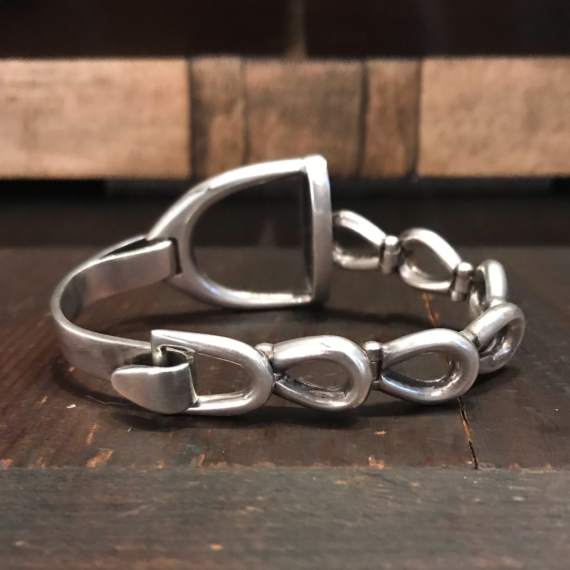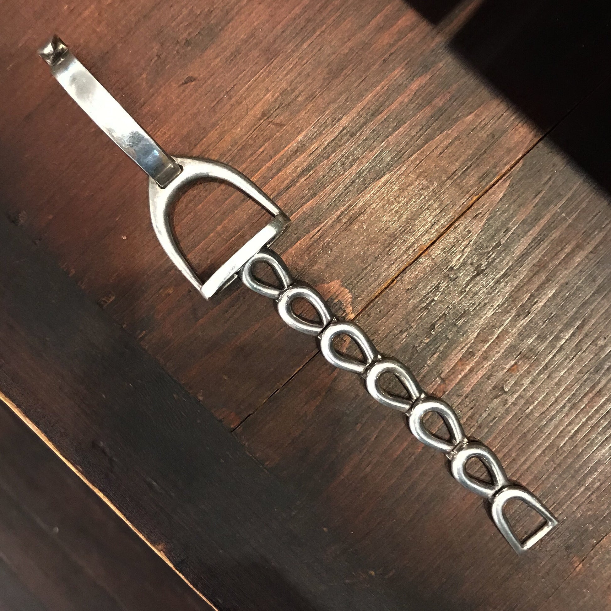 I don't understand how this GREAT modernist bracelet has made it through even one week at the store without selling--look at this thing! Designed as a solid stirrup with flexible link chain in sterling circa 1970, this piece is about a chic as it gets. And it is definitely the best of this style that I have ever seen. If you like it snatch it up because you won't see it again!