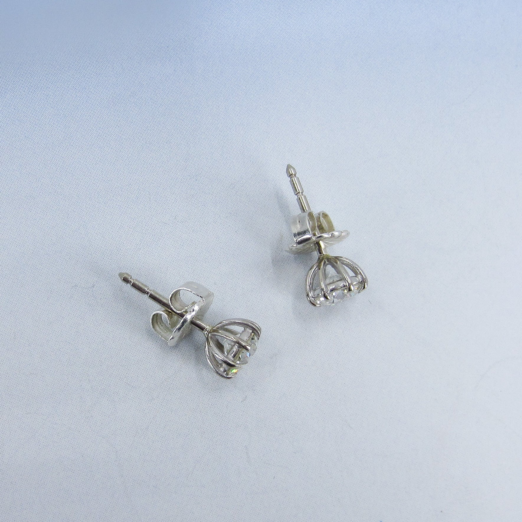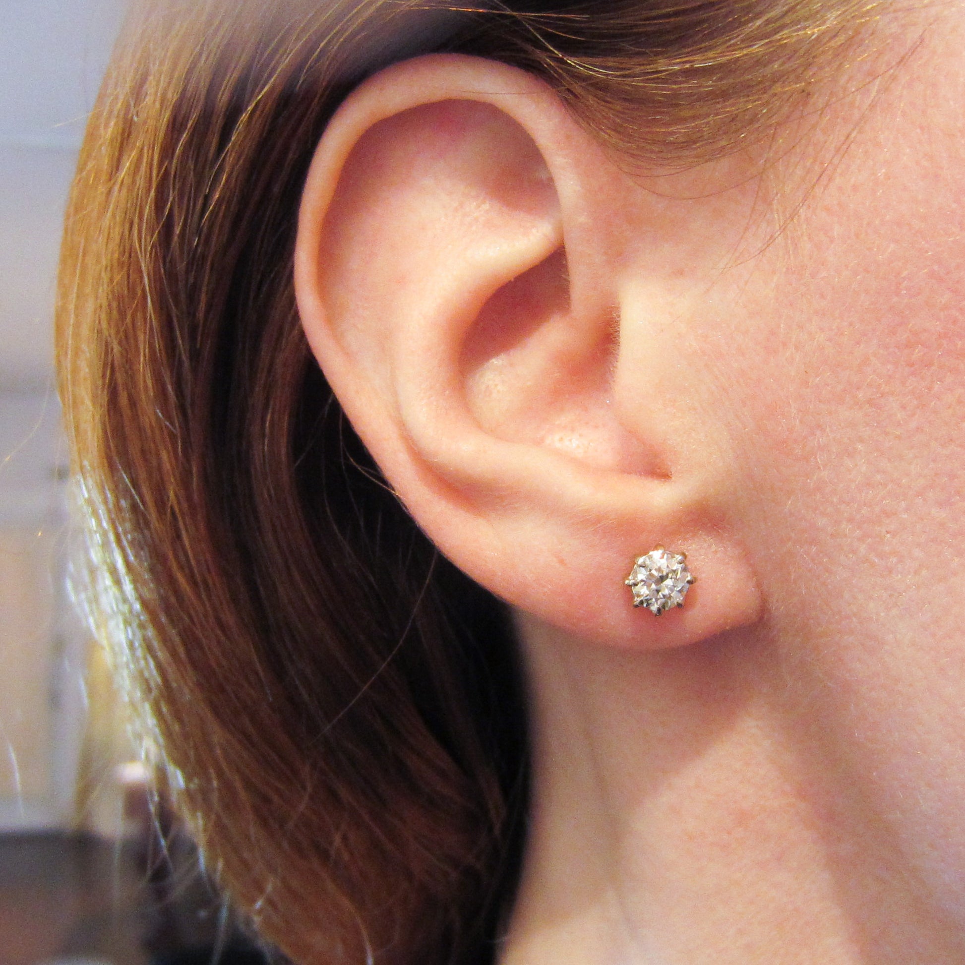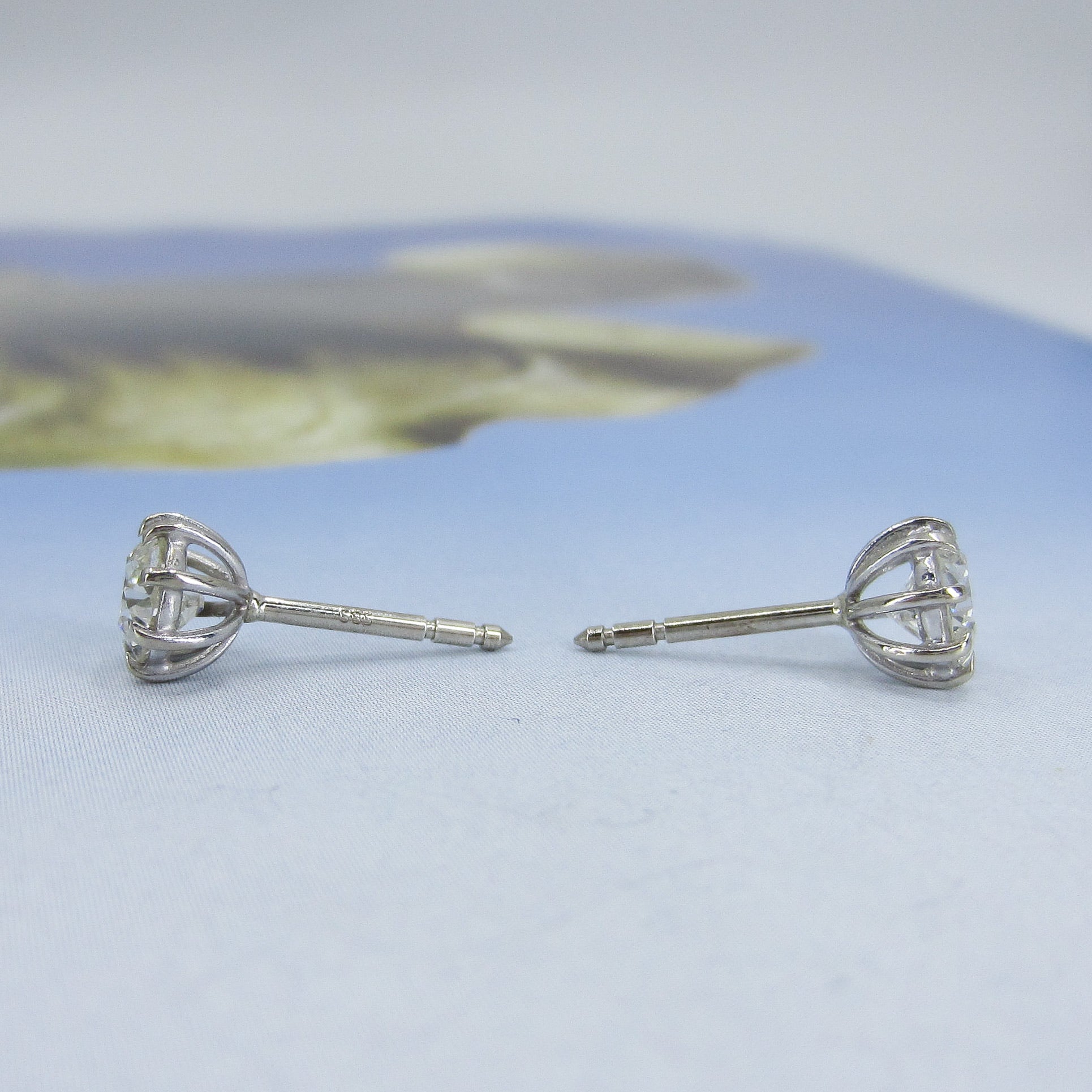 This is a classic pair of Old European Cut diamond stud earrings in 14k white gold with very high quality diamonds. Weighing in at approximately .67ct and .68ct (1.35ctw), these stones grade H-I Color and VS1-VS2 Clarity. Clean, crisp and white sparkle with tons of those old cut rainbows we all love! And they are much less prong-y in person than they look in the photos. These are the perfect size for every day wear--not too big, not too small with two very well-matched, quality Old Euros.