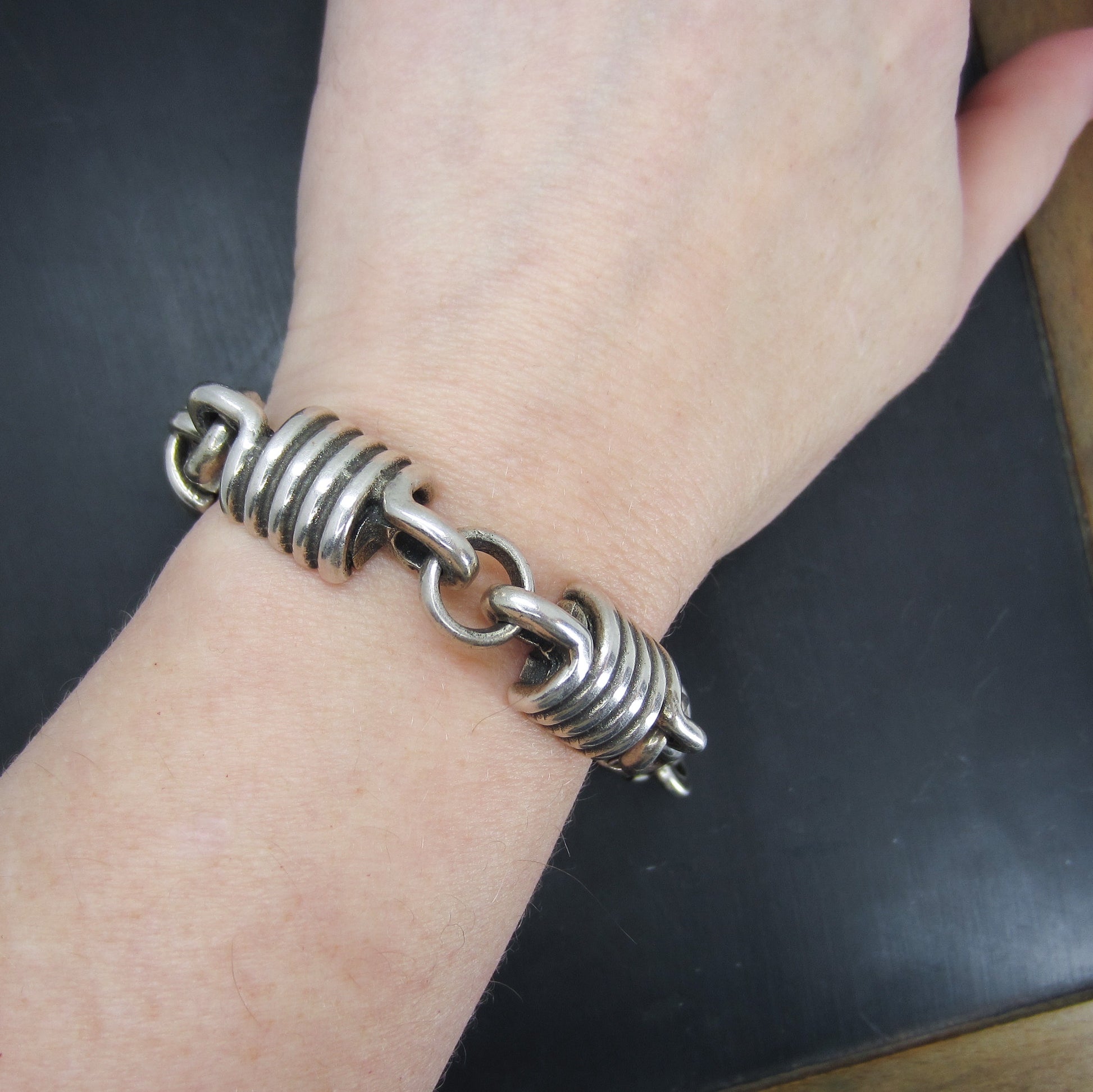 This striking bracelet is designed as a series of coiled sterling silver segments resembling springs with a really cool clasp that I will be happy to explain to the new owner haha! This is for a larger women's wrist or a men's small to medium. Circa 1990's.