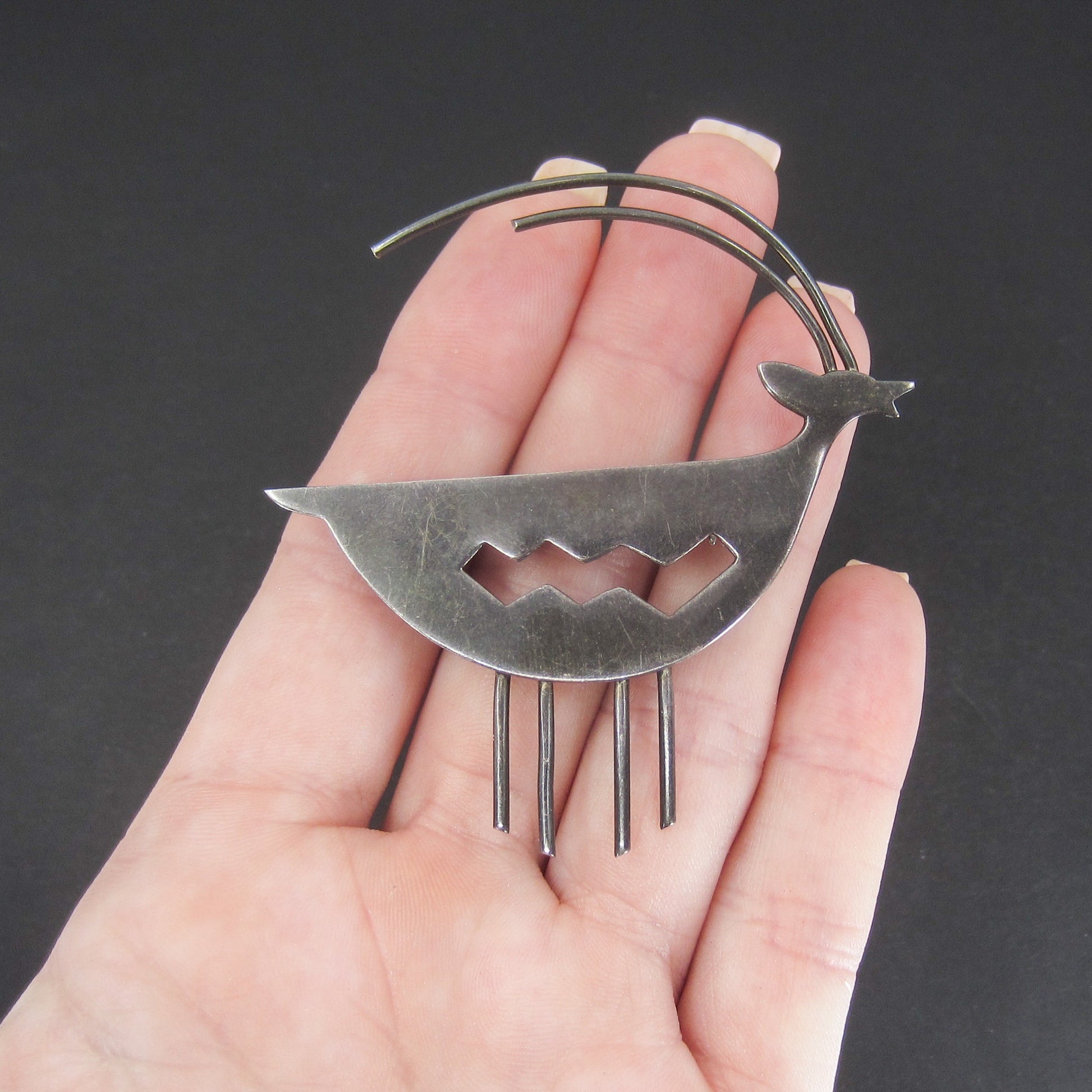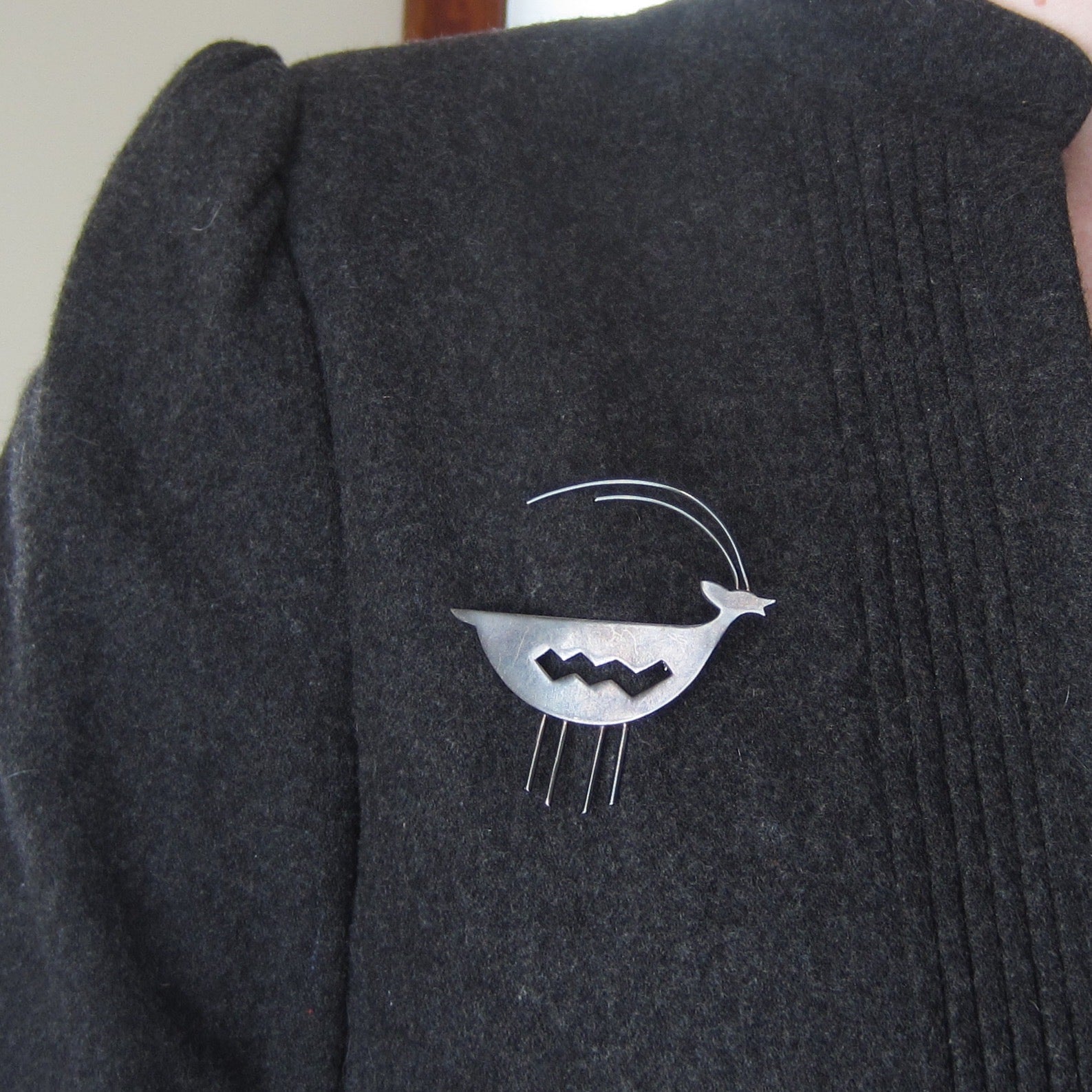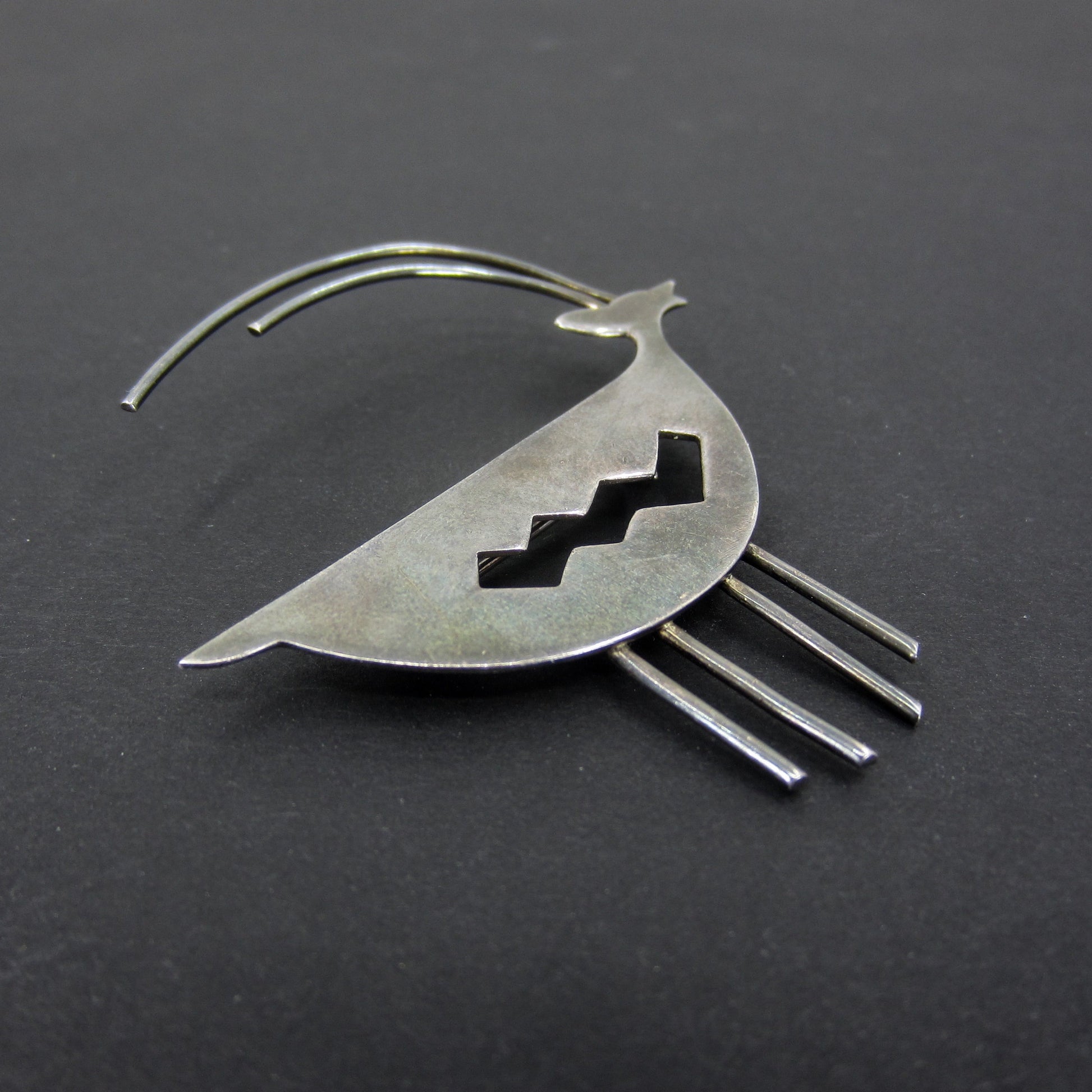 Look at this fabulous brooch! The design speaks for itself, perfectly Post-Modern in line and whimsy. Made in sterling silver by jewelry artist Phyllis Woods circa 1980.
