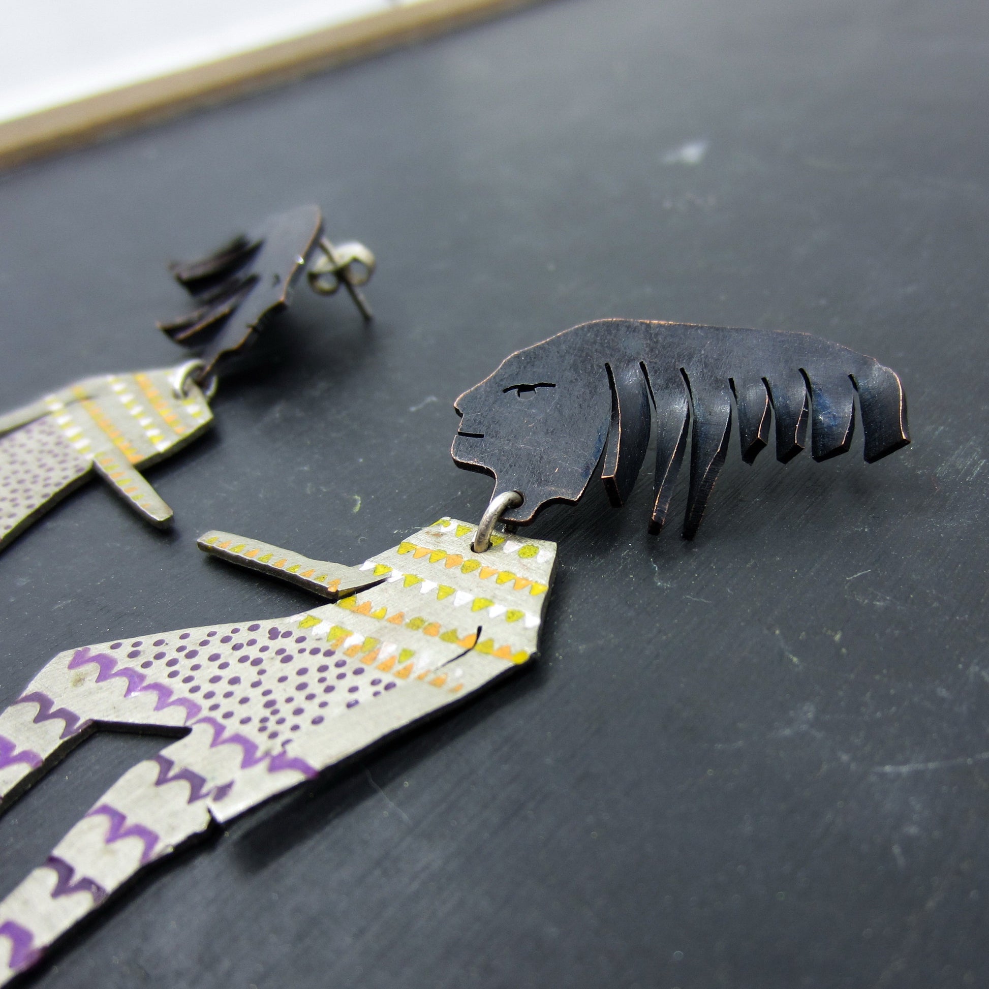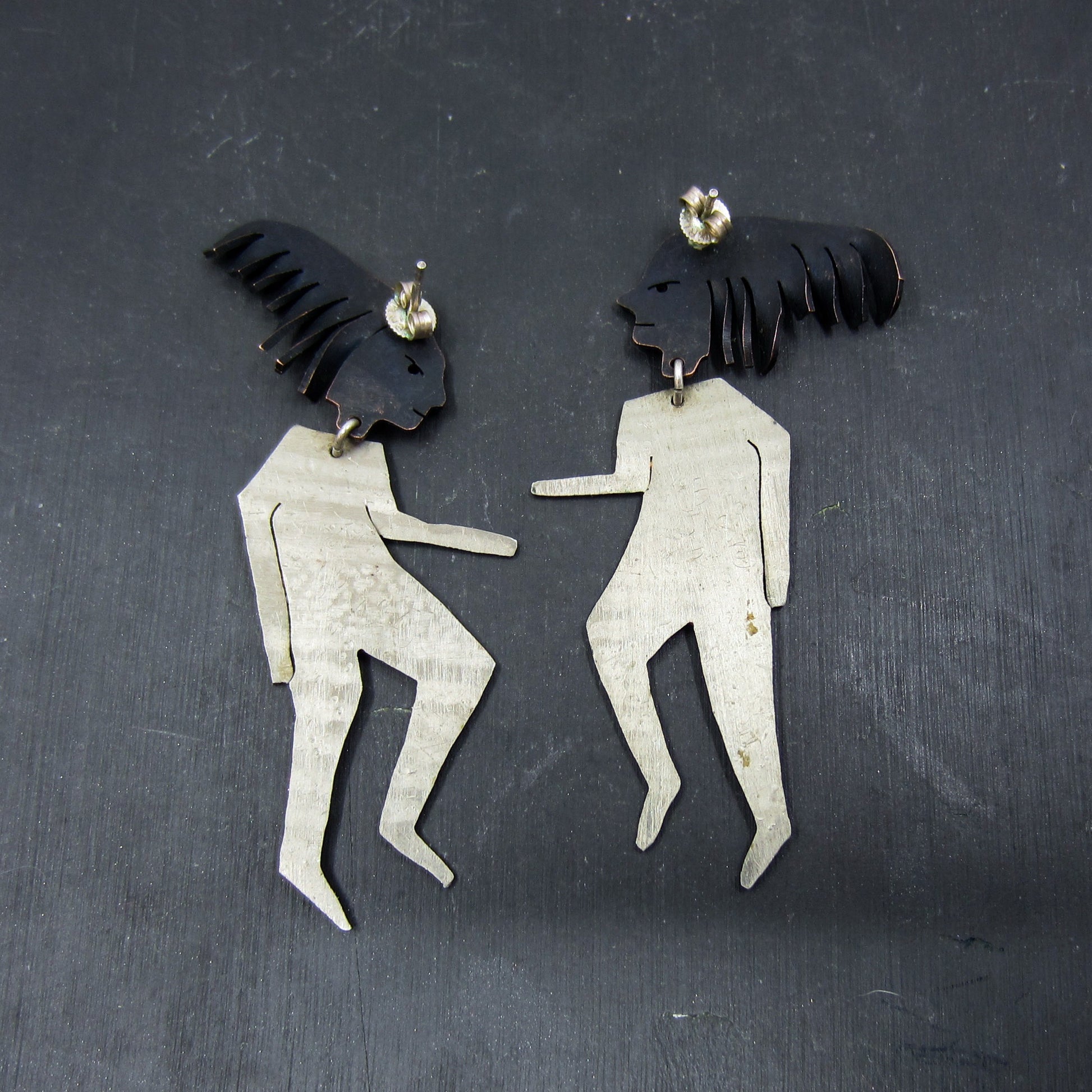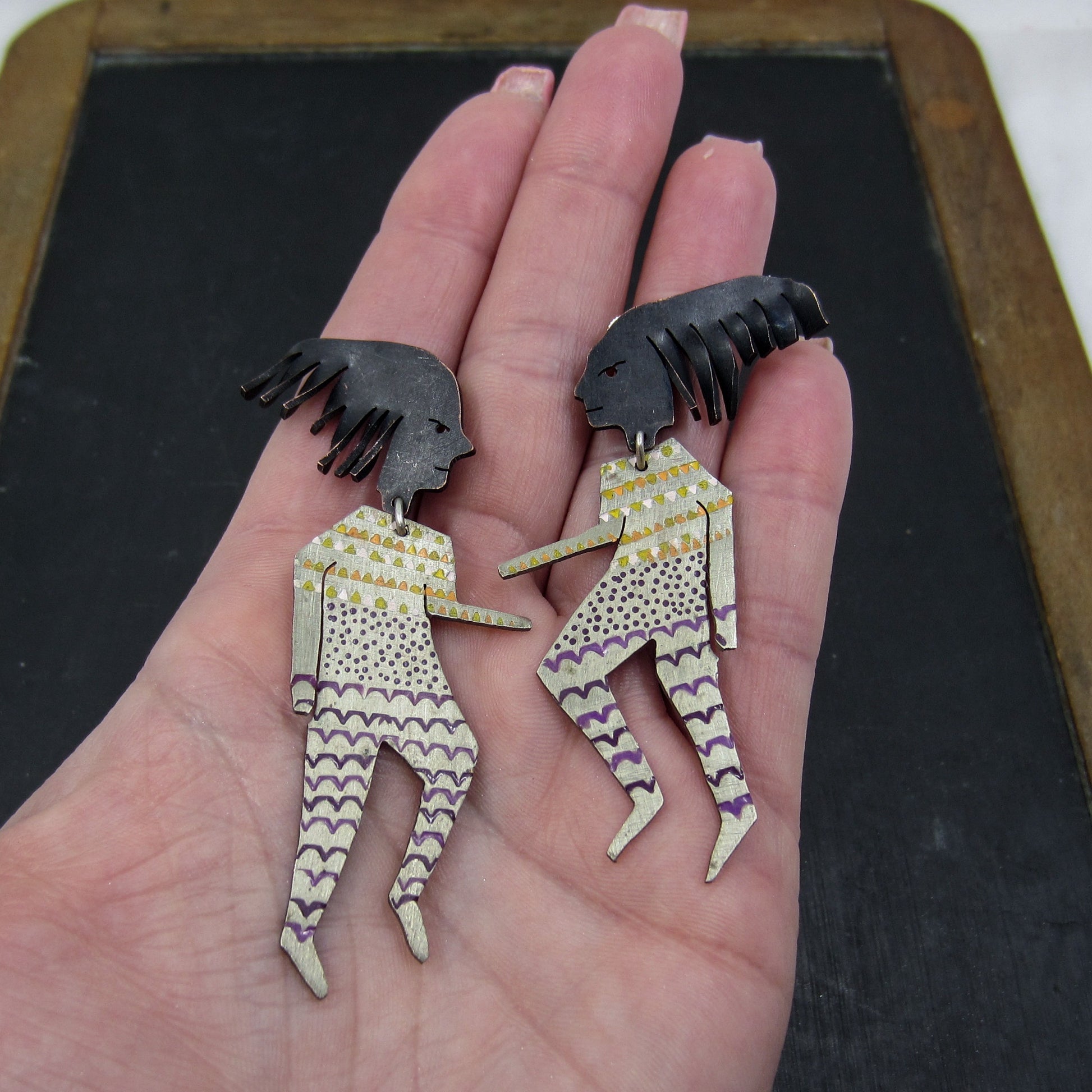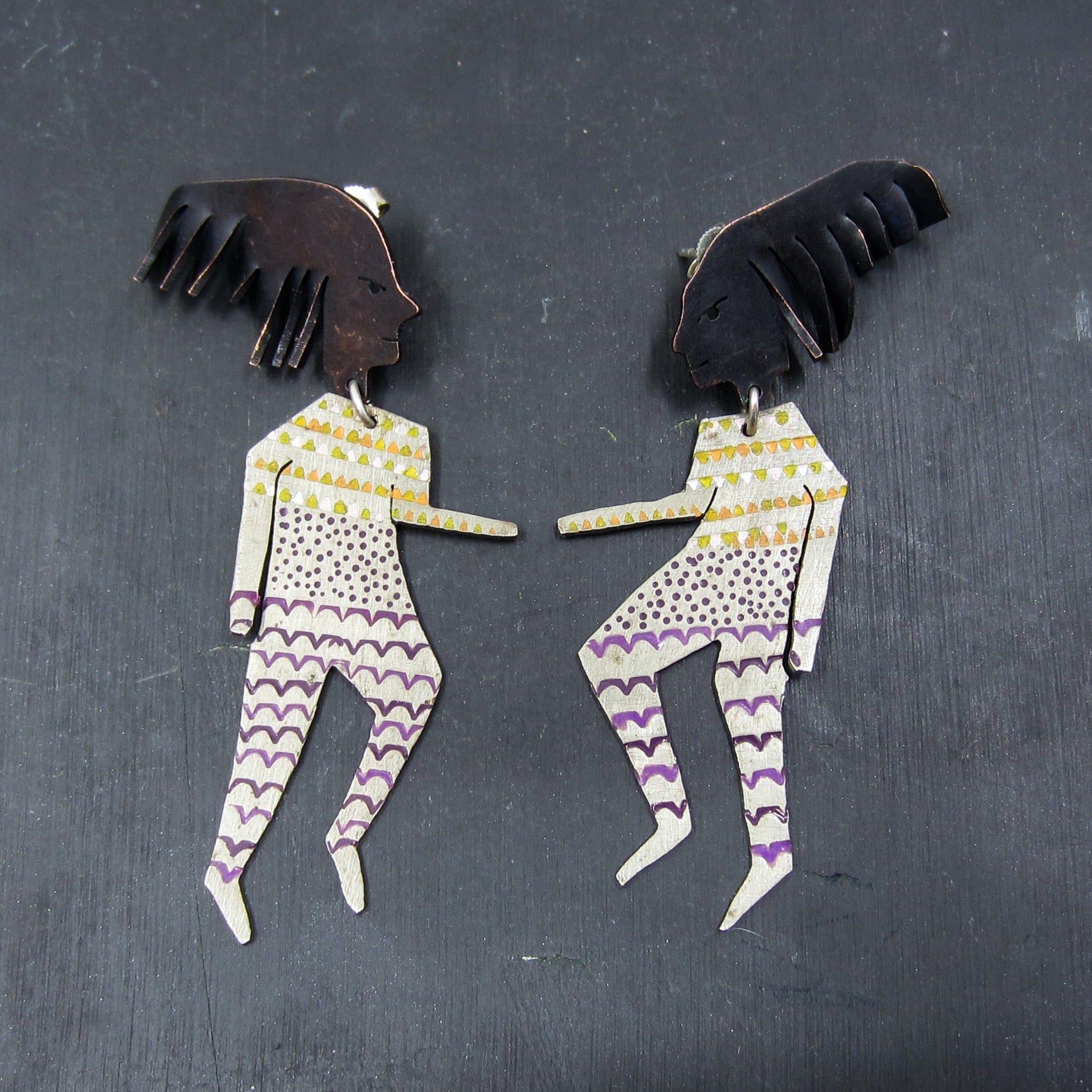 A fabulous pair of handmade artisan earrings, designed as two people with purple and yellow enamel accents. Heads are copper and bodies are aluminum. Signed for May 1989. Unknown maker's mark.