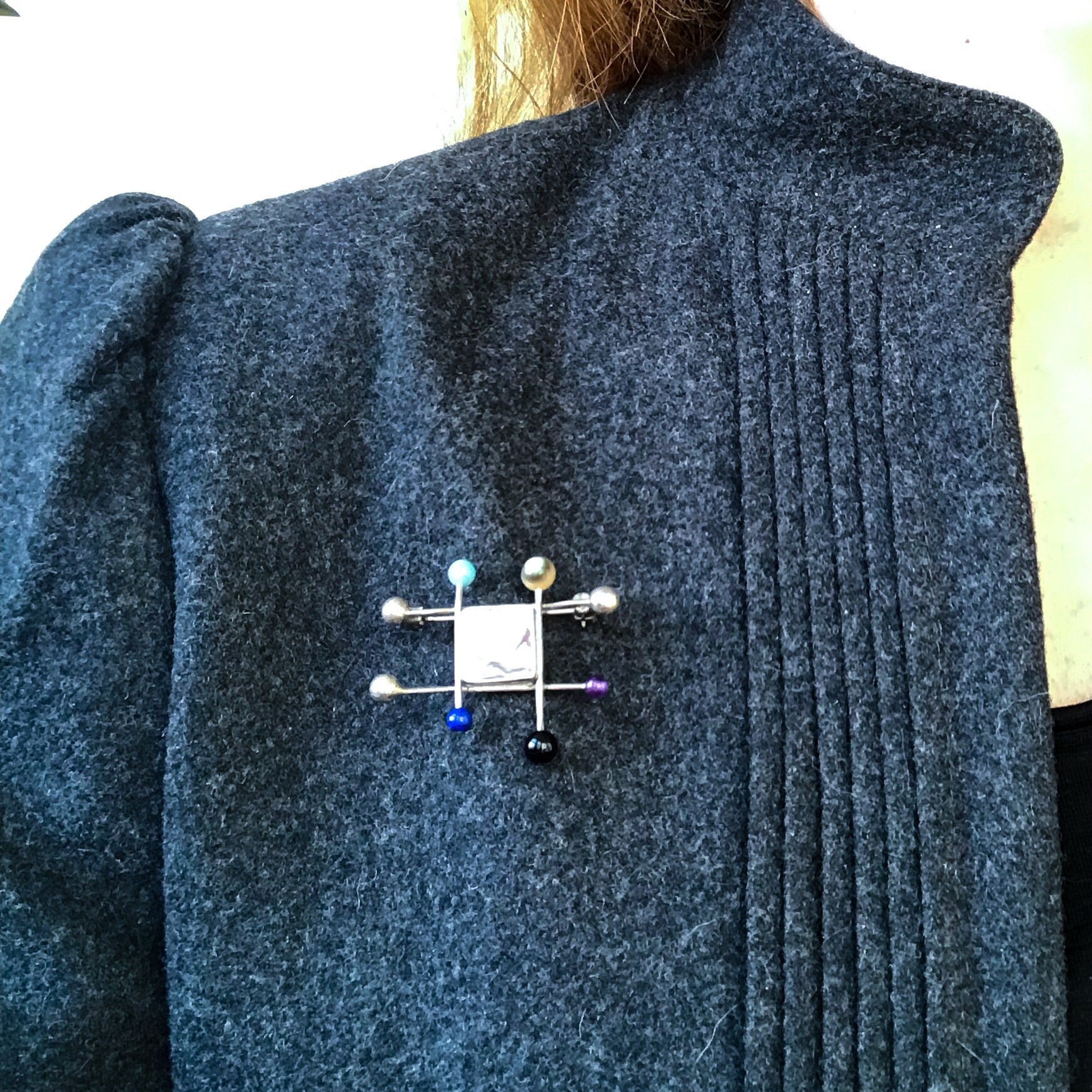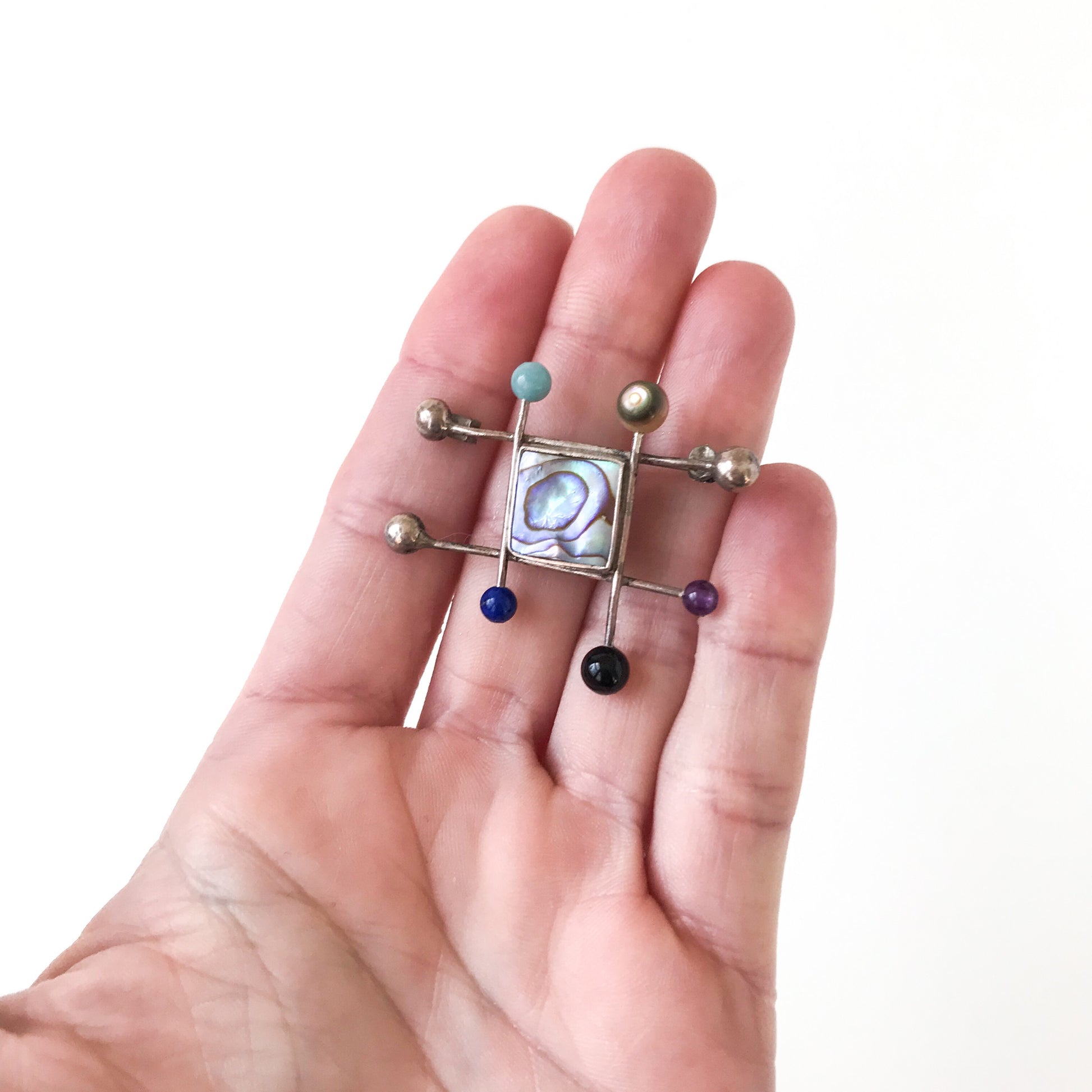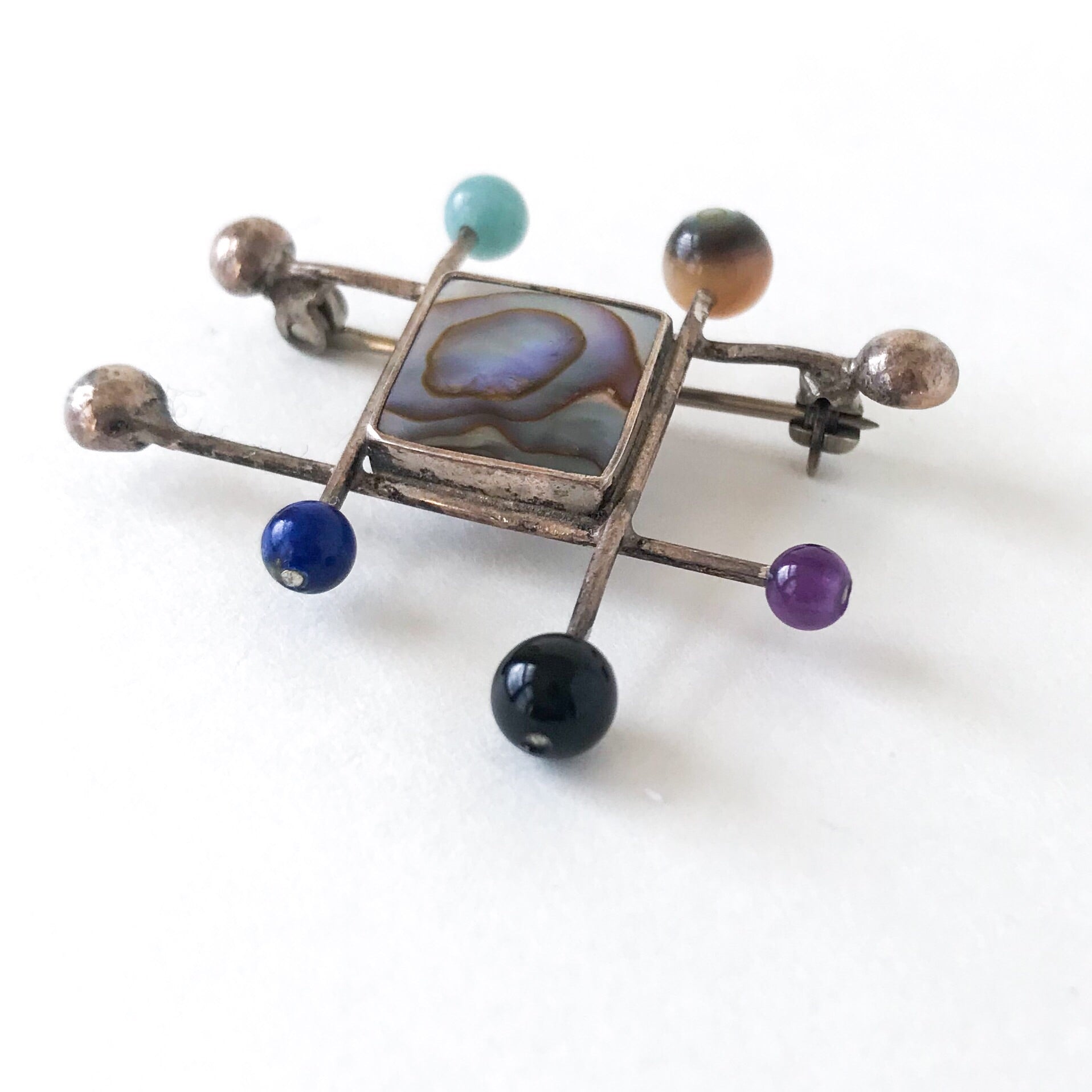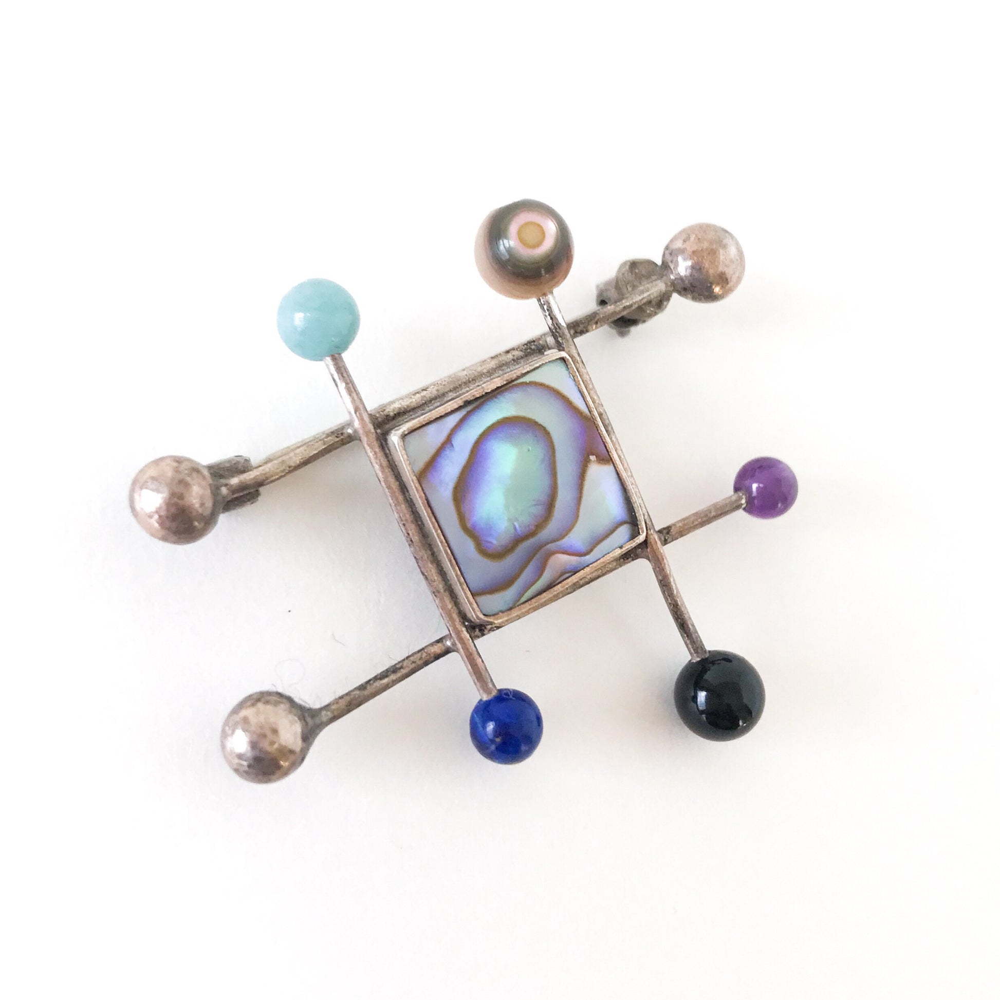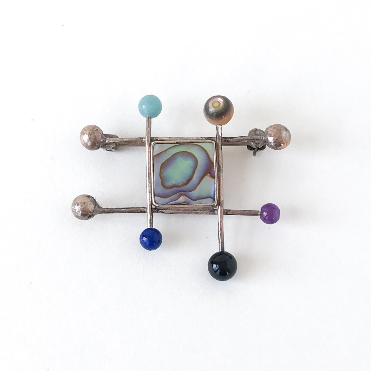 This Memphis era brooch was made by Great Falls Metalworks circa 1990. The fun geometric design features a central piece of abalone with lapis lazuli, onyx, amethyst, shell and aventurine orbs at the terminals. Graphic and interesting when worn with great pops of color!