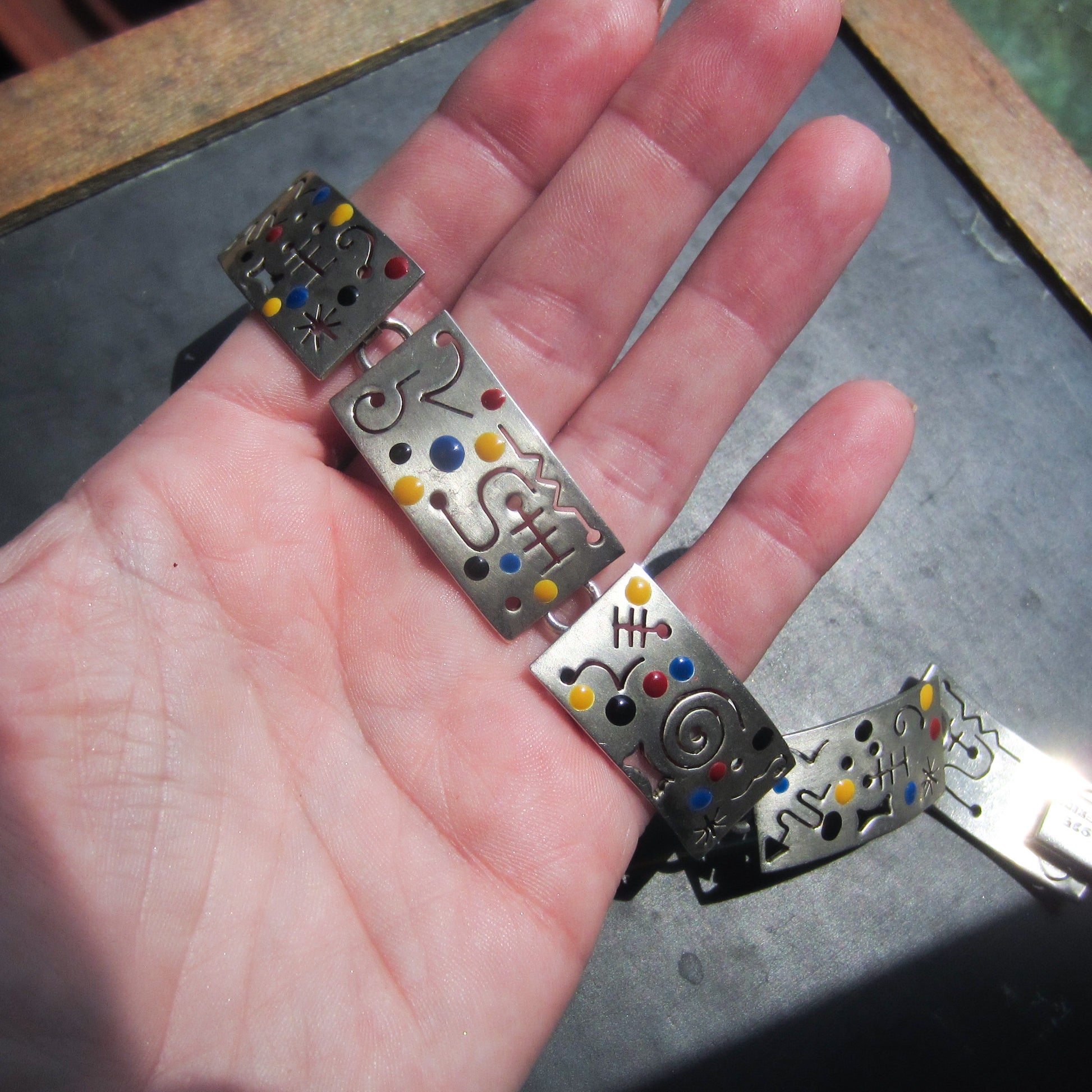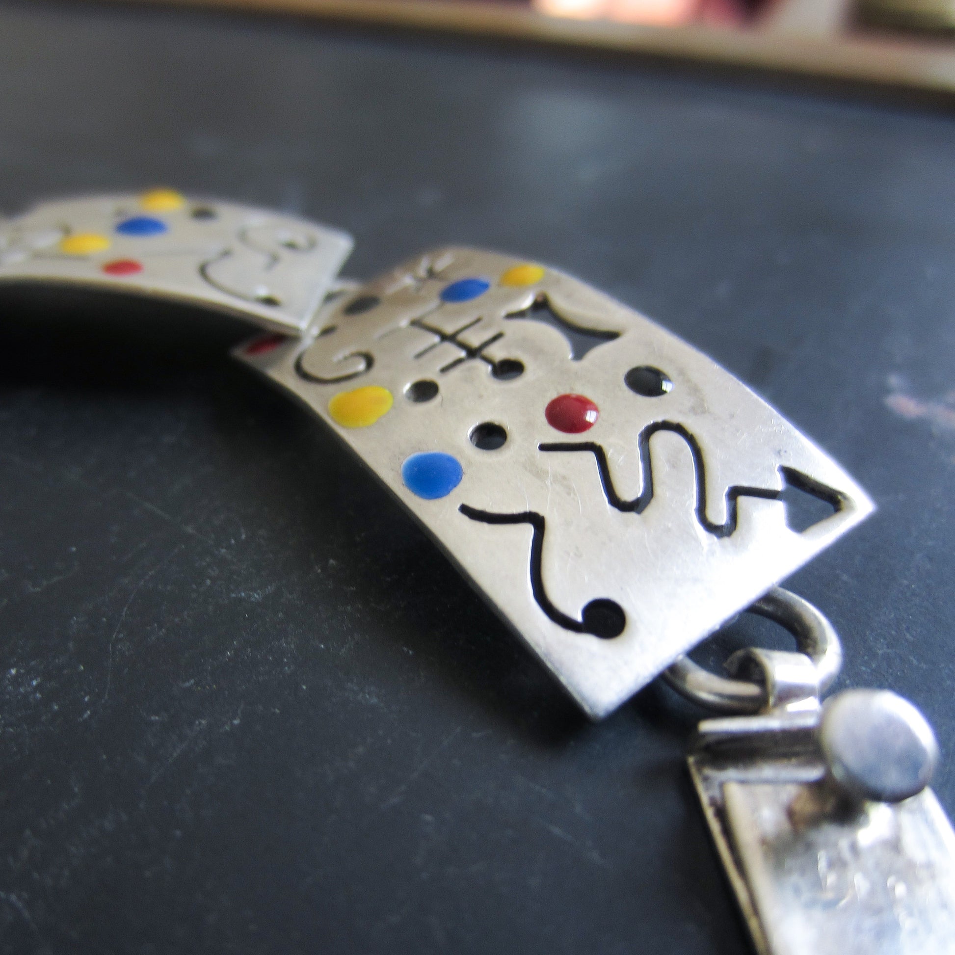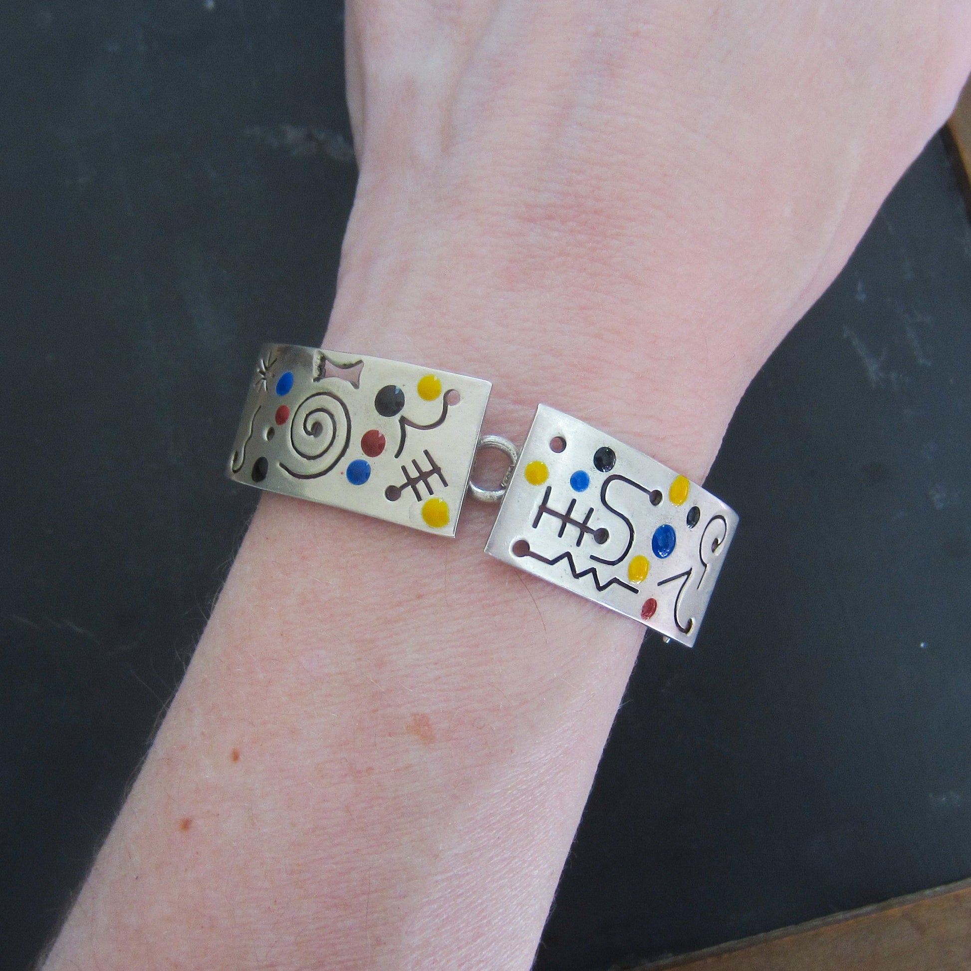 SOLD--Post-Modern Memphis Enamel Bracelet Sterling, Mexico c. 1980