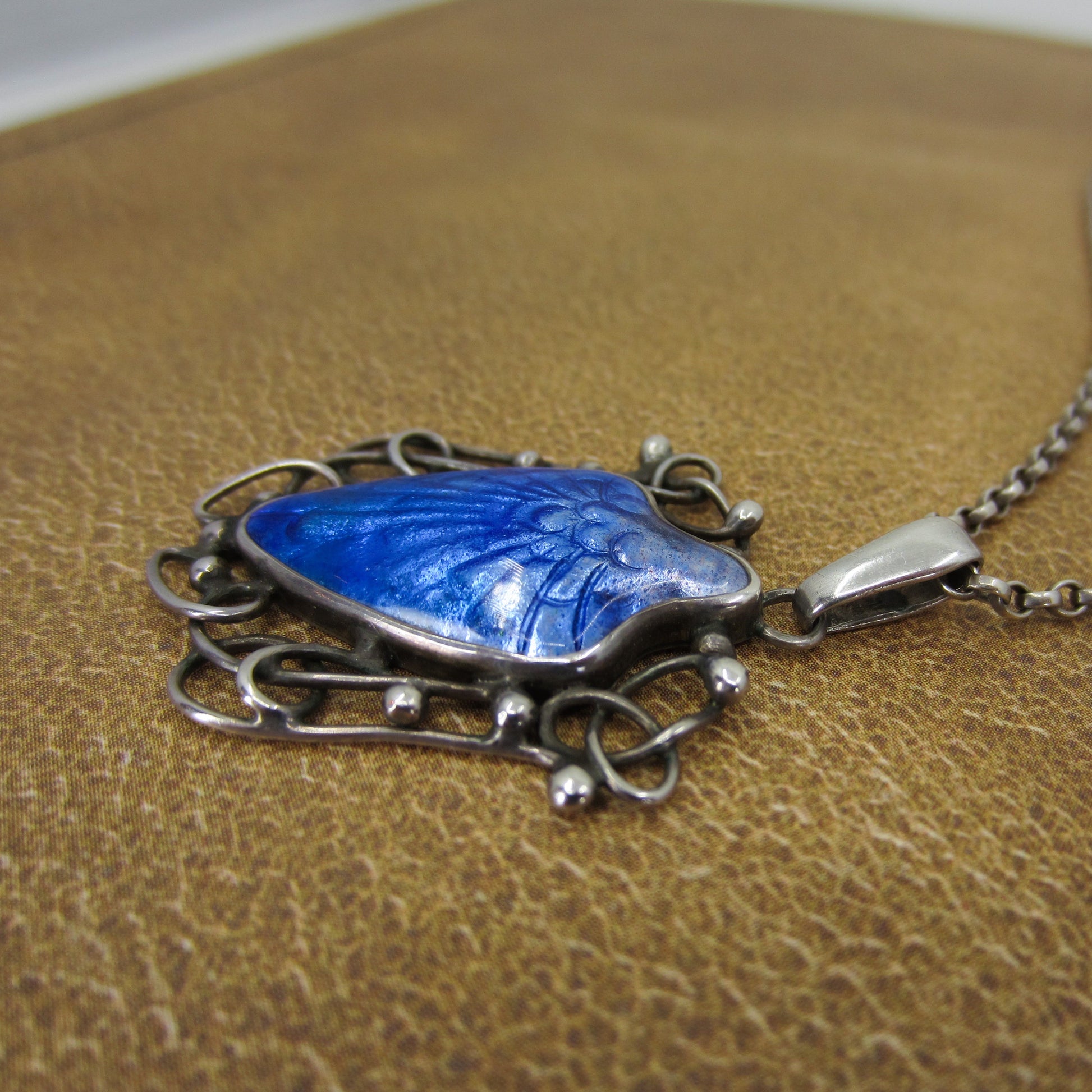 A beautiful, very rare enamel pendant from the Newlyn School, an Arts & Crafts era colony of artists in Cornwall, England who were known for their naturalistic painting and the influence of the nearby fishing village of Newlyn on their works. Some absolutely exquisite enamel came from the Newlyn School and here we have one exception example that has come from the estate of a serious Arts & Crafts collector. Please use the magnifier feature on the photos to really zoom into that enamel--the layering, the texture, the vibrance--and it is all in perfect condition! Made circa 1900 in sterling silver with an antique chain. An amazing addition to any collection!