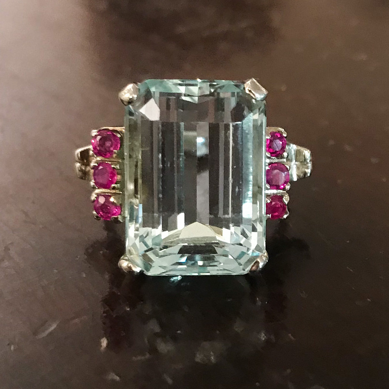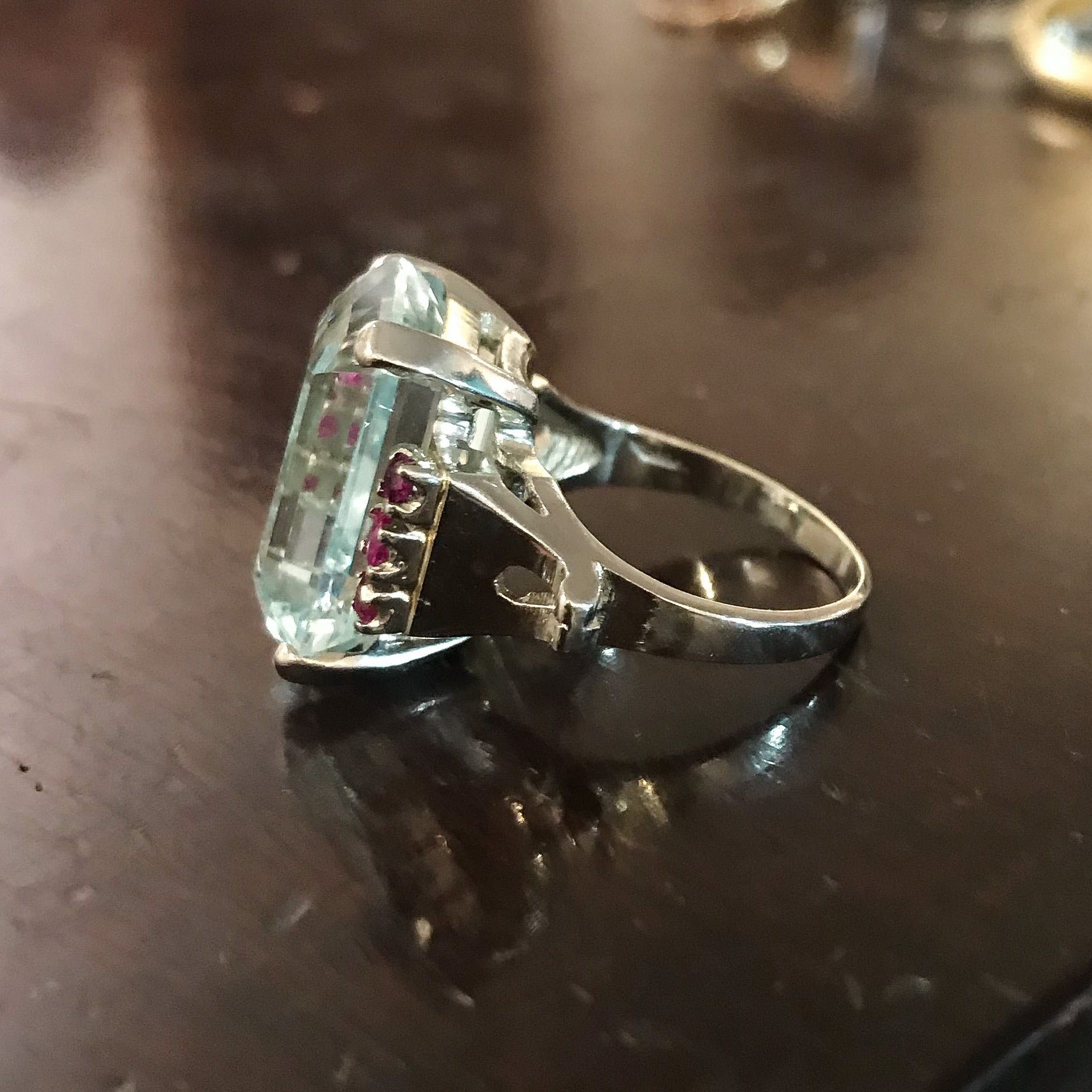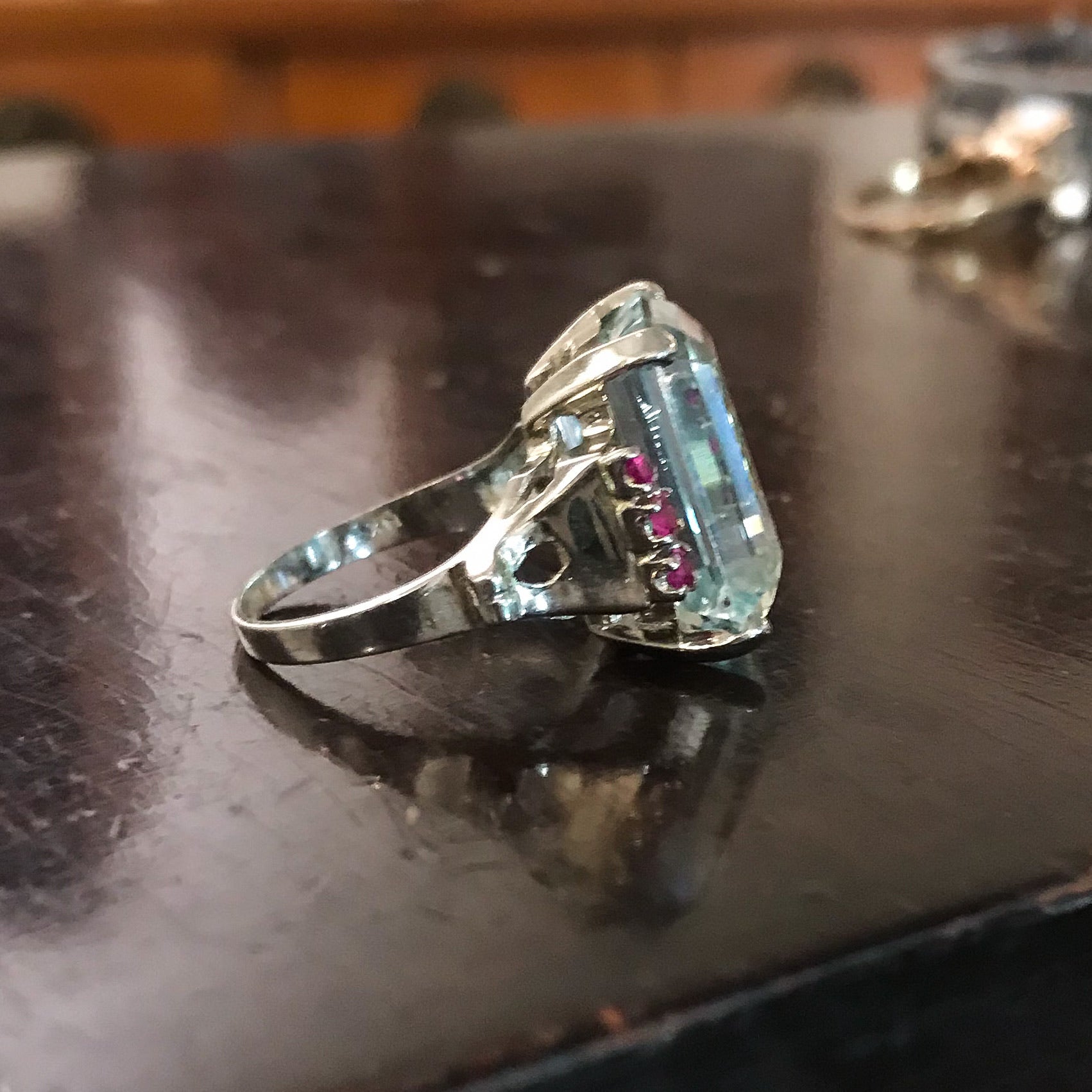 This fantastic cocktail ring from the 1940's features an icy step cut natural aquamarine weighing approximately 12ct flanked by a row of round cut natural rubies on either side, in an architectural 14k white gold mounting. This stone is cut beautifully and has great sparkle, which you don't always find on these bigger aquas. A true Retro Old Hollywood period ring with great color!