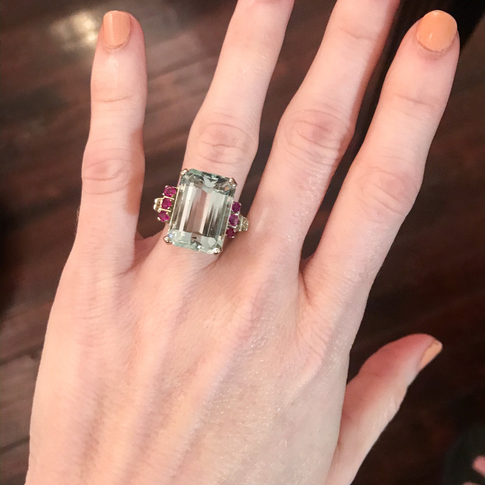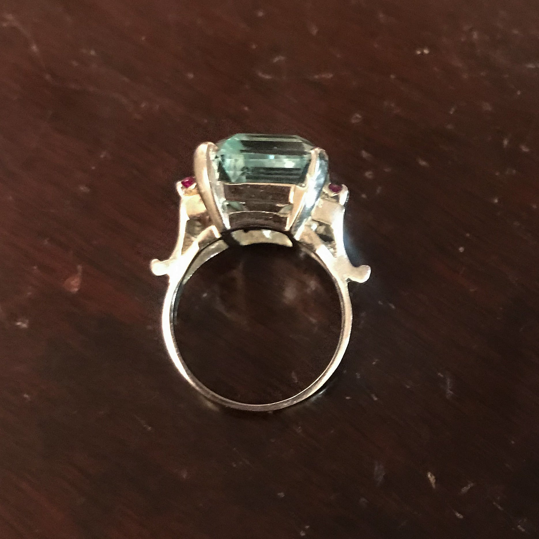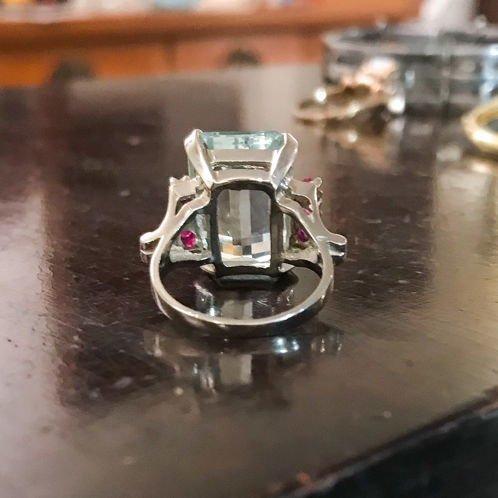 This fantastic cocktail ring from the 1940's features an icy step cut natural aquamarine weighing approximately 12ct flanked by a row of round cut natural rubies on either side, in an architectural 14k white gold mounting. This stone is cut beautifully and has great sparkle, which you don't always find on these bigger aquas. A true Retro Old Hollywood period ring with great color!