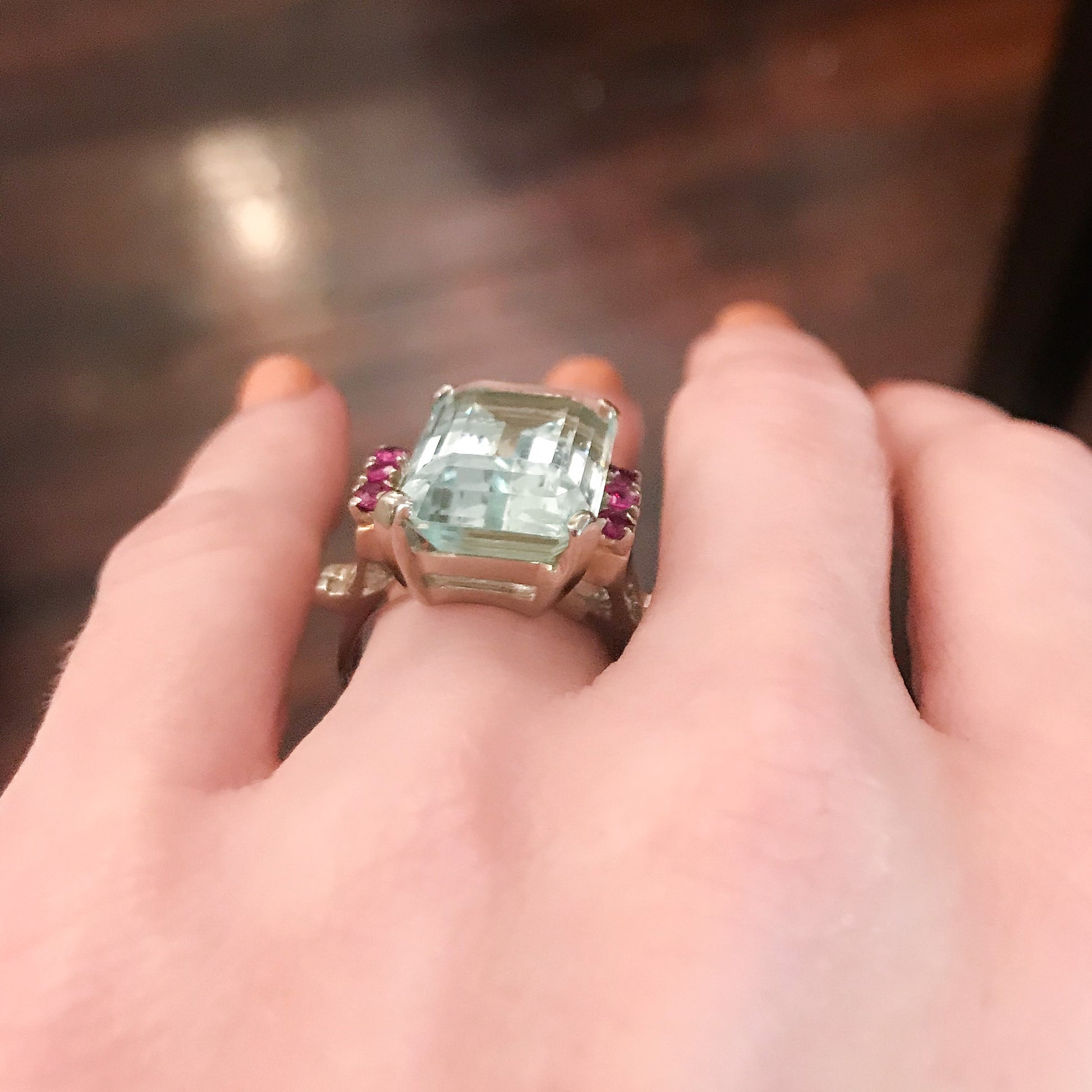 SOLD--Retro Aquamarine and Ruby Ring 14k c. 1940