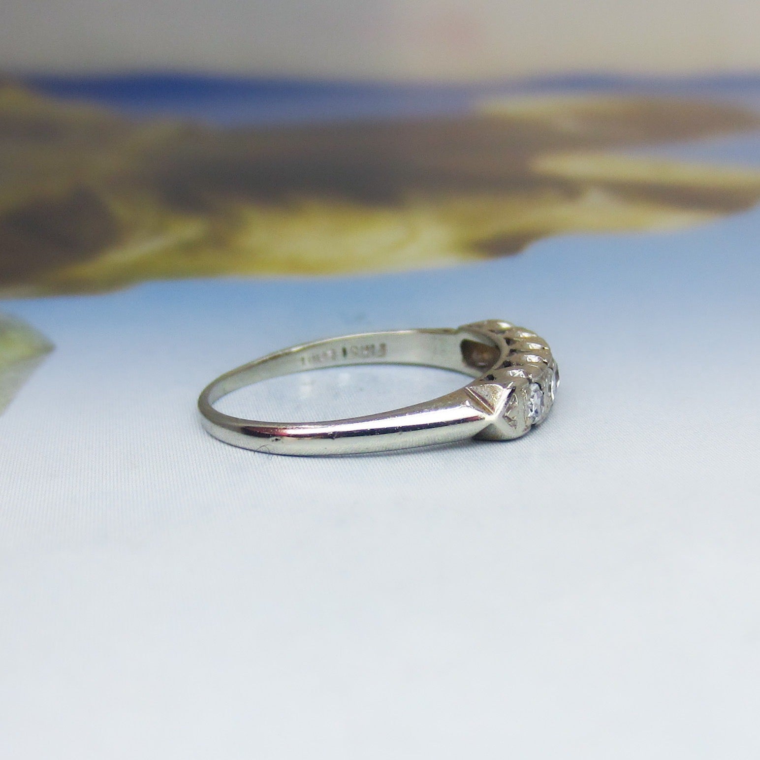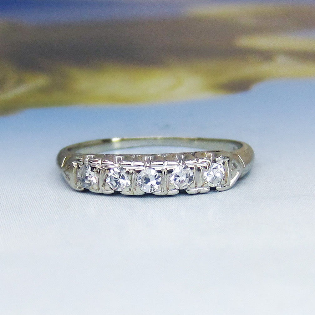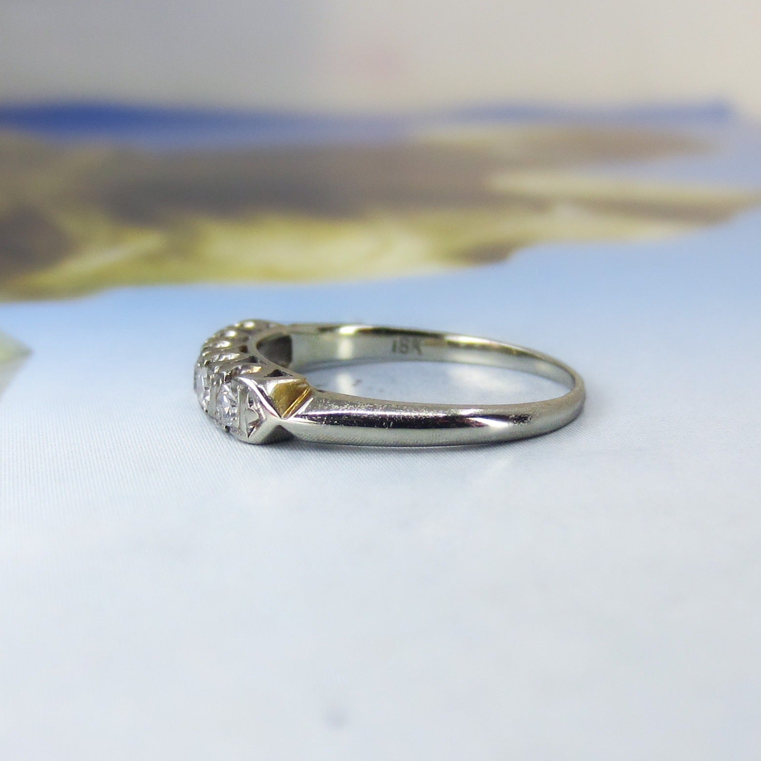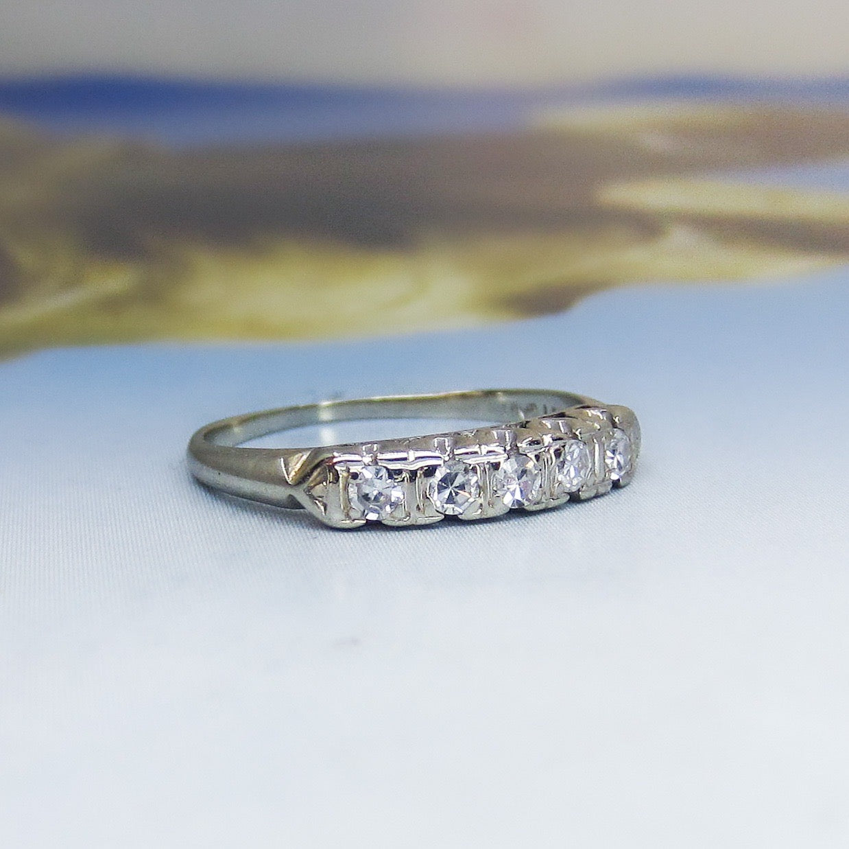 This is a nicely designed 18k white gold band from the late Deco/Retro period of the 1940's, featuring five Single Cut diamonds fishtail set in their own little boxes with an interesting shoulder detail and slight knife edge on the band. Overall it makes for a very elegant and balanced look that allows this band to stand on it's own for the wearer who wants to just wear one ring!