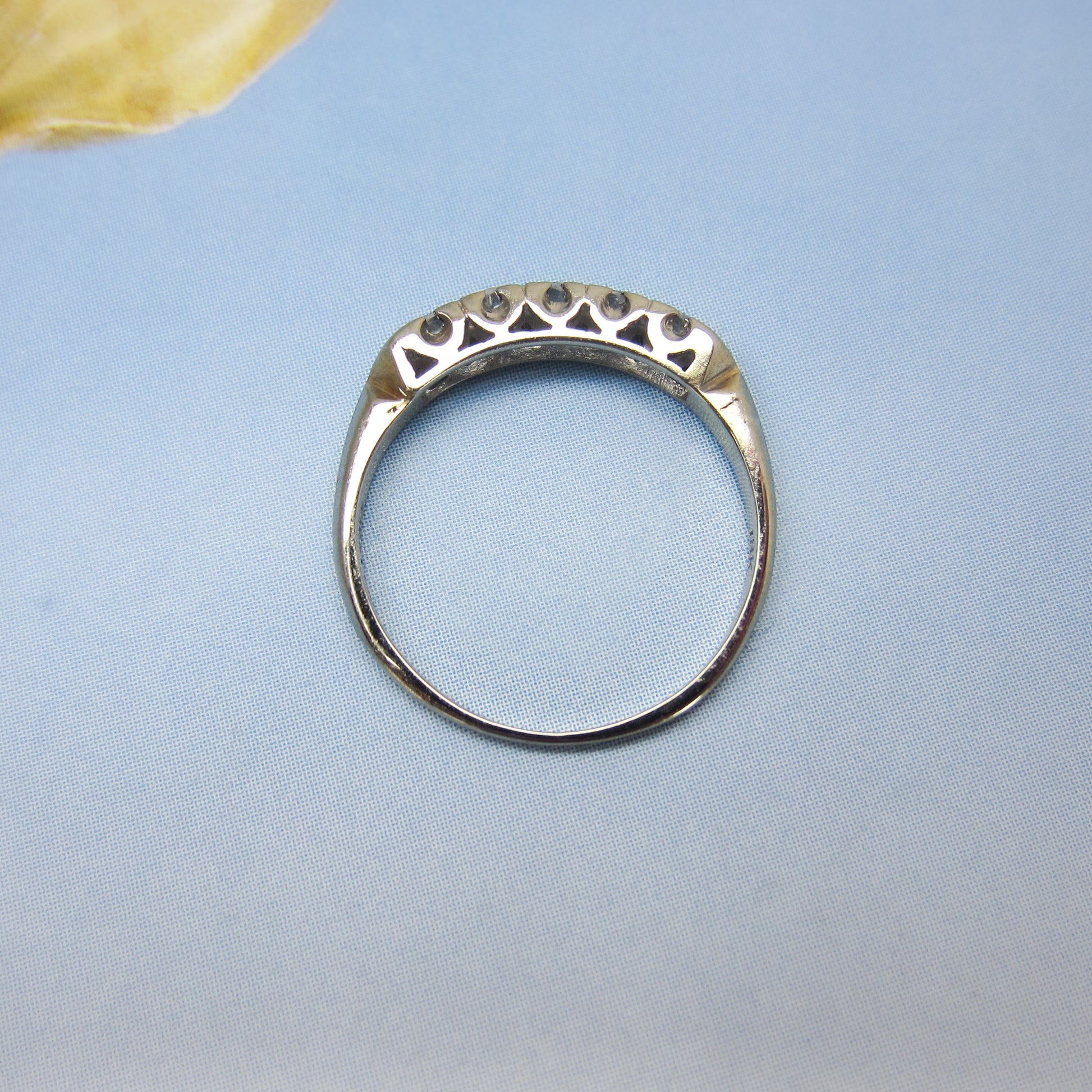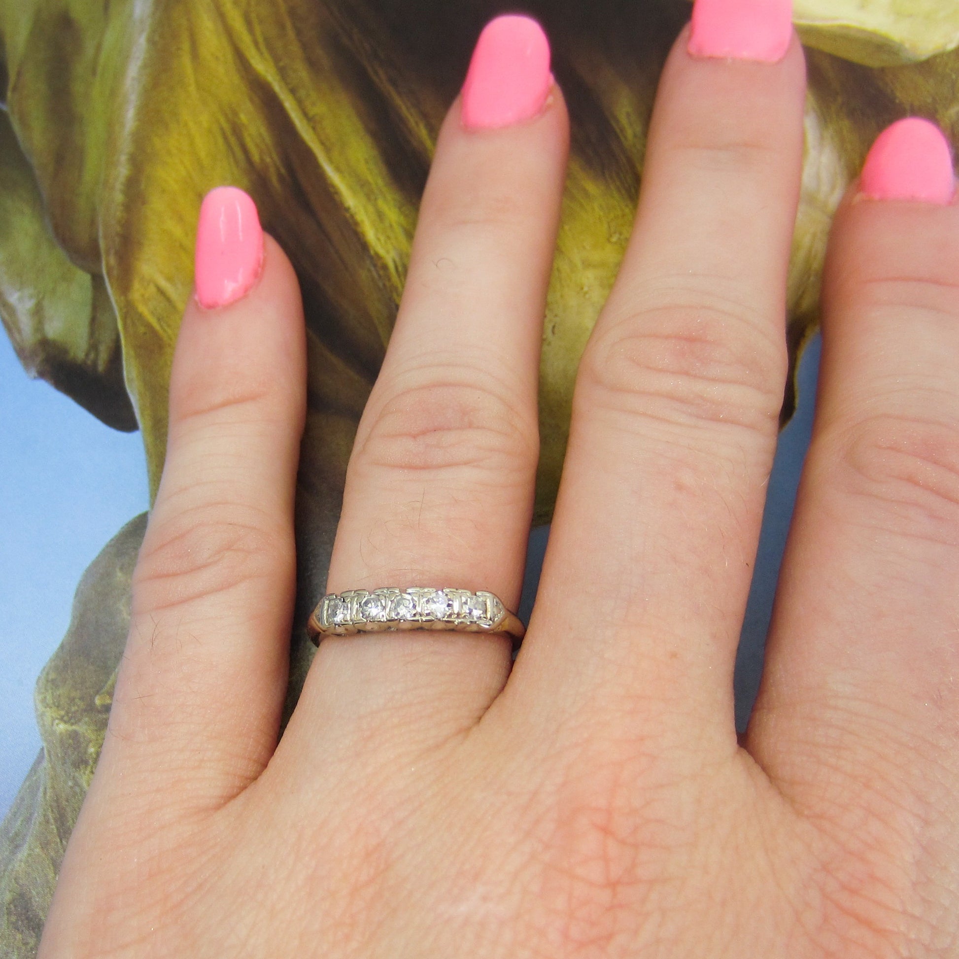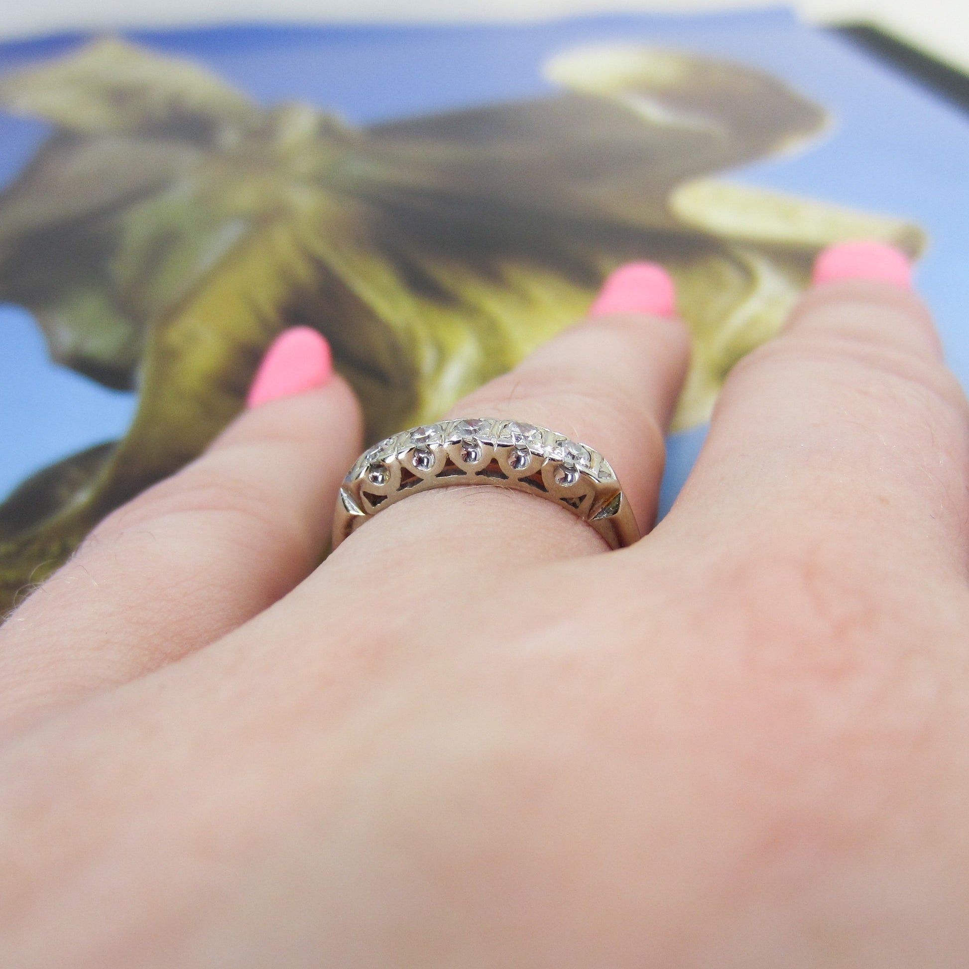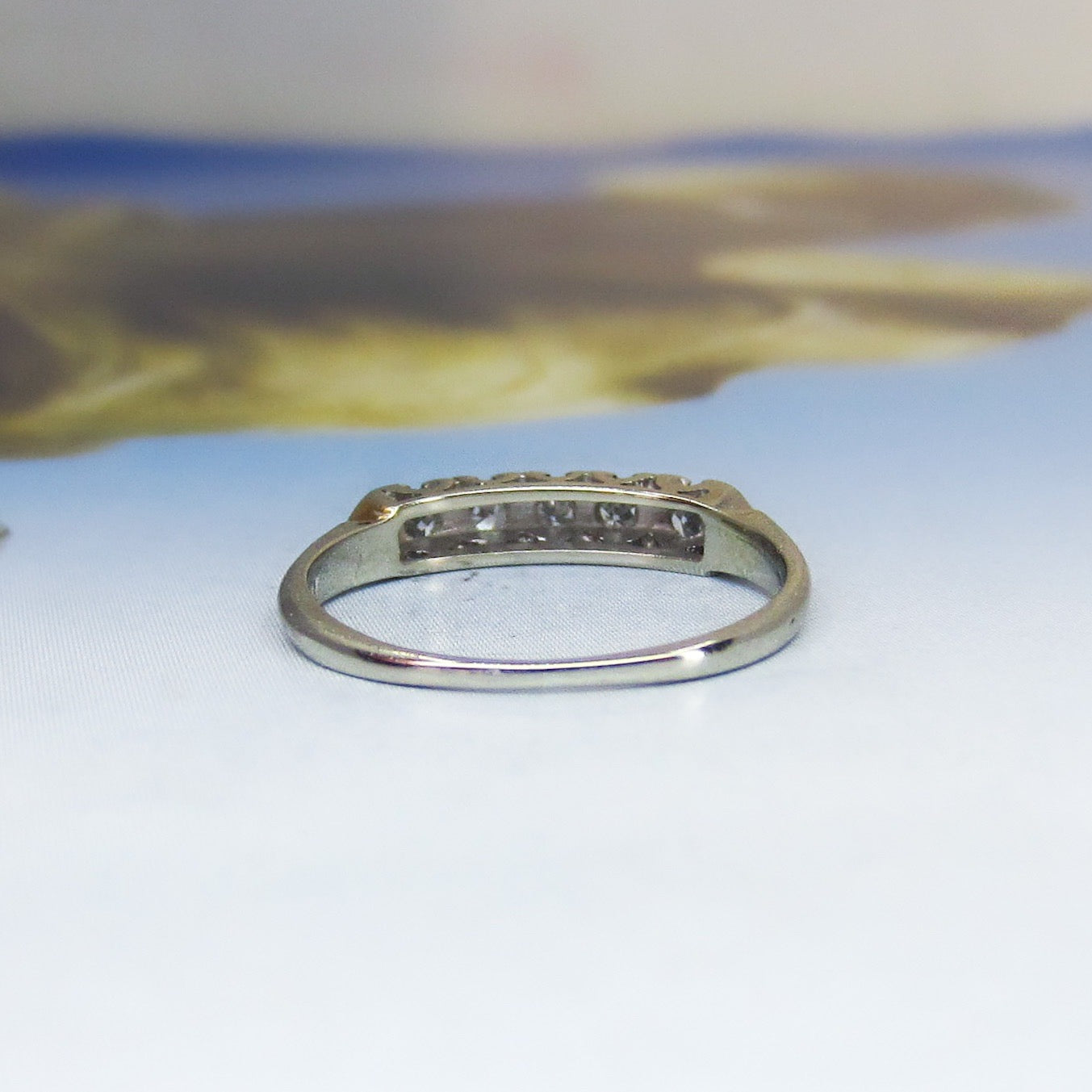 This is a nicely designed 18k white gold band from the late Deco/Retro period of the 1940's, featuring five Single Cut diamonds fishtail set in their own little boxes with an interesting shoulder detail and slight knife edge on the band. Overall it makes for a very elegant and balanced look that allows this band to stand on it's own for the wearer who wants to just wear one ring!