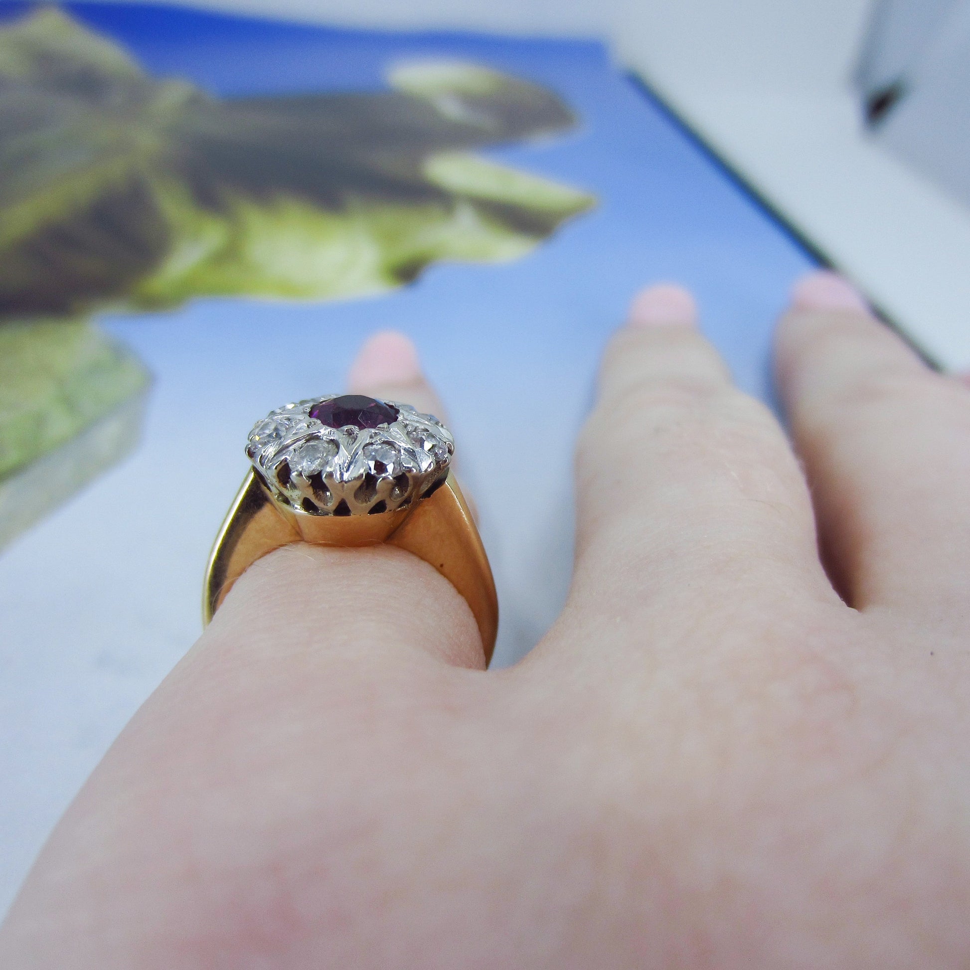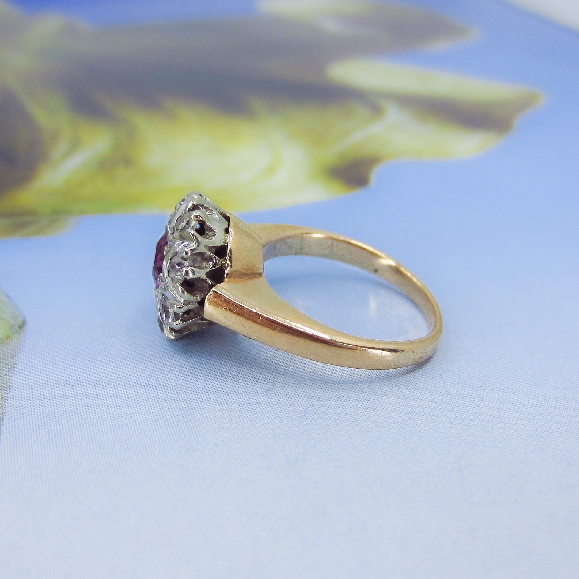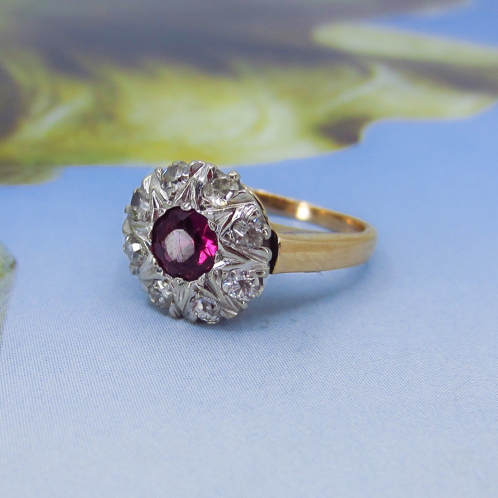 This is a beautiful antique cluster ring at a great price—made cIrca 1920, this Art Deco era ring features a rhodolite garnet center surrounded by a frame of antique single cut diamonds in 14k white and yellow gold. It’s currently a tiny size 2.75 but don’t let that throw you off—this ring would make a gorgeous engagement ring!