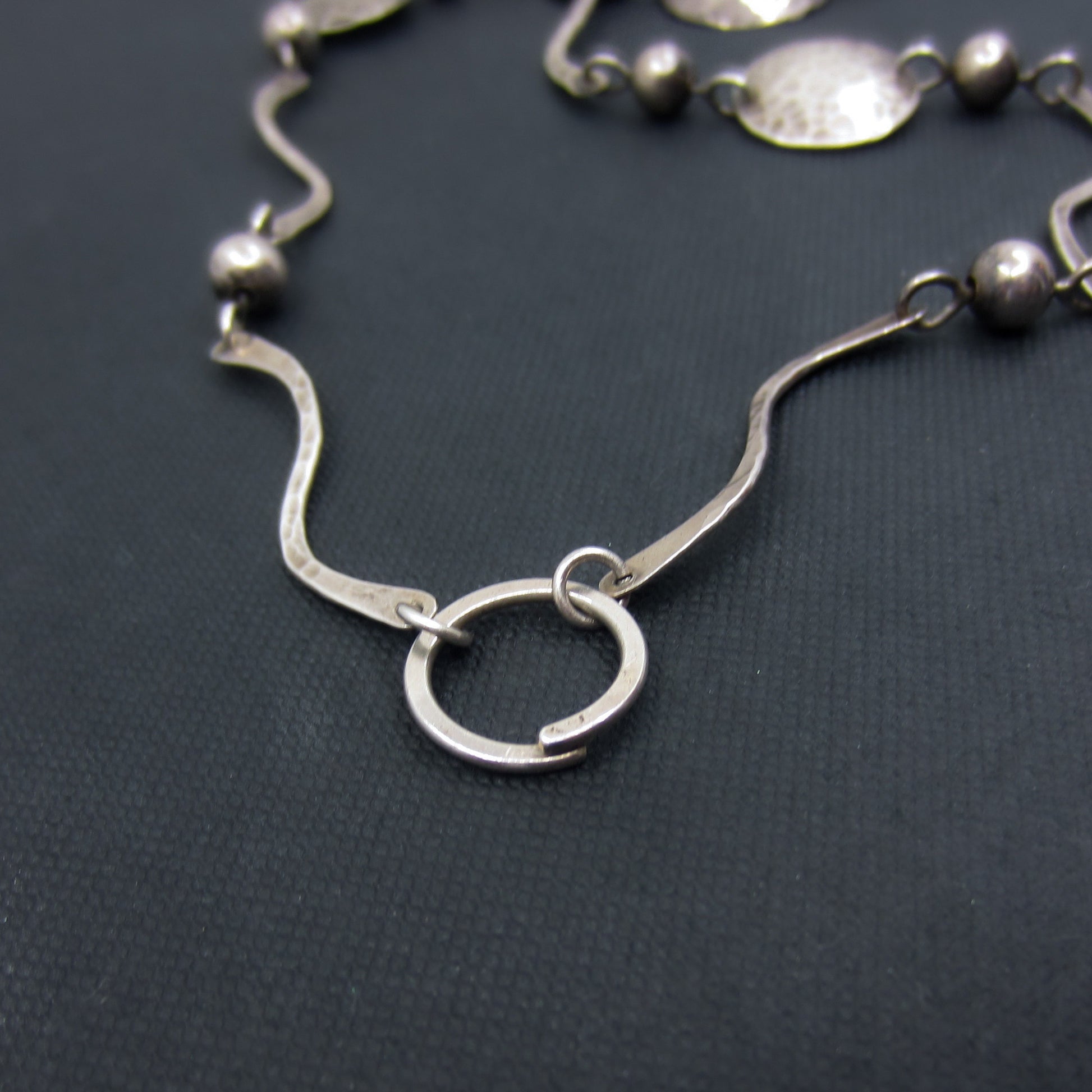 This fab Modernist necklace circa 1960's is most likely a studio piece and has hand worked and hammered alternating disc and squiggle links. Very striking on and beautifully made!