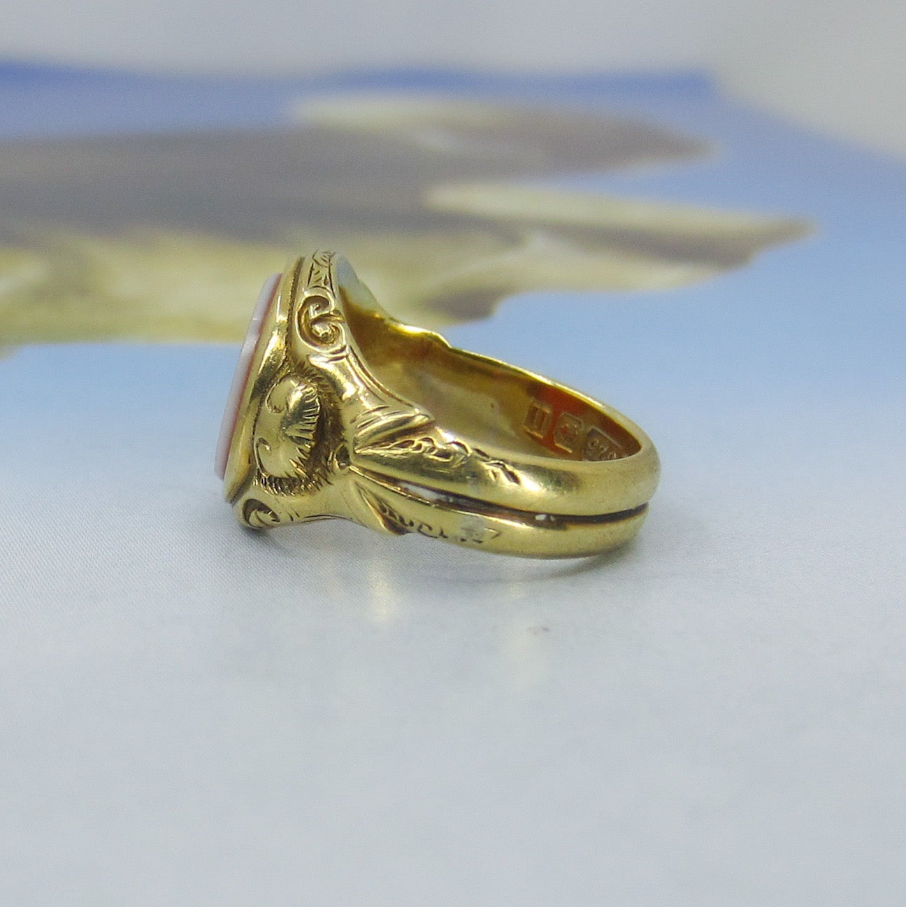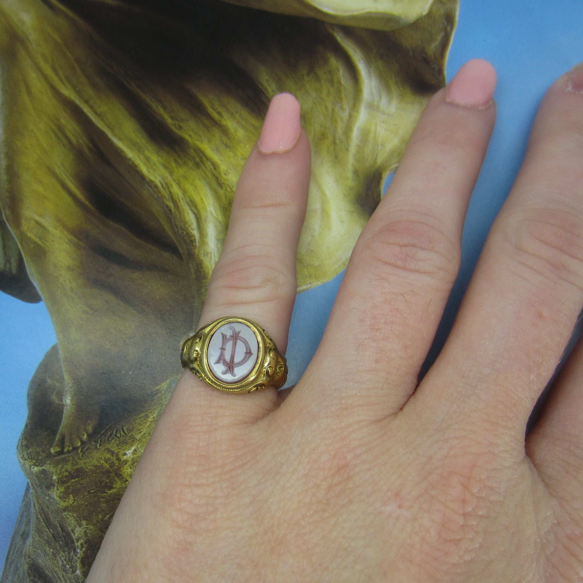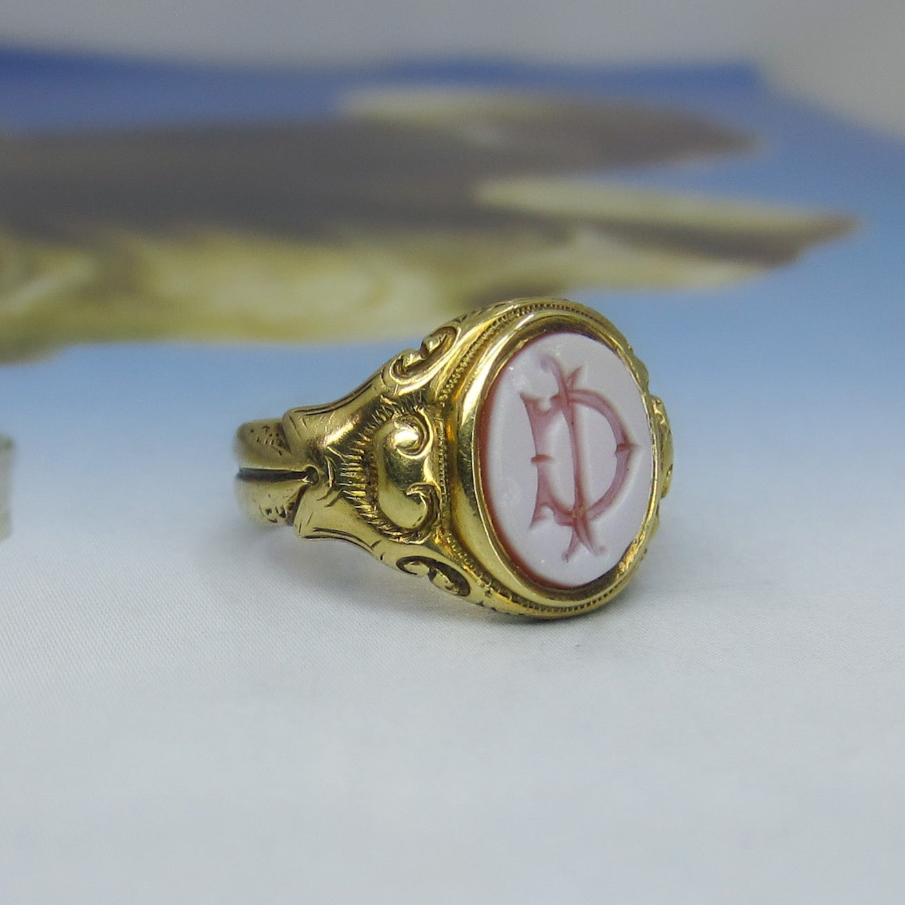 This Victorian ring holds a central monogram intaglio carved in hardstone and set in an ornate, heavy 15k yellow gold setting. This little beauty is fully hallmarked for Birmingham, England 1887 and has never been resized. It's tiny and special, a true little historical piece!