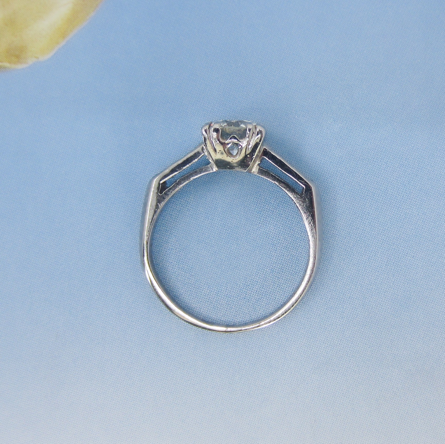 If you want a classic 1940's Deco engagement ring, it doesn't get any better than this! Set with a glorious central Round Brilliant Cut diamond weighing approximately .76ct and flanked with six Round Brilliant Cut side diamonds. This diamond is round but set to look square with split prongs, which is a hallmark of later Deco rings and gives a clean, angular look while maintaining some of the more ornate Deco details. It is the perfect size for any hand, sits low and is in amazing condition. Gorgeous!