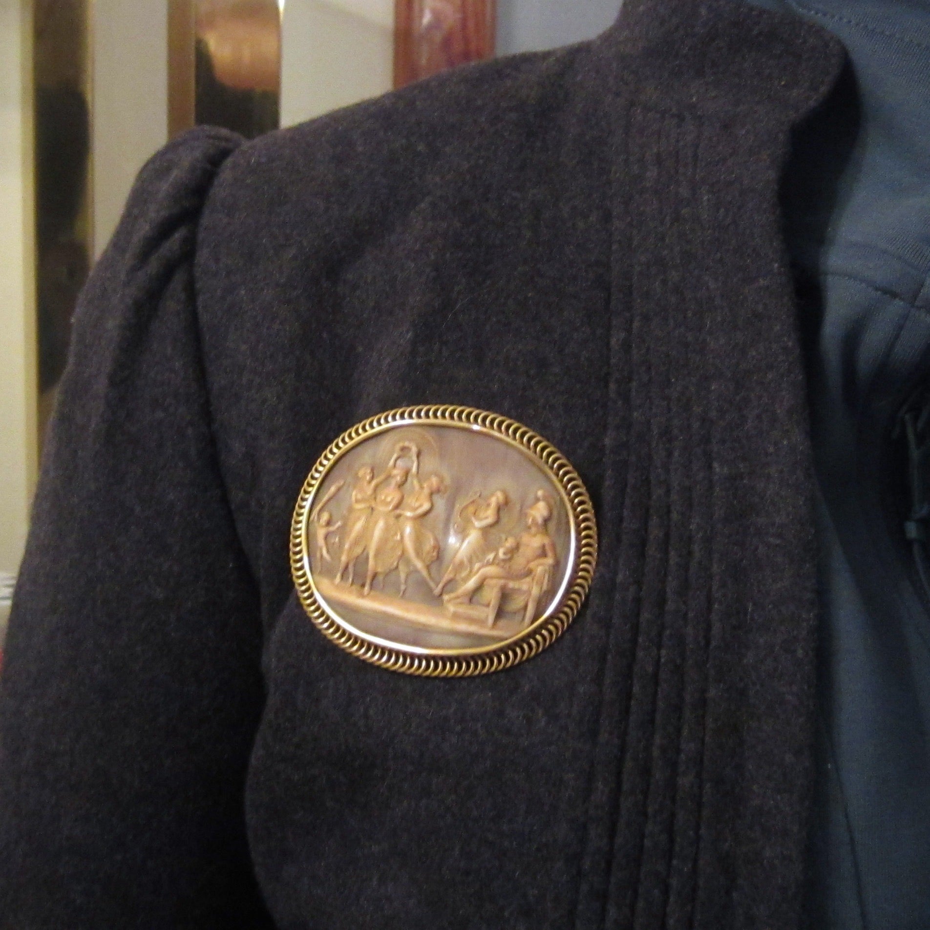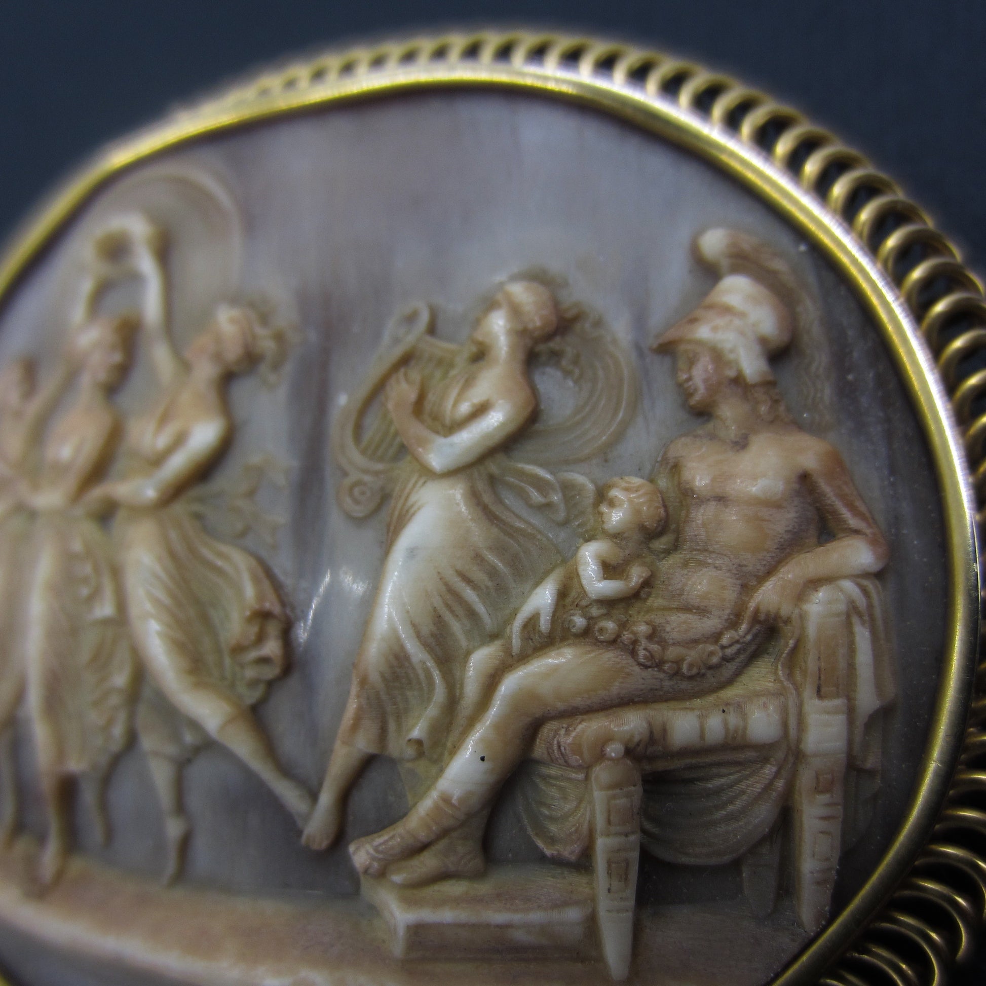 The sheer size of this amazing vintage cameo is enough to make it a special piece, but the carving, the color and the frame are all so beautifully done that it is instantly memorable. Made circa 1940, the artist has carved what appears to be the Three Graces dancing, but I'm not sure of the other characters and I don't like to guess. If anyone has an idea of what this cameo depicts please feel free to write to or chat with me! The artist has used the layers of the shell to perfection and it gives the piece a look as if the figures are lit by candlelight. The frame is comprised of closely packed loops of 14k rosier yellow gold. It is GORGEOUS in person and if you like it, come see it!