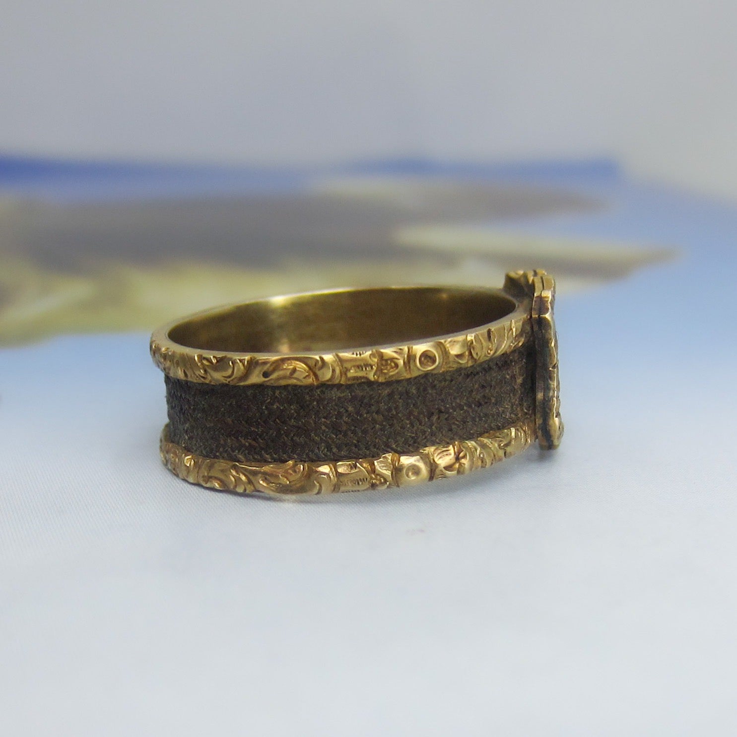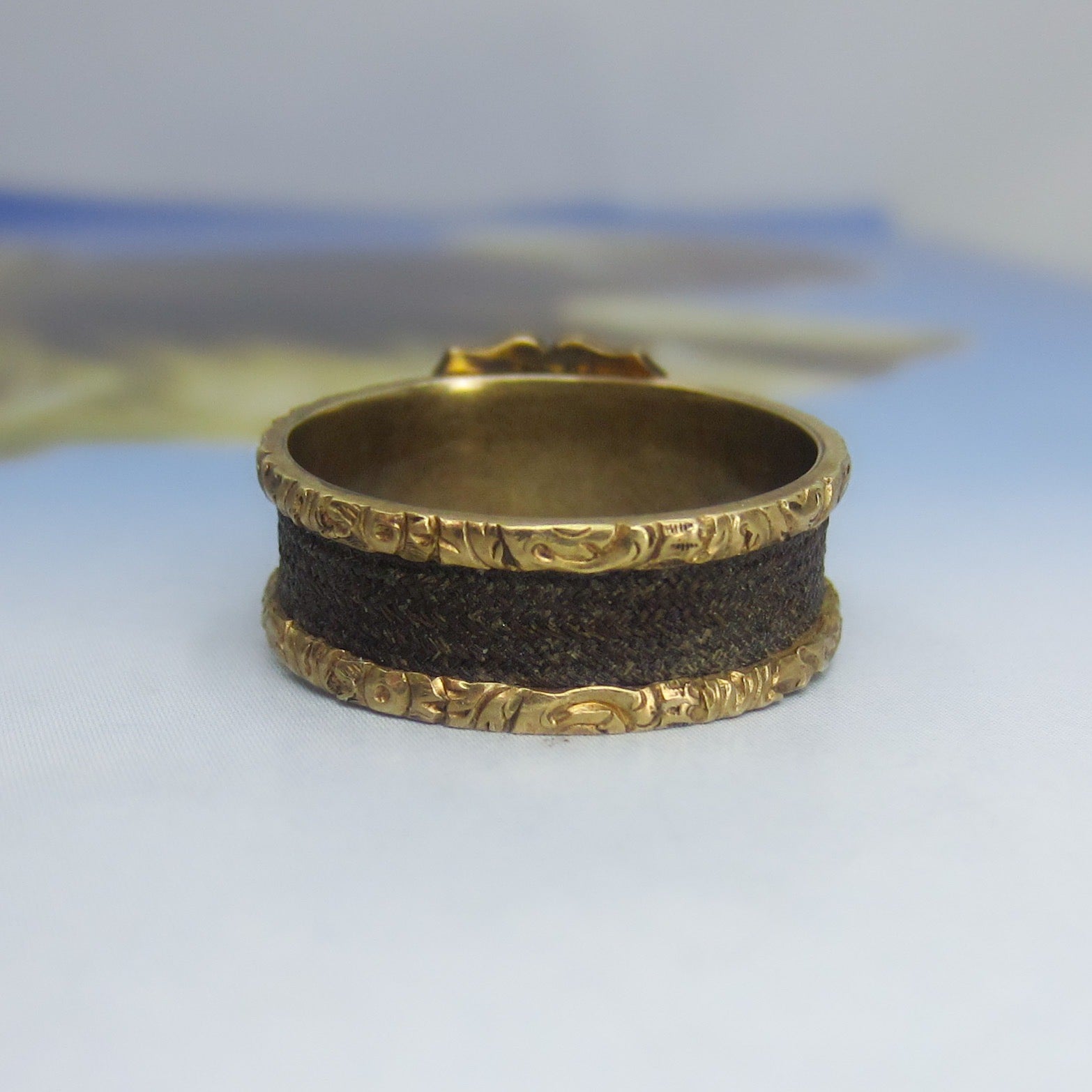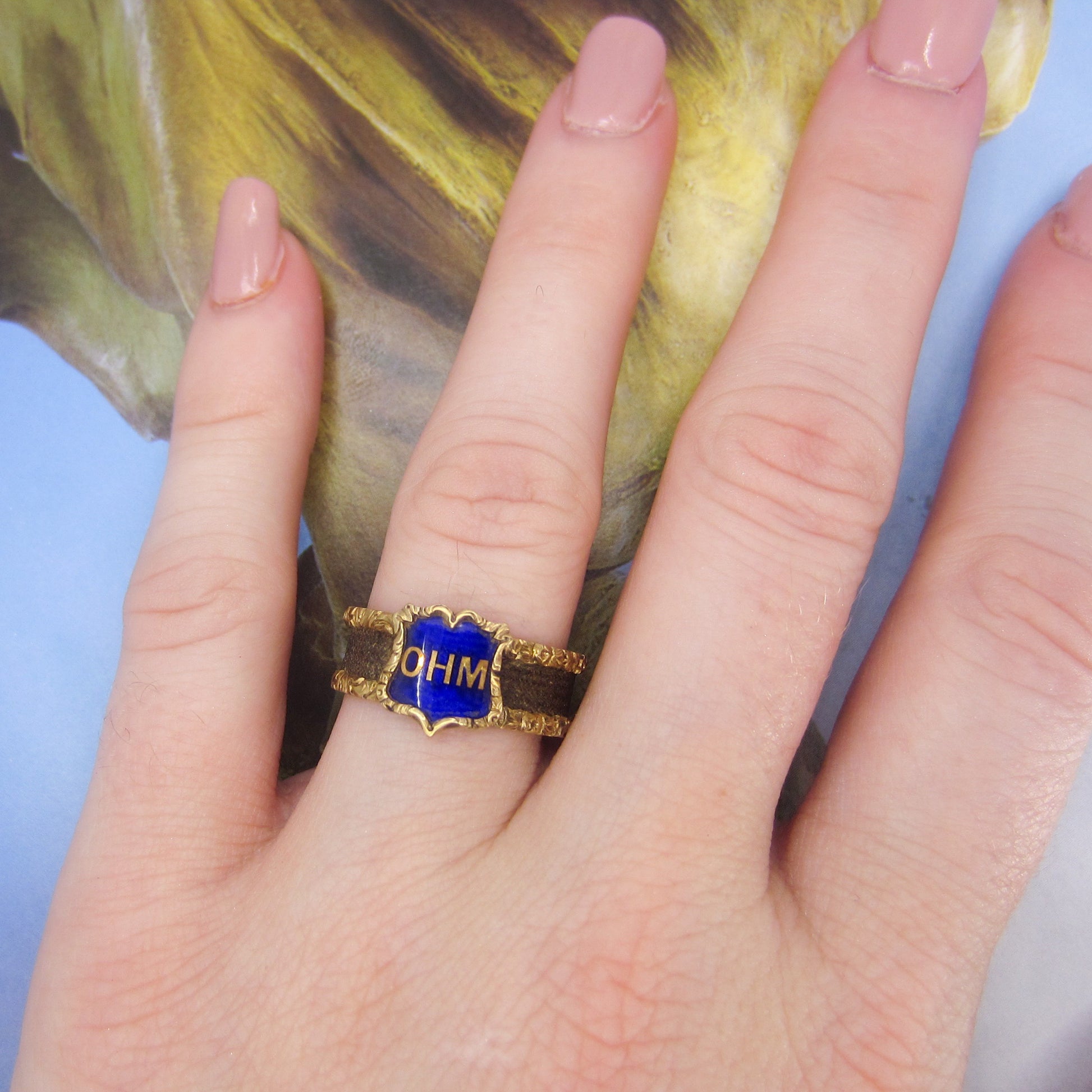 A pristine Victorian hairwork mourning ring, with a shield-shaped enamel plaque with the initials “OHM” and intricately woven hair around a 15k band. CIrca 1870.