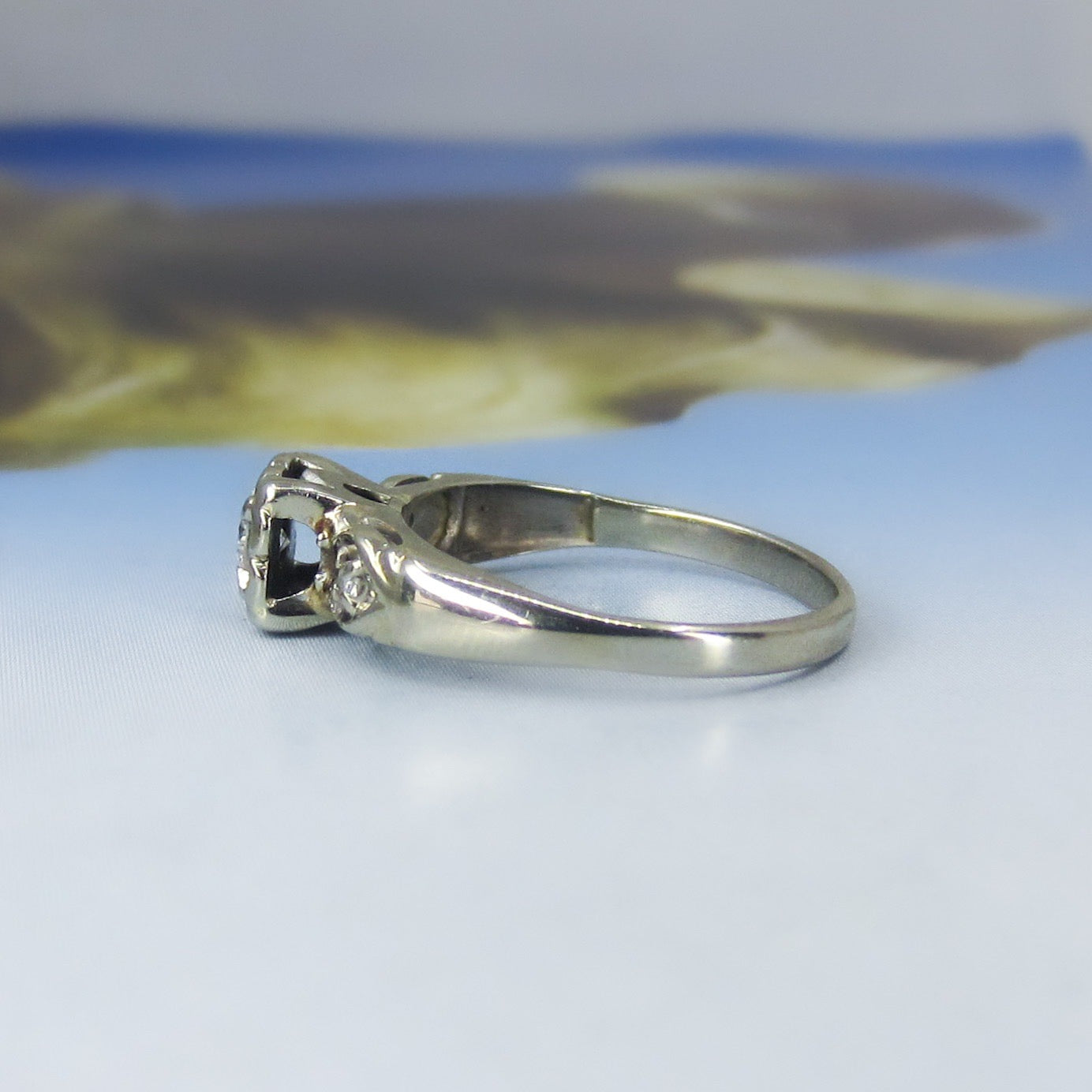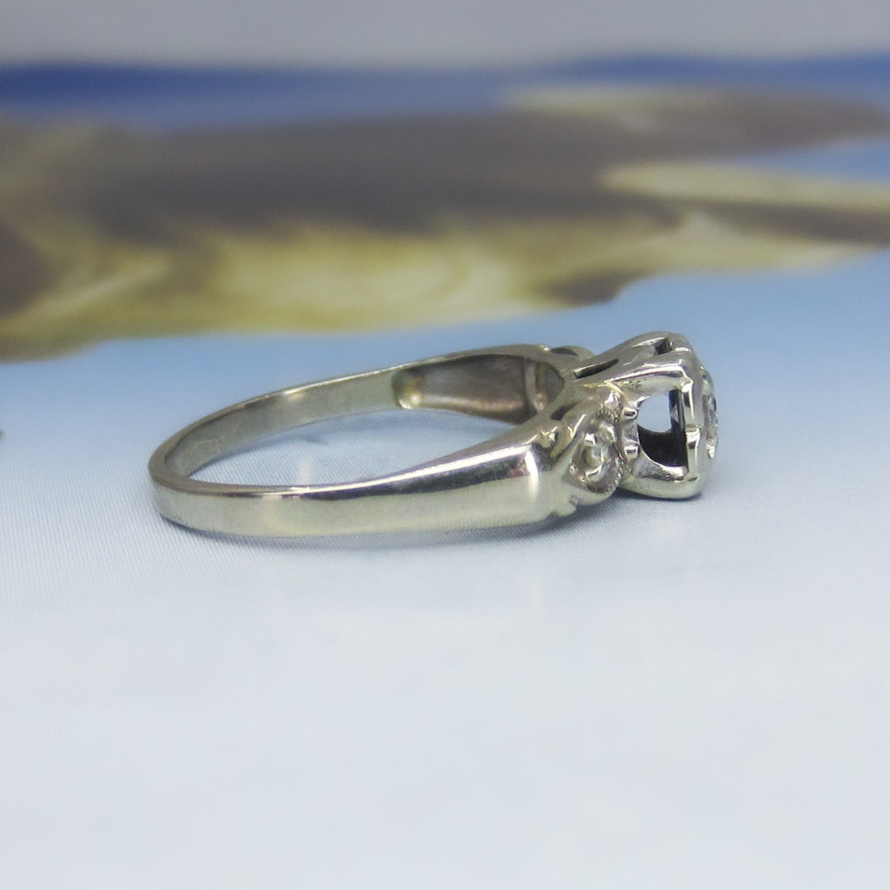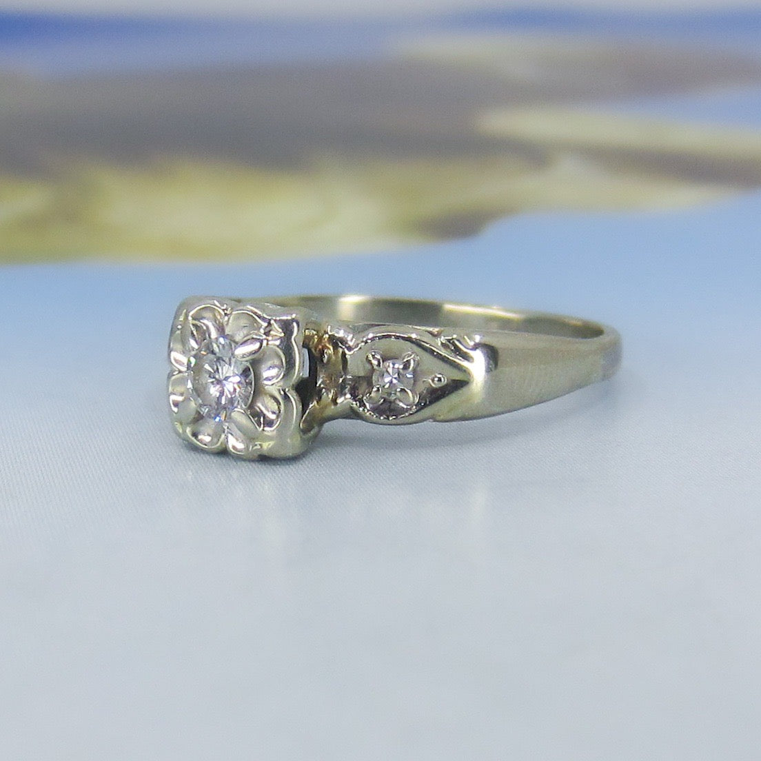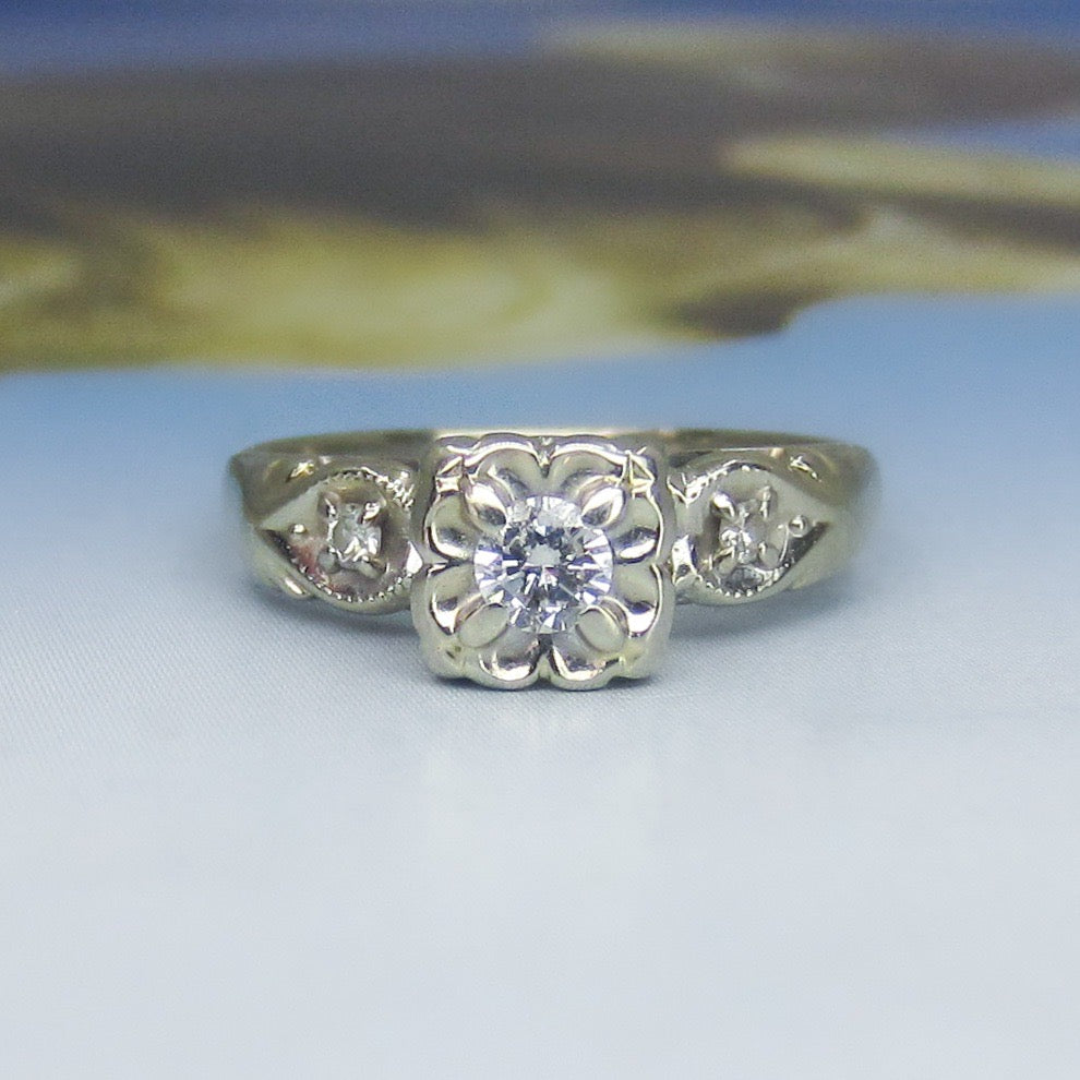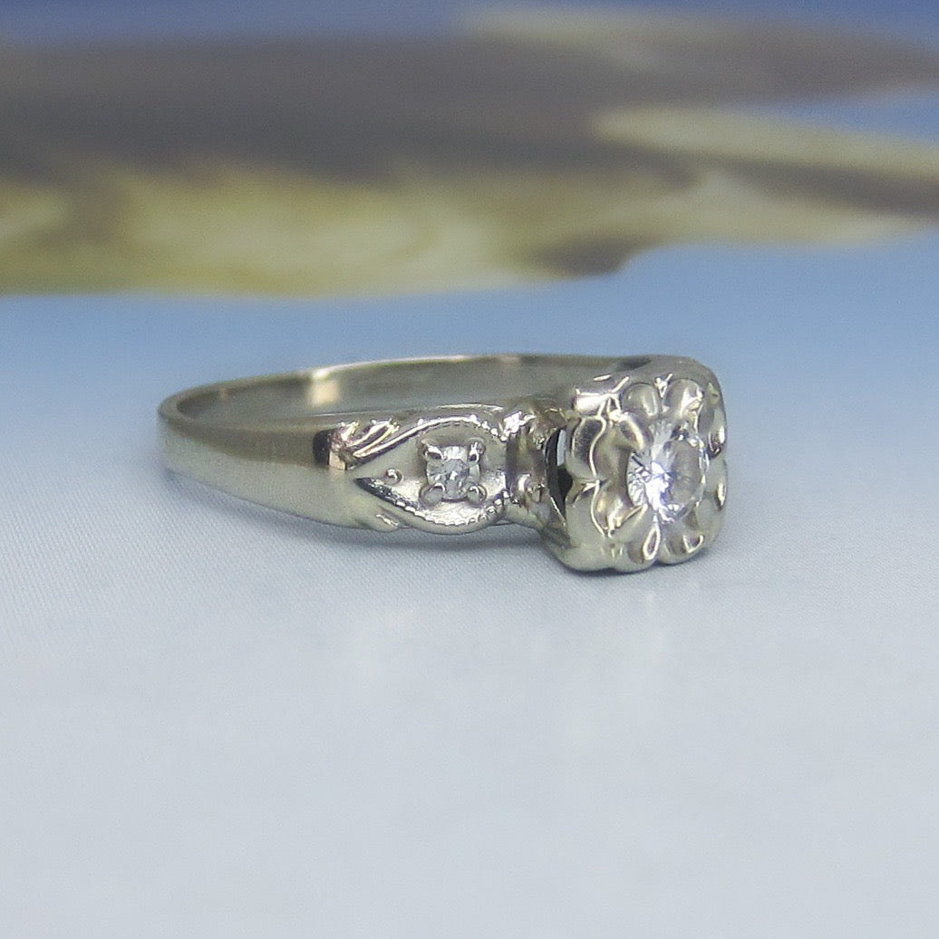 This lovely late Art Deco engagement ring holds a central .15ct Transitional Round Brilliant Cut diamond, prong set in a flower-like illusion setting with two Single Cut diamonds set in leaf shapes on the shoulders. Made in 14k white gold circa 1940. So pretty, in great condition and ready to be worn and adored once more!