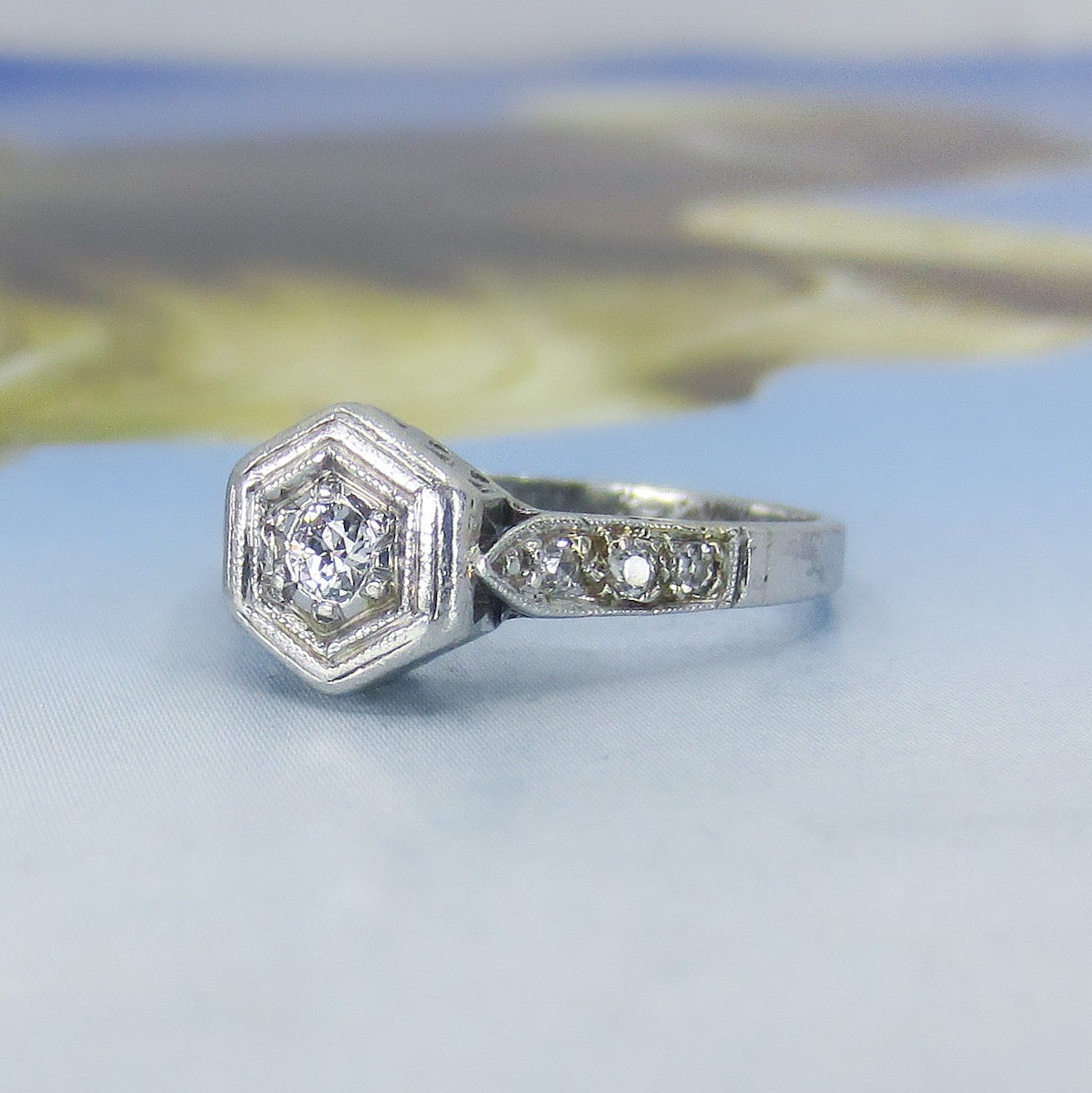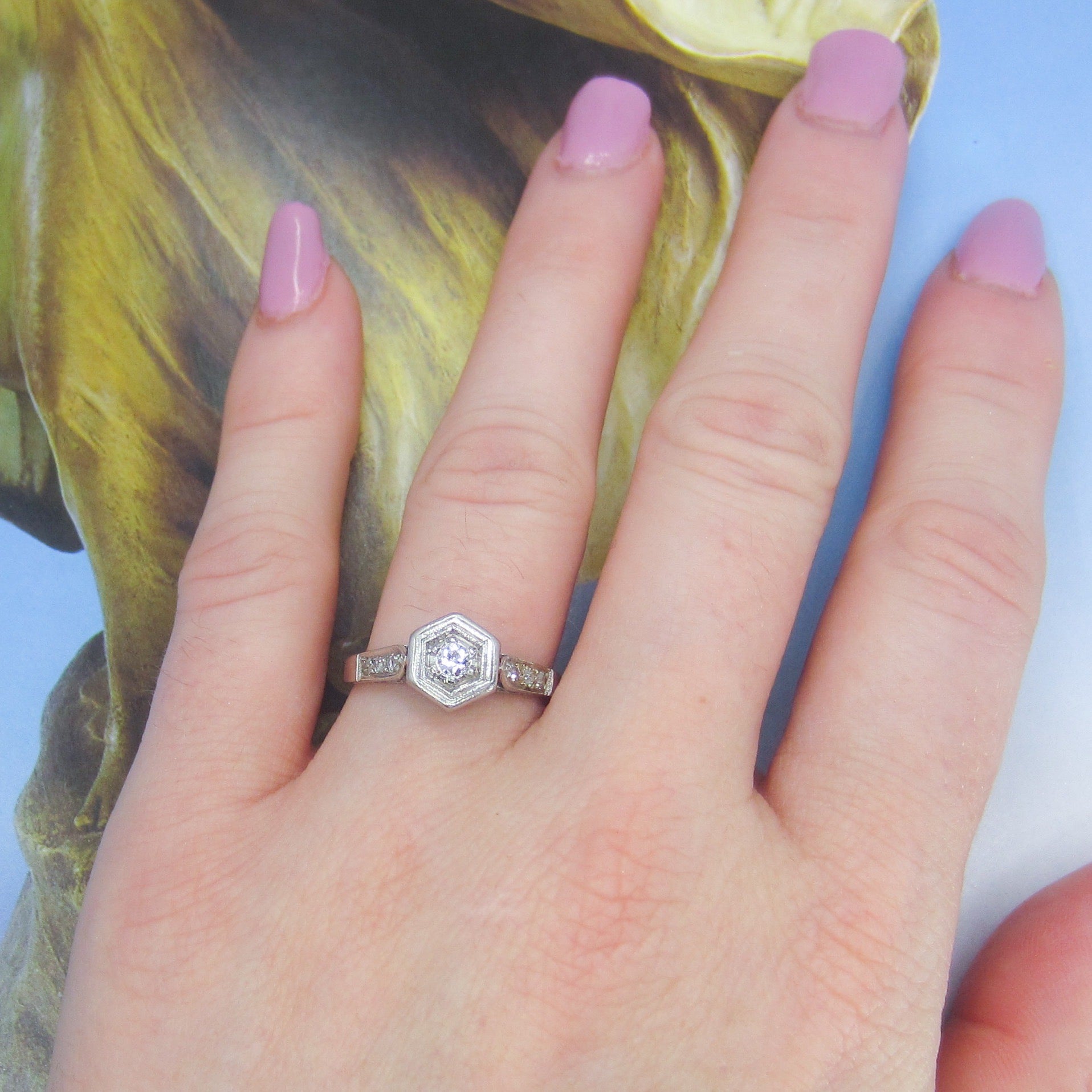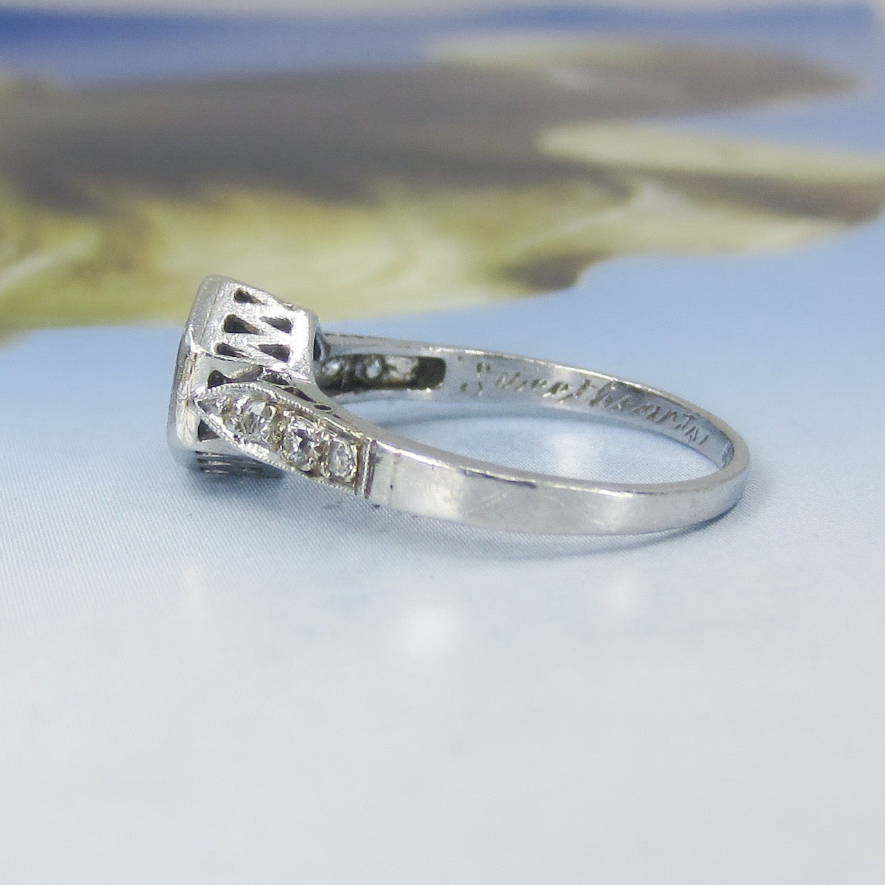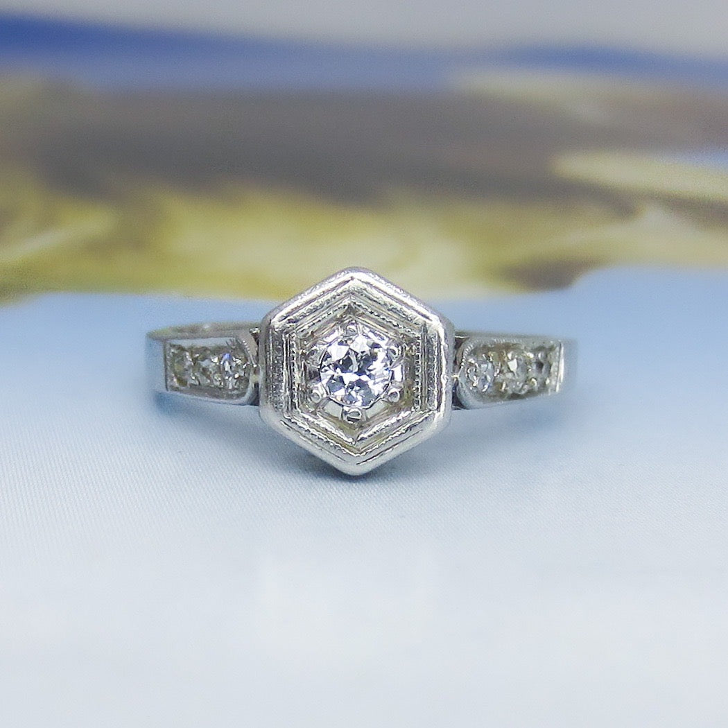 This is such a beautiful, romantic ring and I don't think it photographed nearly as gorgeous as it is. Made in the early Art Deco period and fully engraved for 1920, this lovely engagement ring holds a central .10ct Old European Cut diamond bead set in a hexagonal setting with six Old Cut diamonds on the shoulders. It also has a beautiful lattice gallery that takes center stage when viewed from the side. Engraved "Sweethearts 6-29-20". A true antique heirloom.