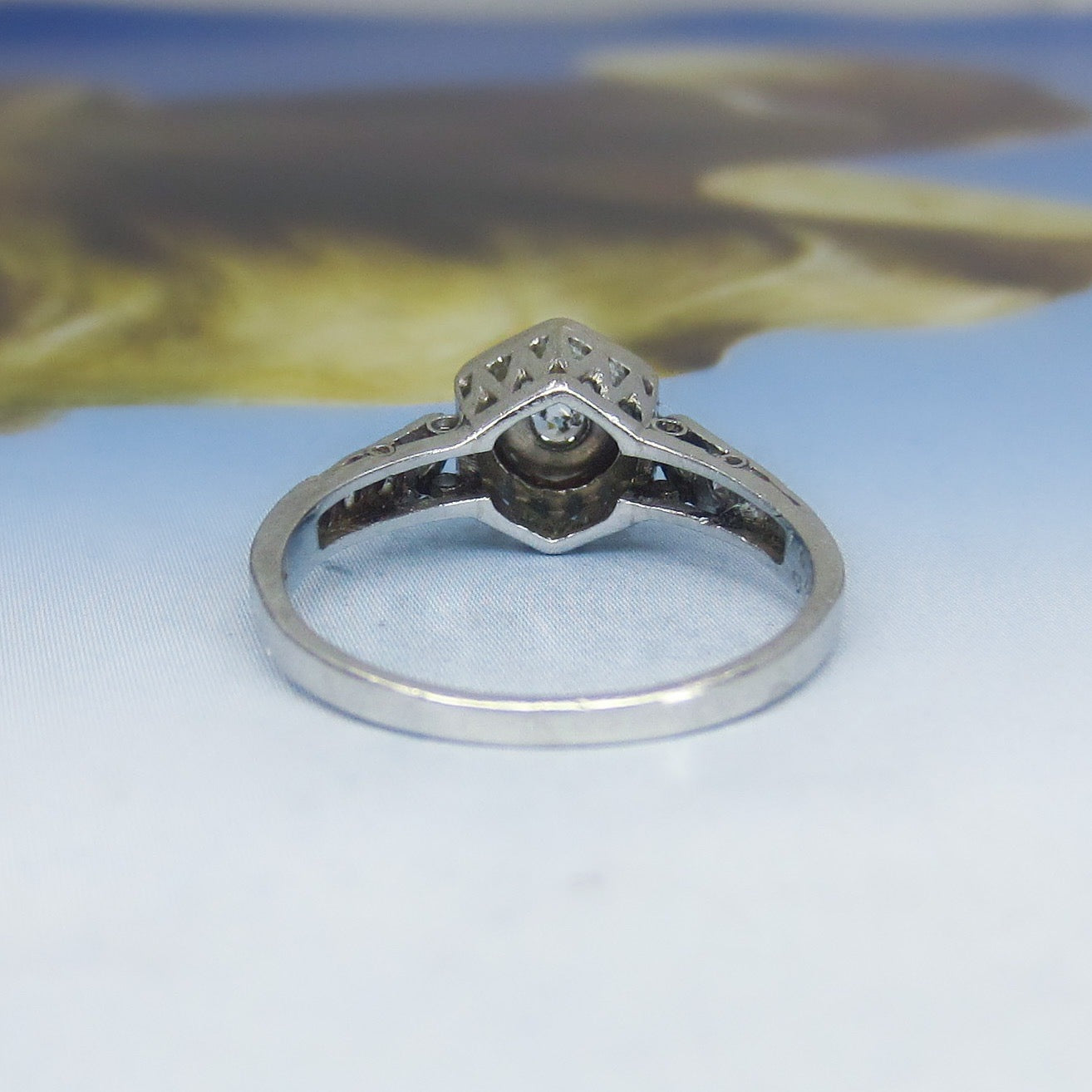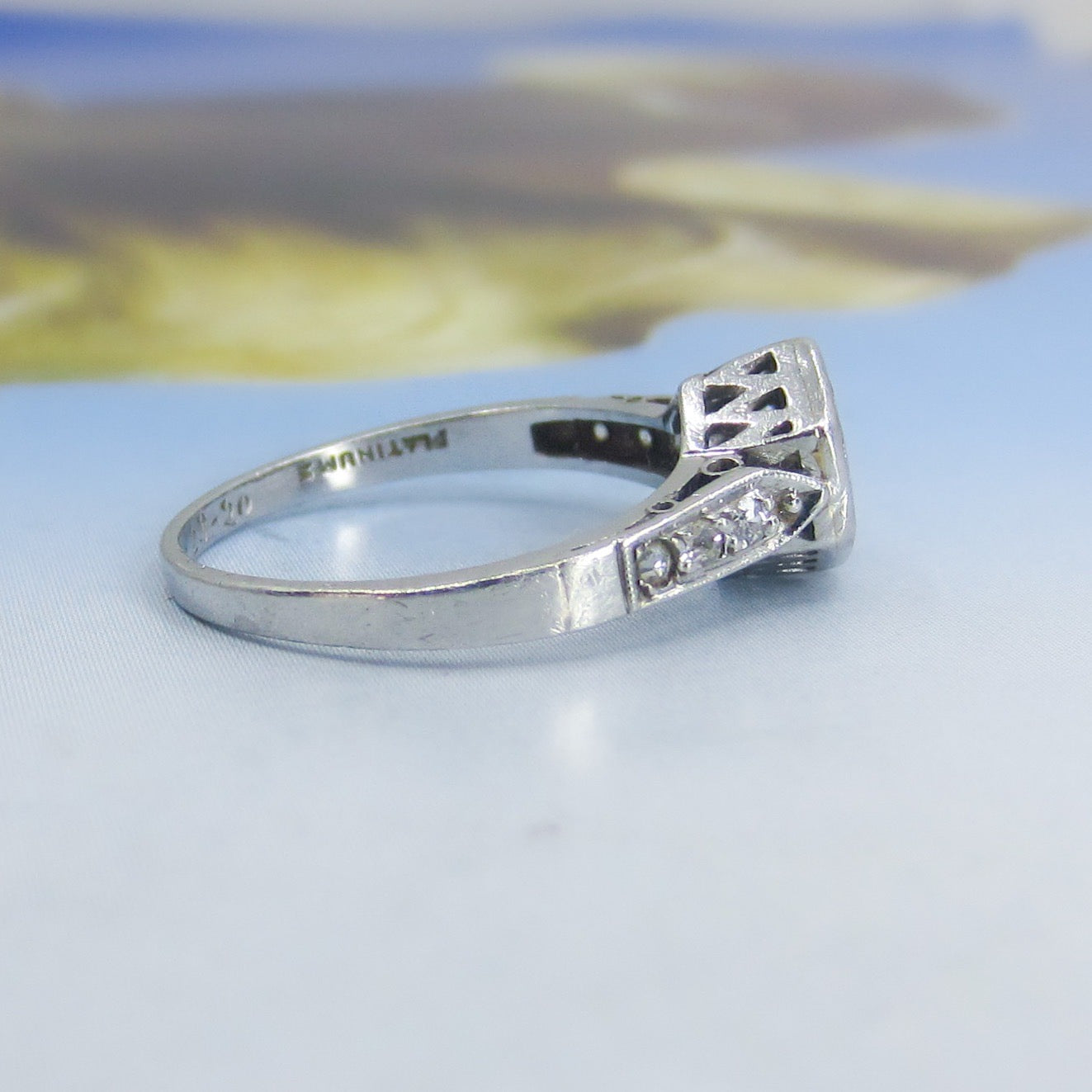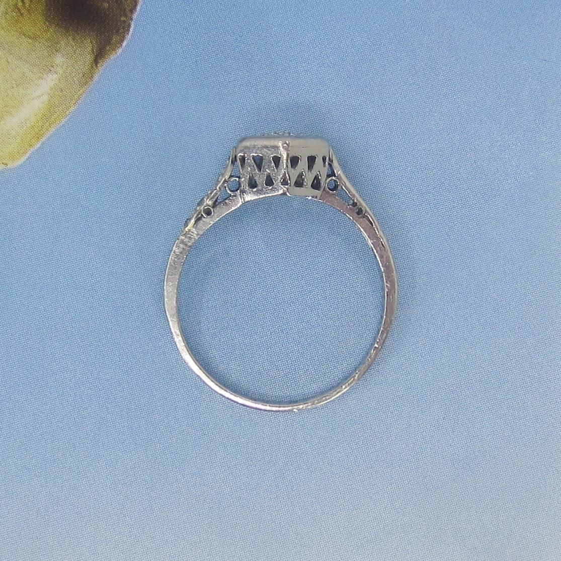 This is such a beautiful, romantic ring and I don't think it photographed nearly as gorgeous as it is. Made in the early Art Deco period and fully engraved for 1920, this lovely engagement ring holds a central .10ct Old European Cut diamond bead set in a hexagonal setting with six Old Cut diamonds on the shoulders. It also has a beautiful lattice gallery that takes center stage when viewed from the side. Engraved "Sweethearts 6-29-20". A true antique heirloom.