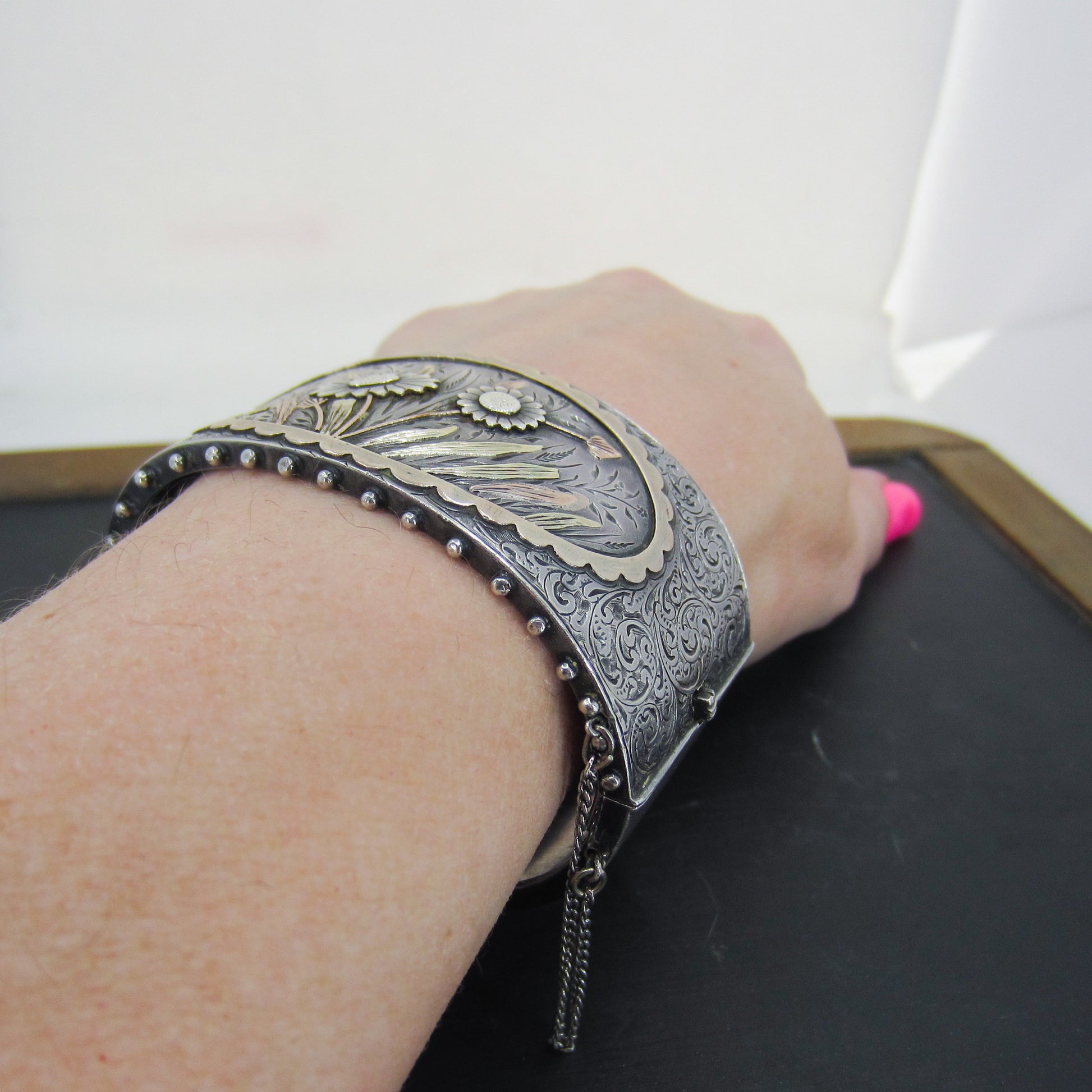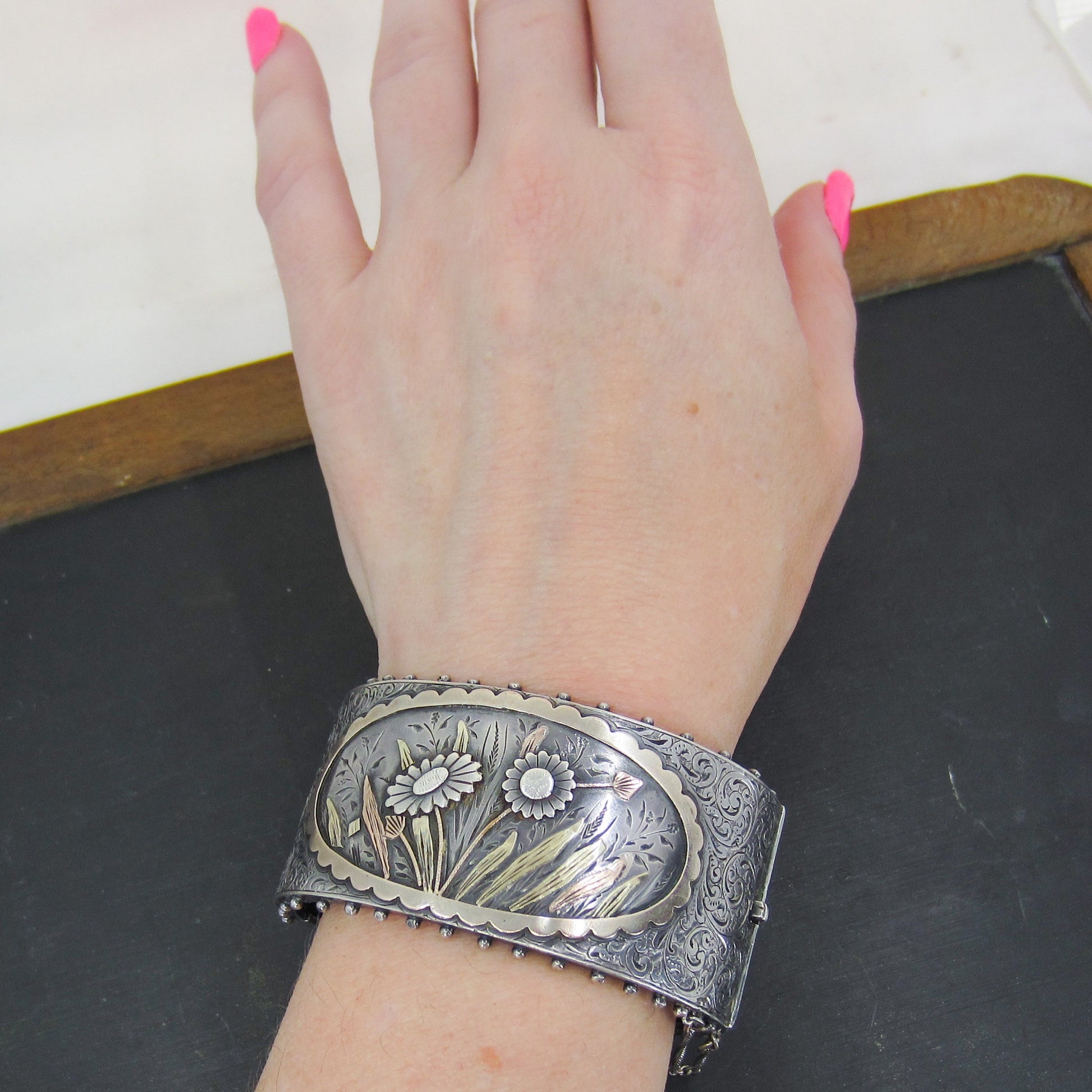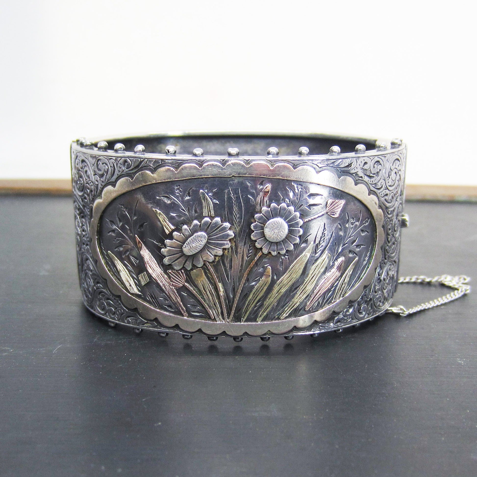 SOLD--Victorian Aesthetic Period Mixed Metals Hinged Bangle Sterling c. 1880