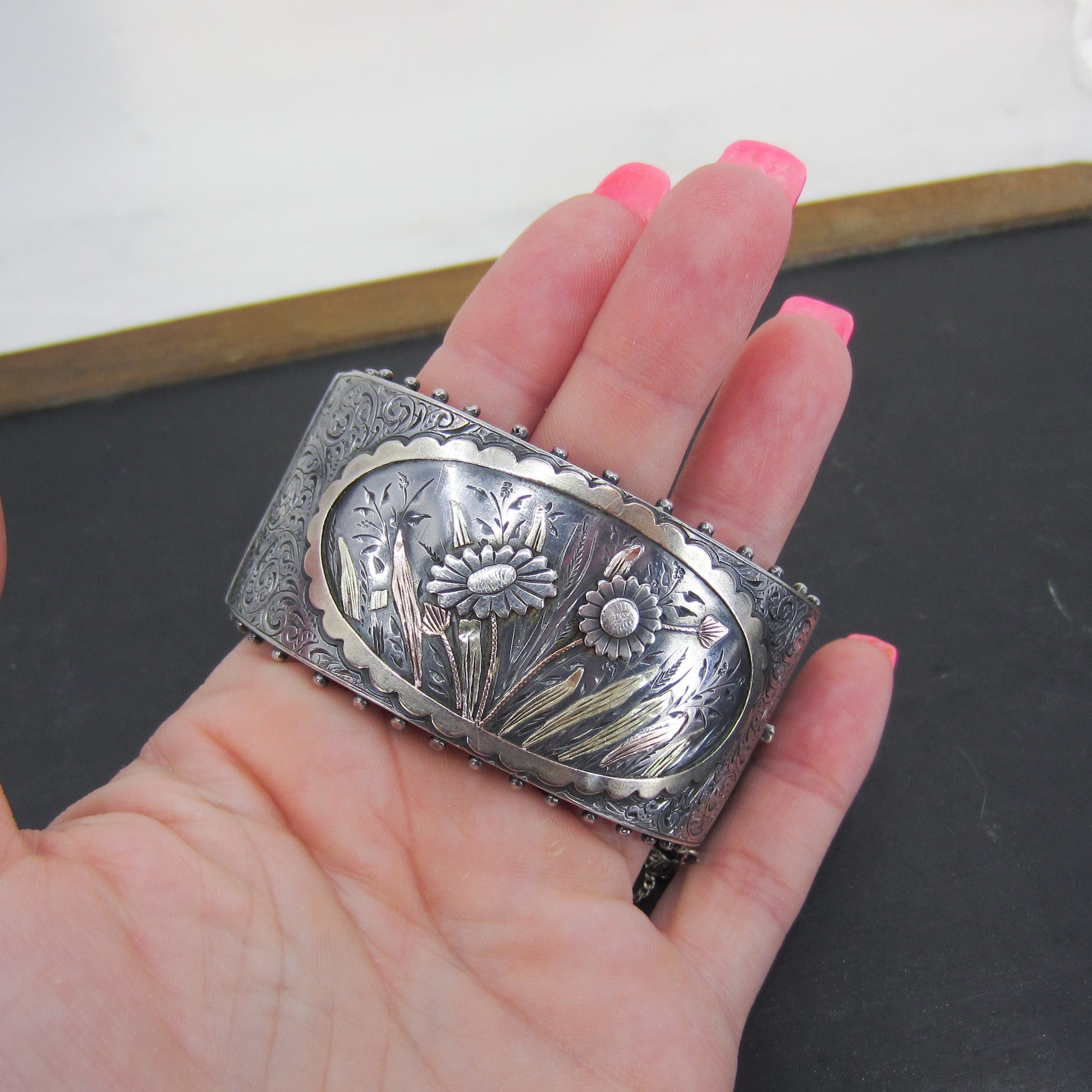 An exquisite Victorian era hinged bangle, made in sterling silver with rose and yellow gold overlay in the style of the Aesthetic Period circa 1880. A stunner in amazing condition!