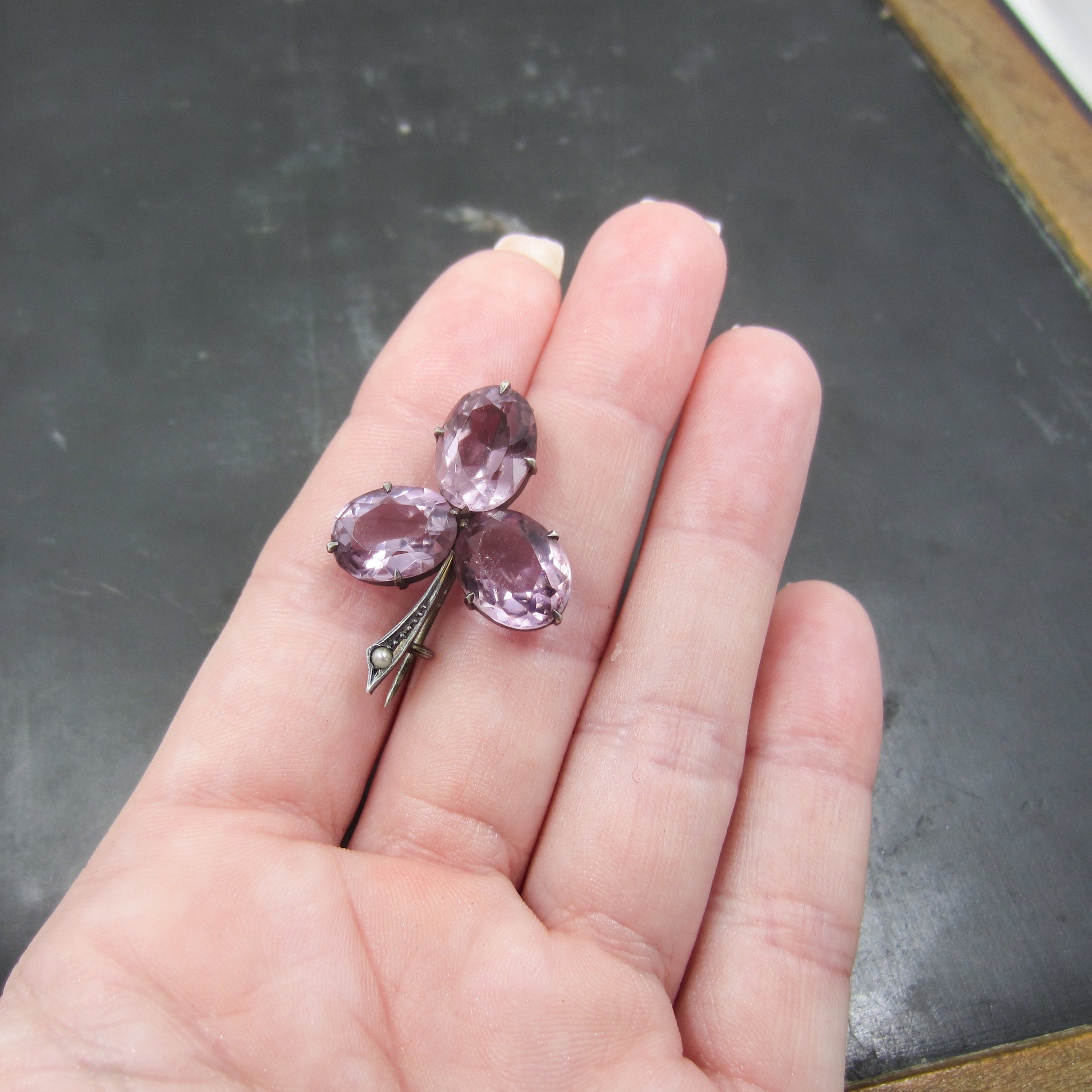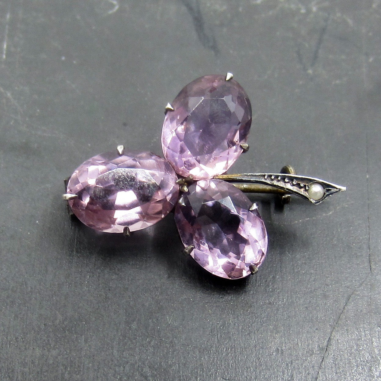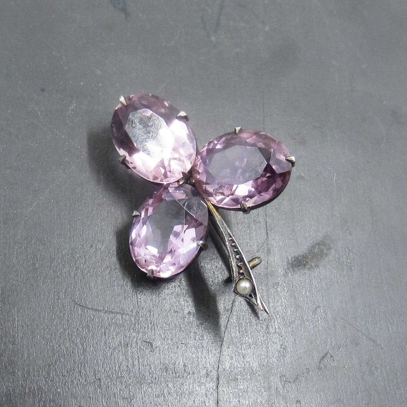 This is such a lovely brooch, with sparkling light colored amethysts set as leaves in a clover with a little pearl in the stem! Made in sterling silver circa 1890 and all original. Just gorgeous gemmy color and simple, perfect design!