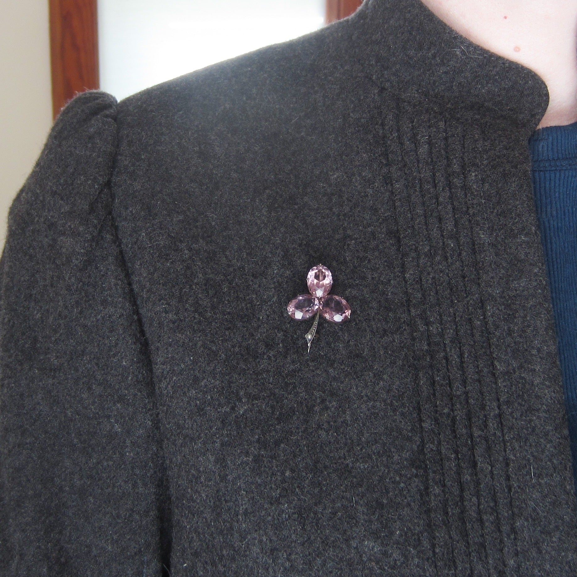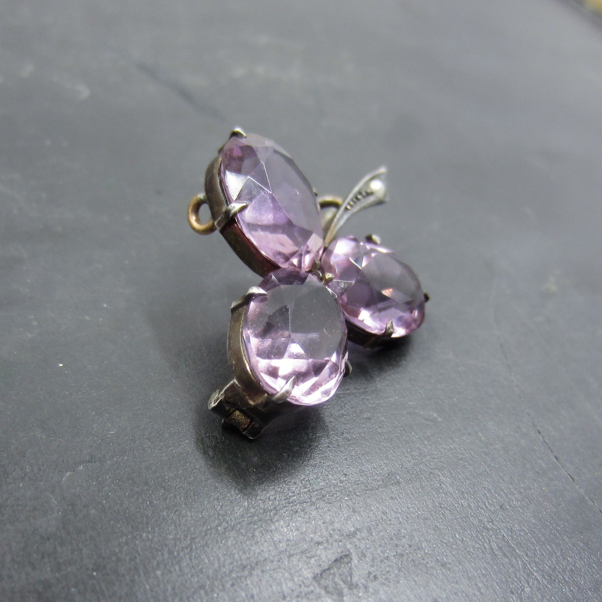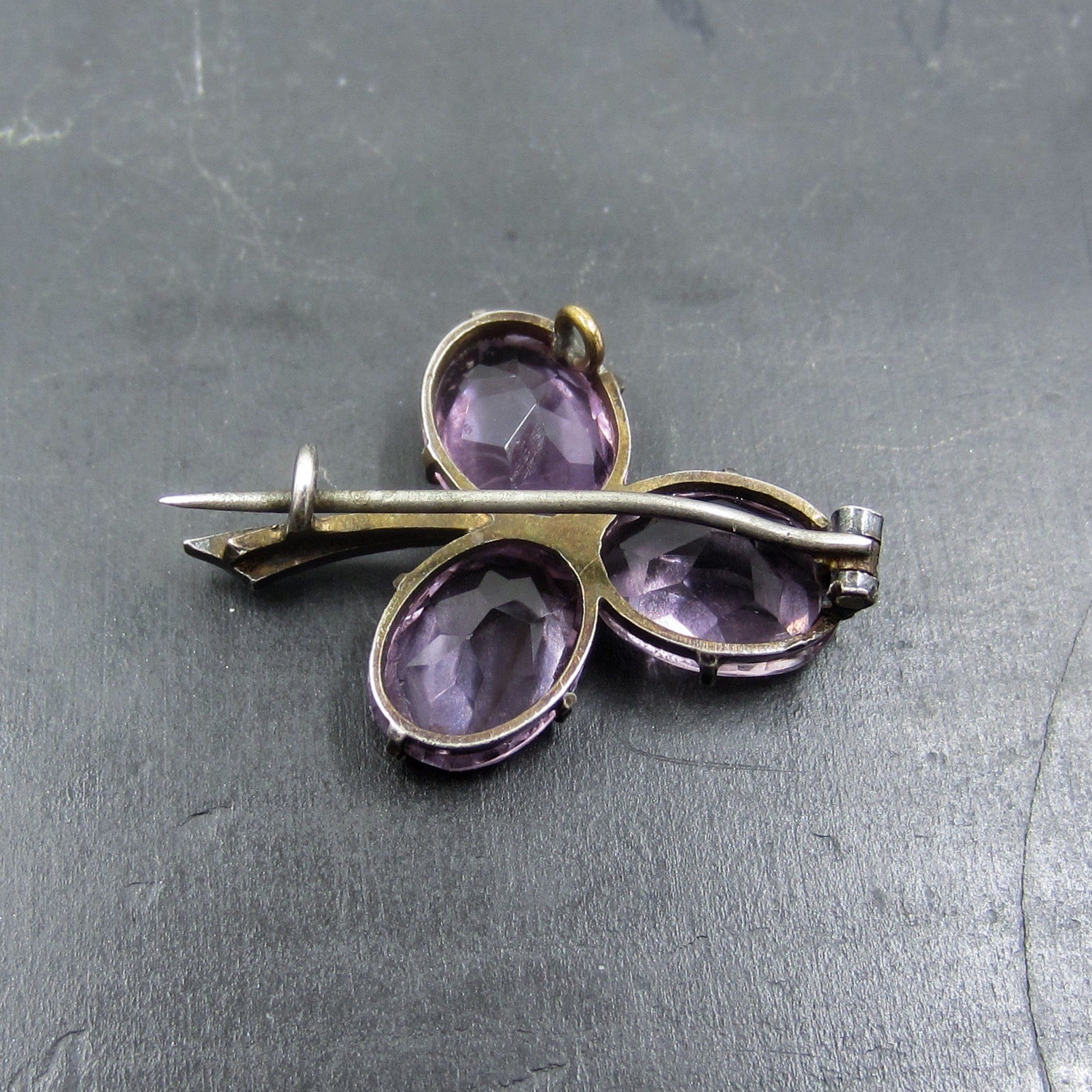This is such a lovely brooch, with sparkling light colored amethysts set as leaves in a clover with a little pearl in the stem! Made in sterling silver circa 1890 and all original. Just gorgeous gemmy color and simple, perfect design!
