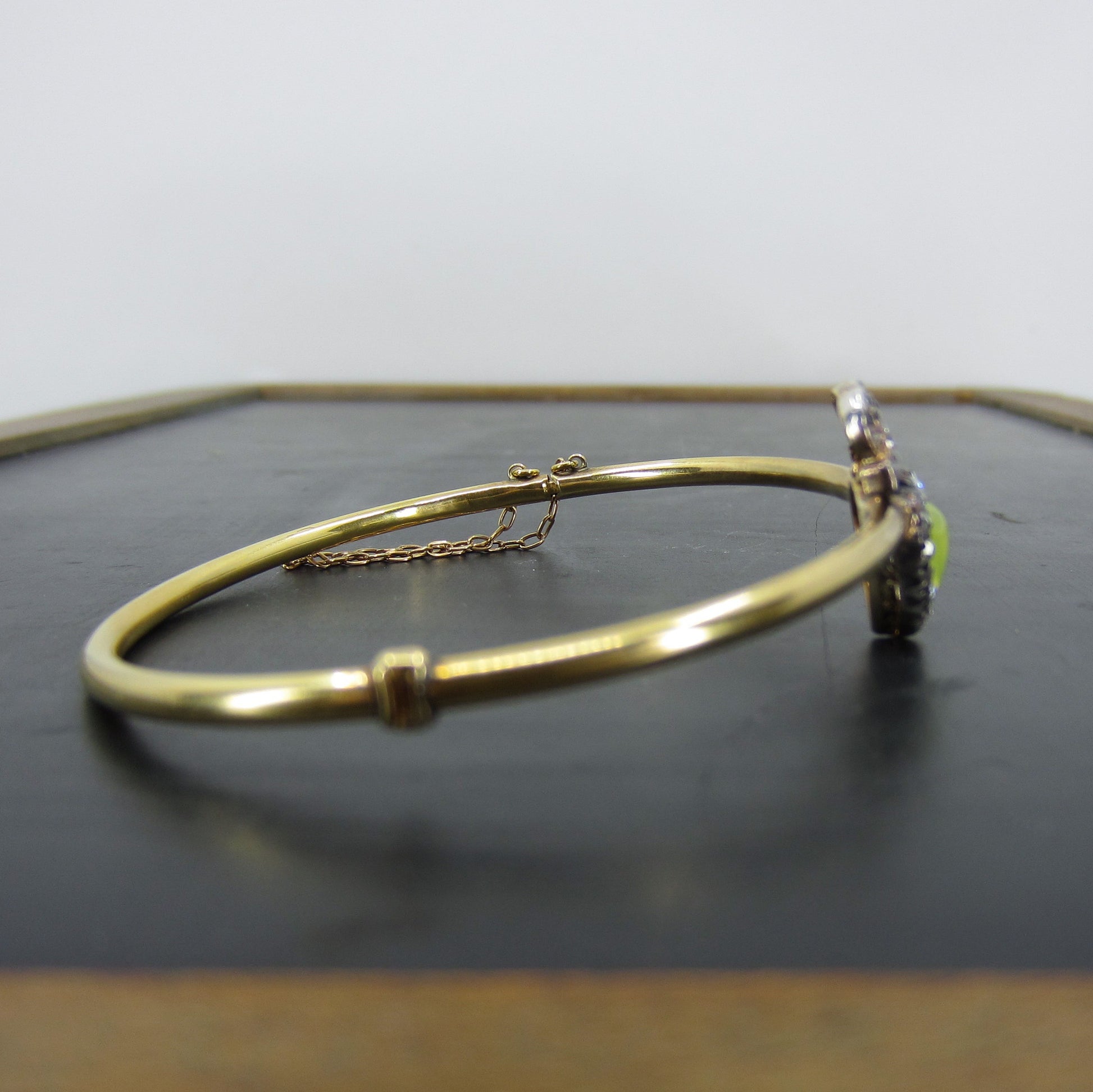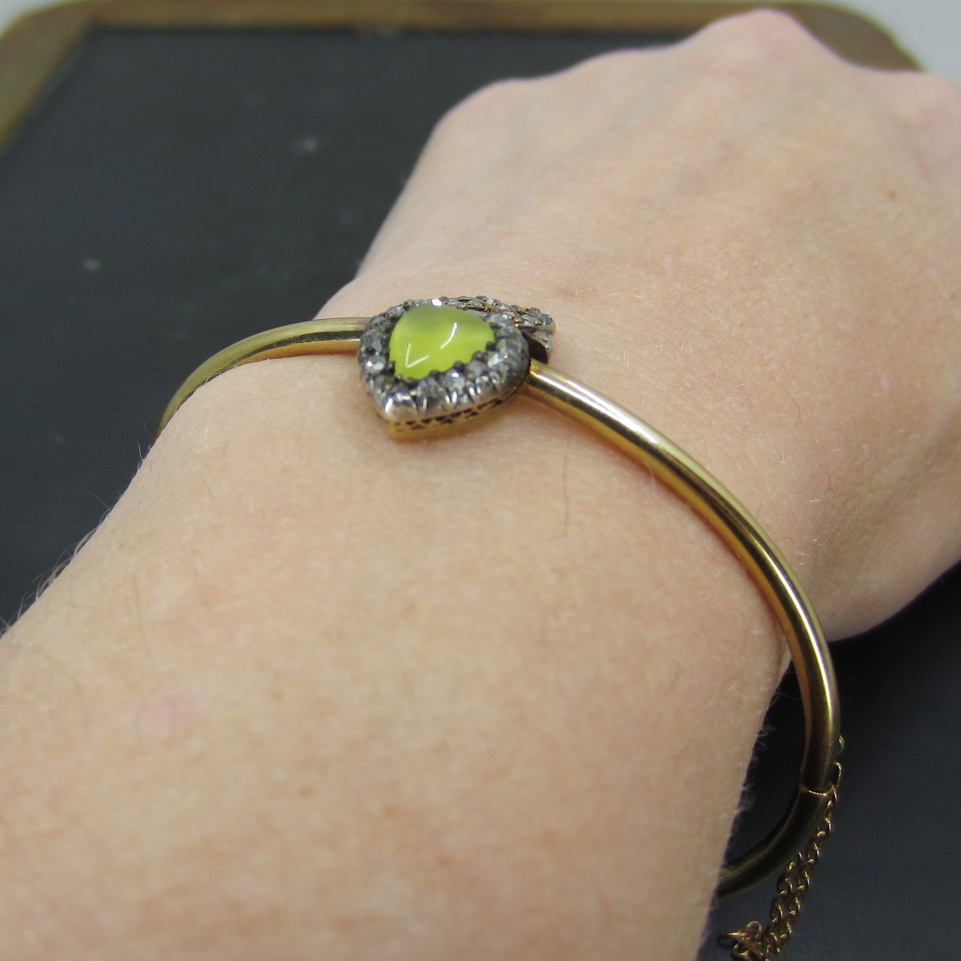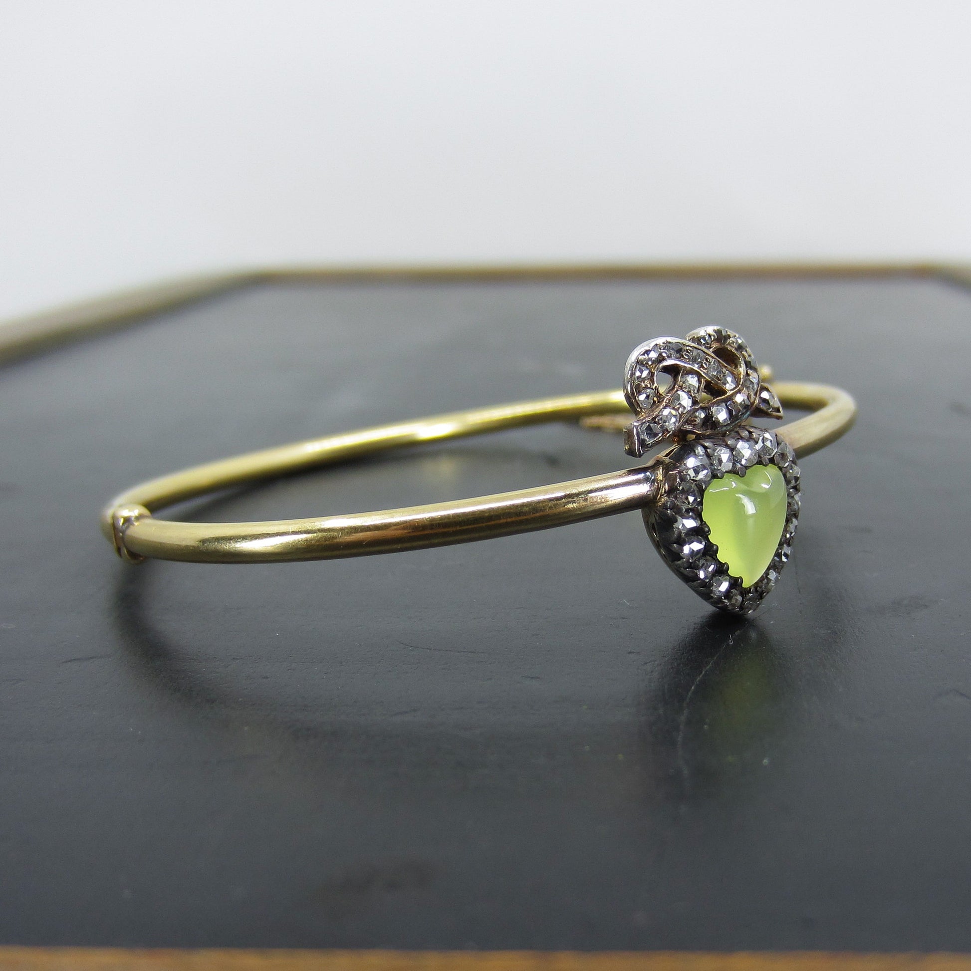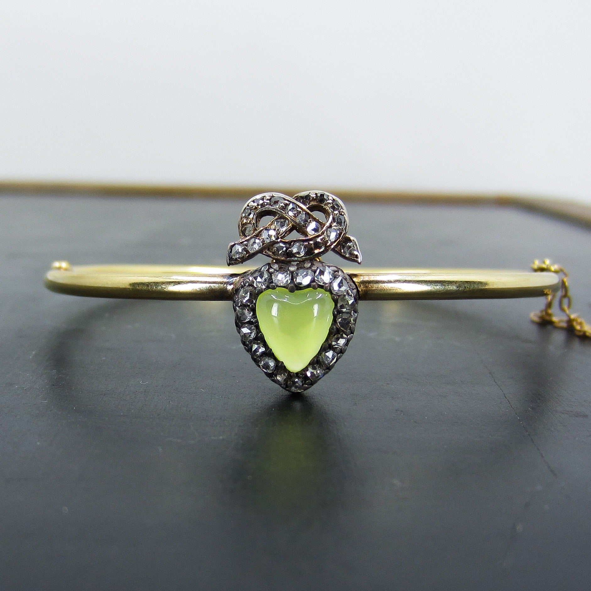 A beautiful, romantic bracelet from the late Victorian period. A central chrysoprase cabochon, shaped as a heart, is surrounded by a frame of rose cut diamonds and topped with a love knot crown. Diamonds set in silver, the rest of the piece is 14k. Circa 1890