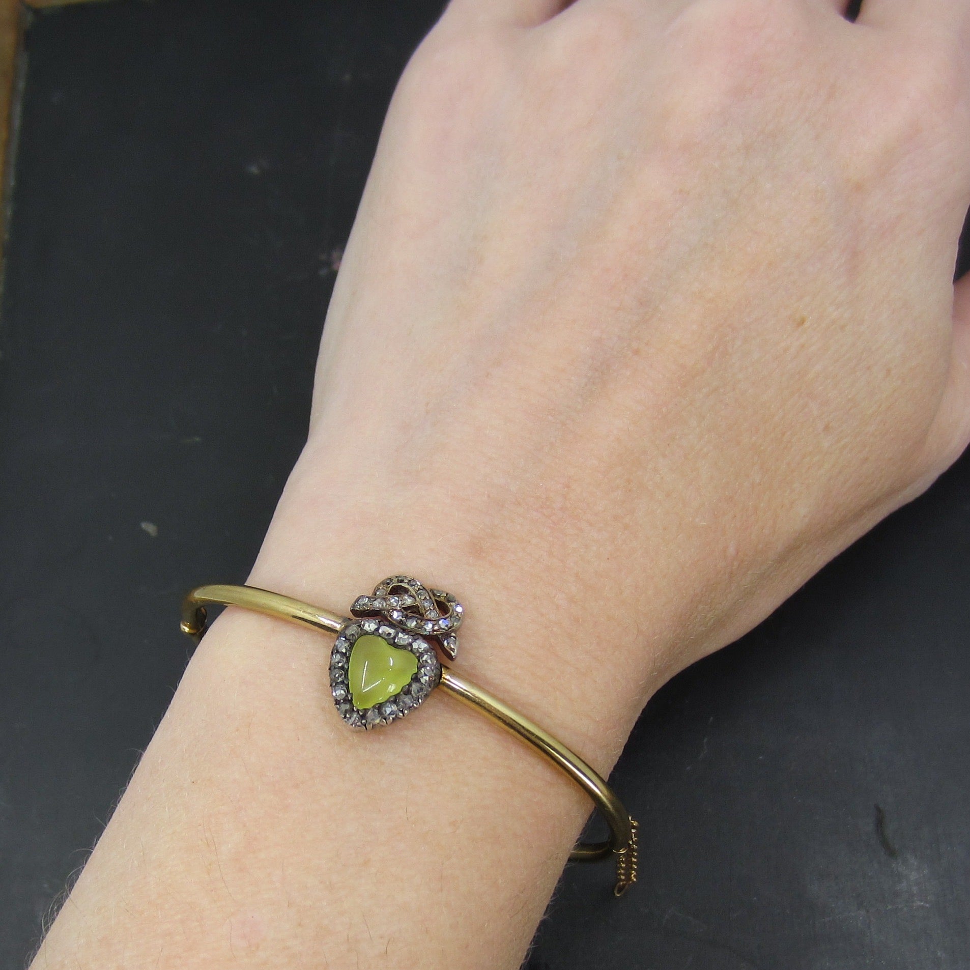 SOLD--Victorian Chrysoprase and Rose Cut Diamond Heart with Love Knot Bracelet Silver/14k c. 1890