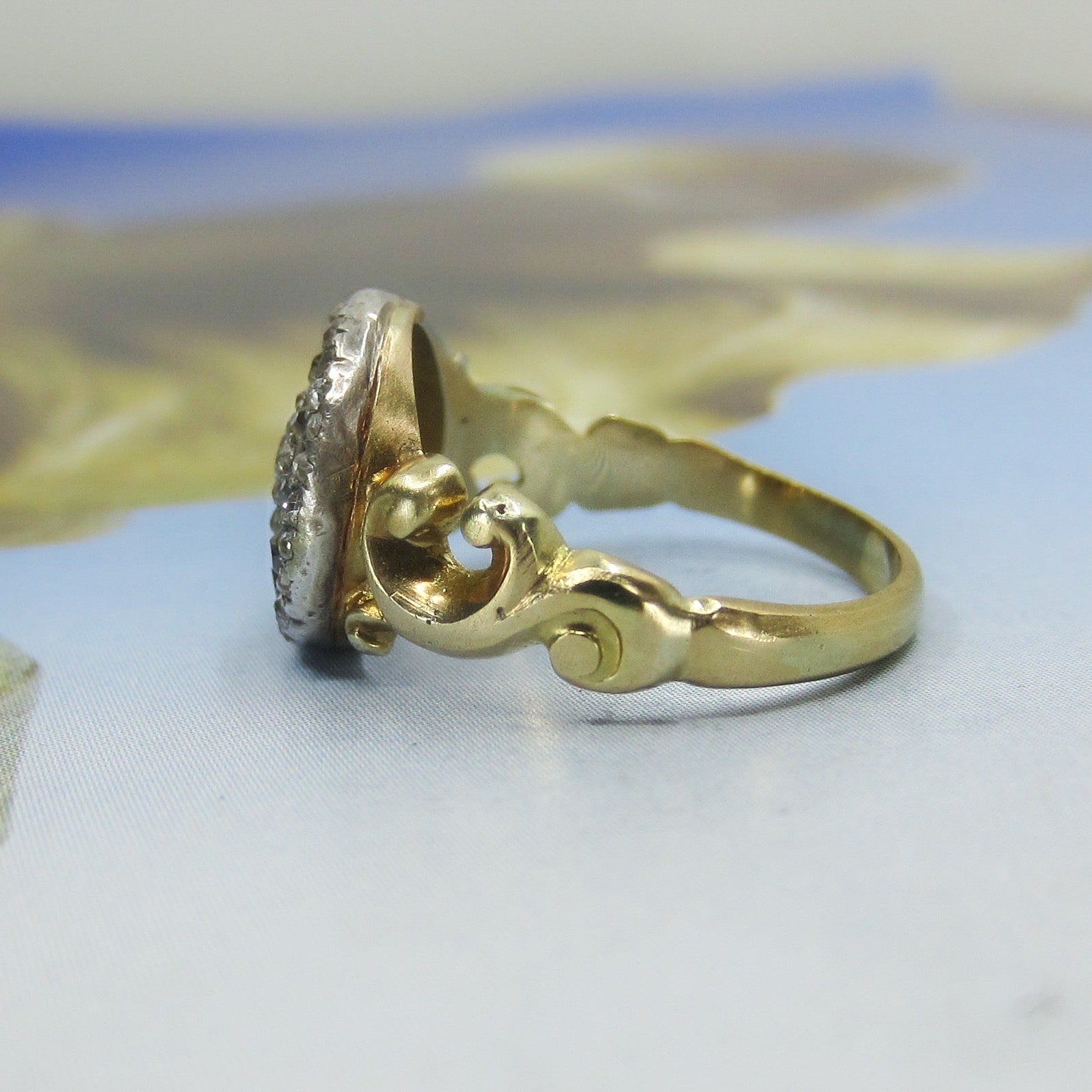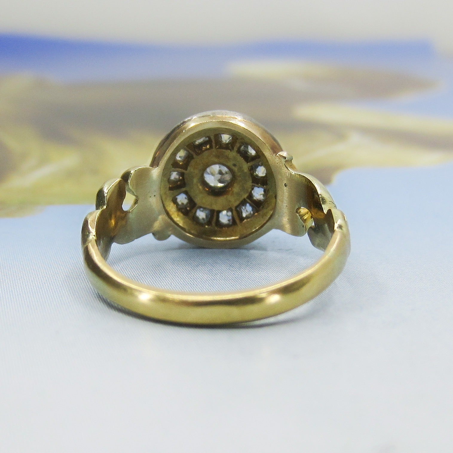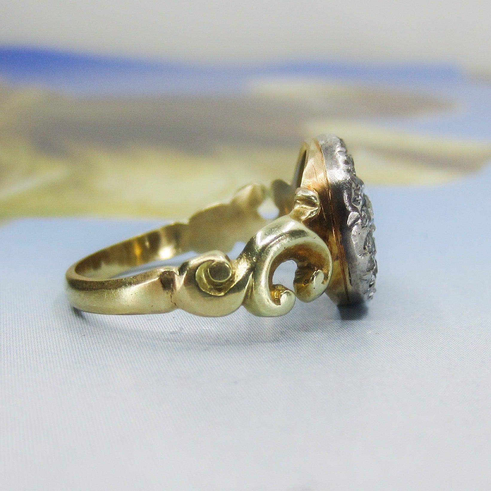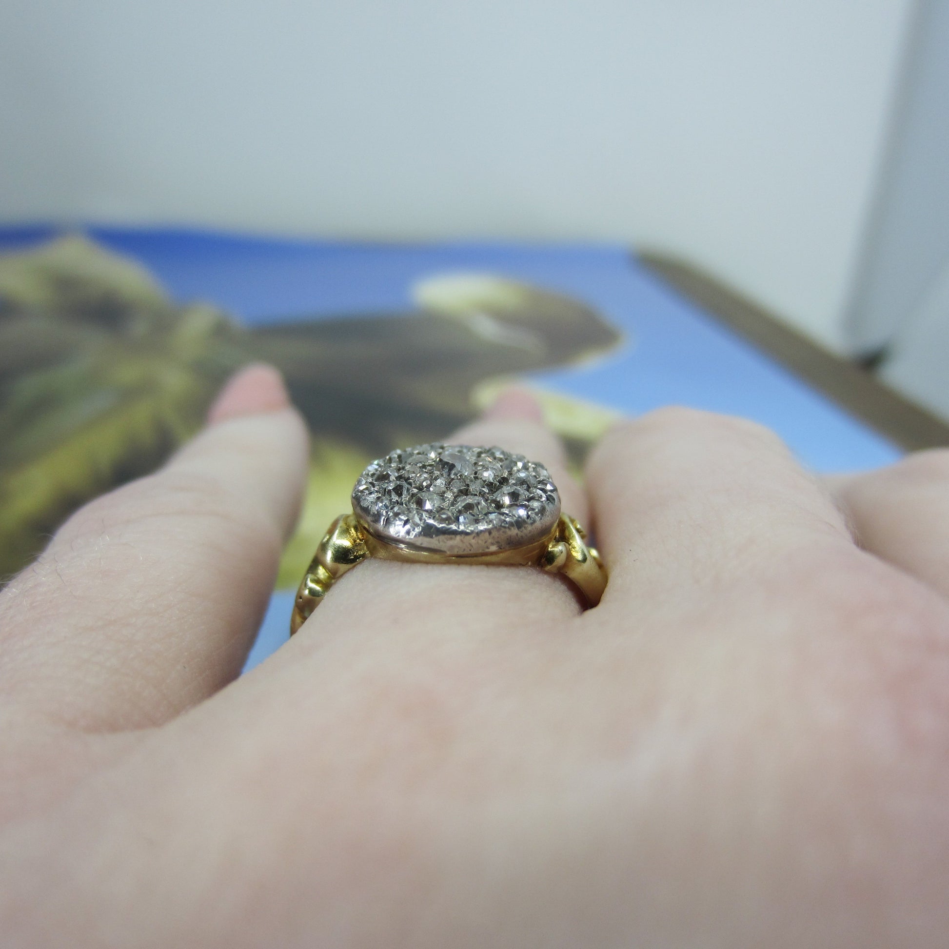 This is a beautiful, classic late Victorian diamond cluster ring made in 18k gold with silver for the diamond setting cIrca 1890. Set with a central Old Mine Cut diamond surrounded by two frames of Rose Cut and one frame of Old Mine Cut diamonds that alternate. They packed this little beauty with diamonds and it’s as sparkly as can be! It also sits nice and flat on the finger and has beautiful, scrolling shoulders. This would make a romantic antique engagement ring!
