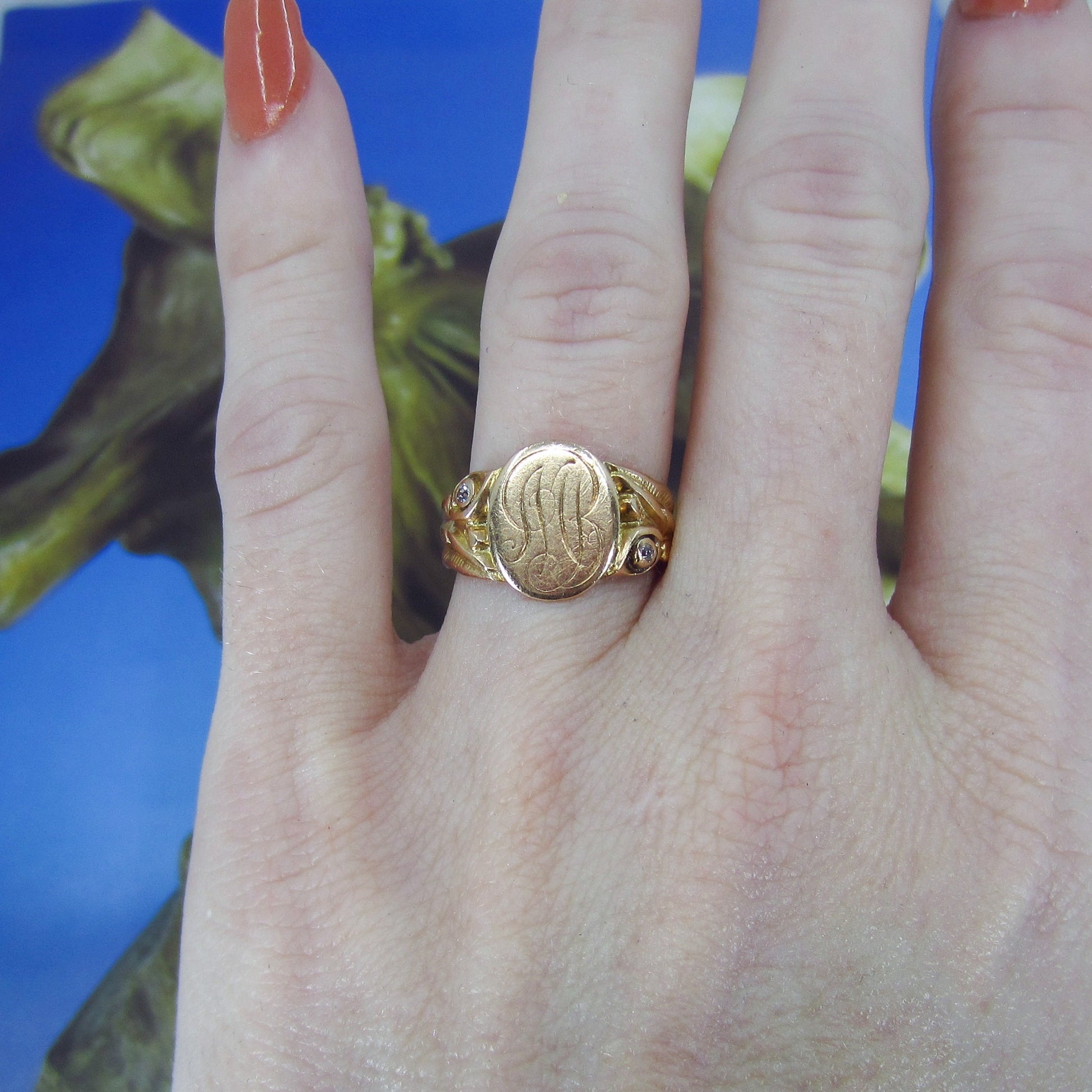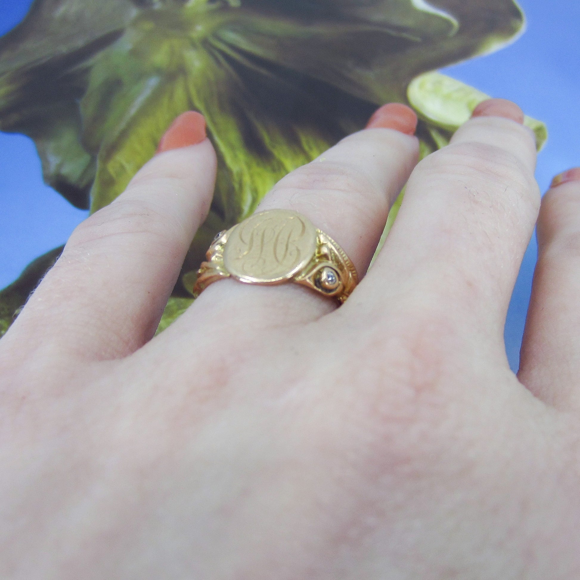 A sweet Victorian signet ring with the initials “AAB” (very worn) with the added bonus of two little Old Mine Cut diamonds! Made in 14k cIrca 1900.