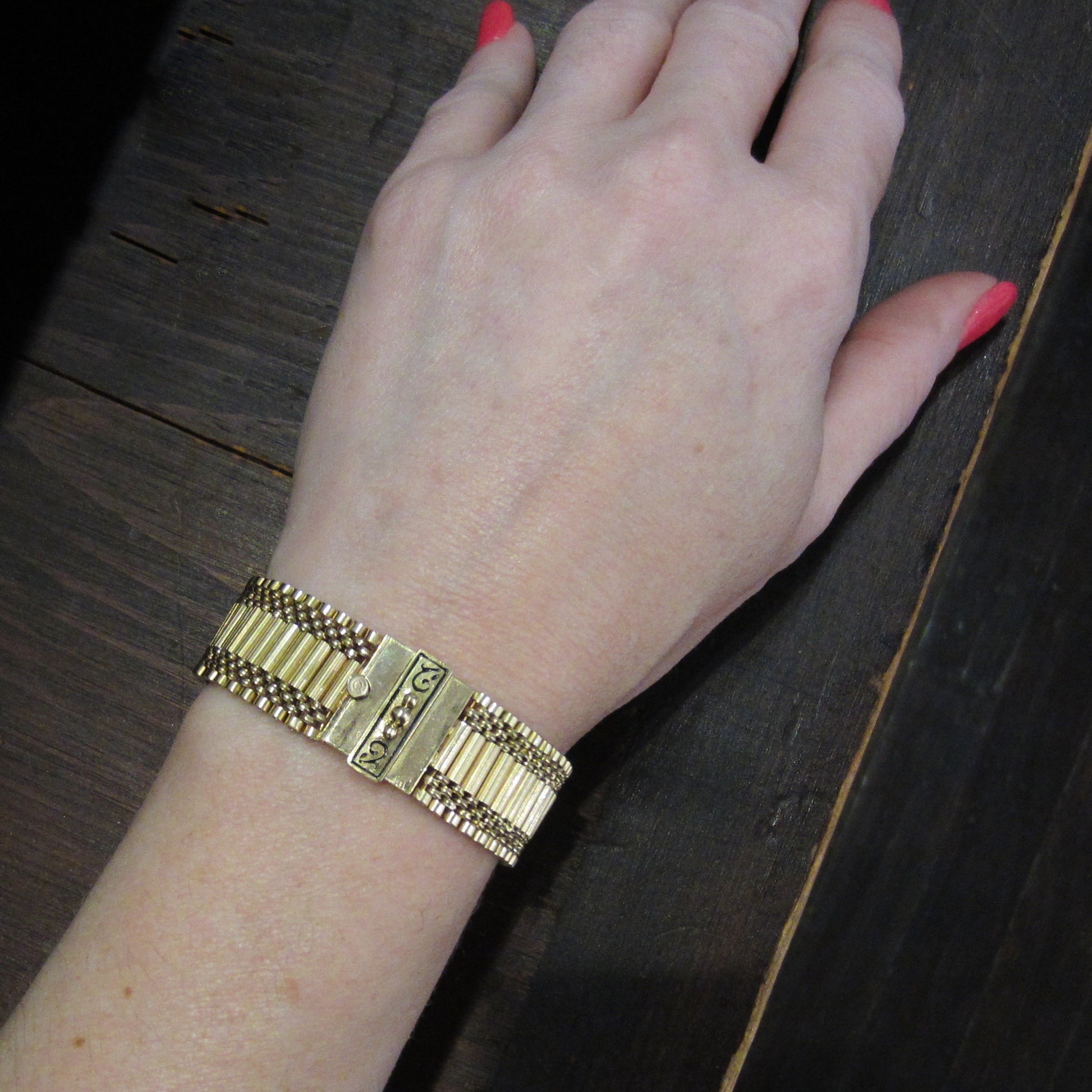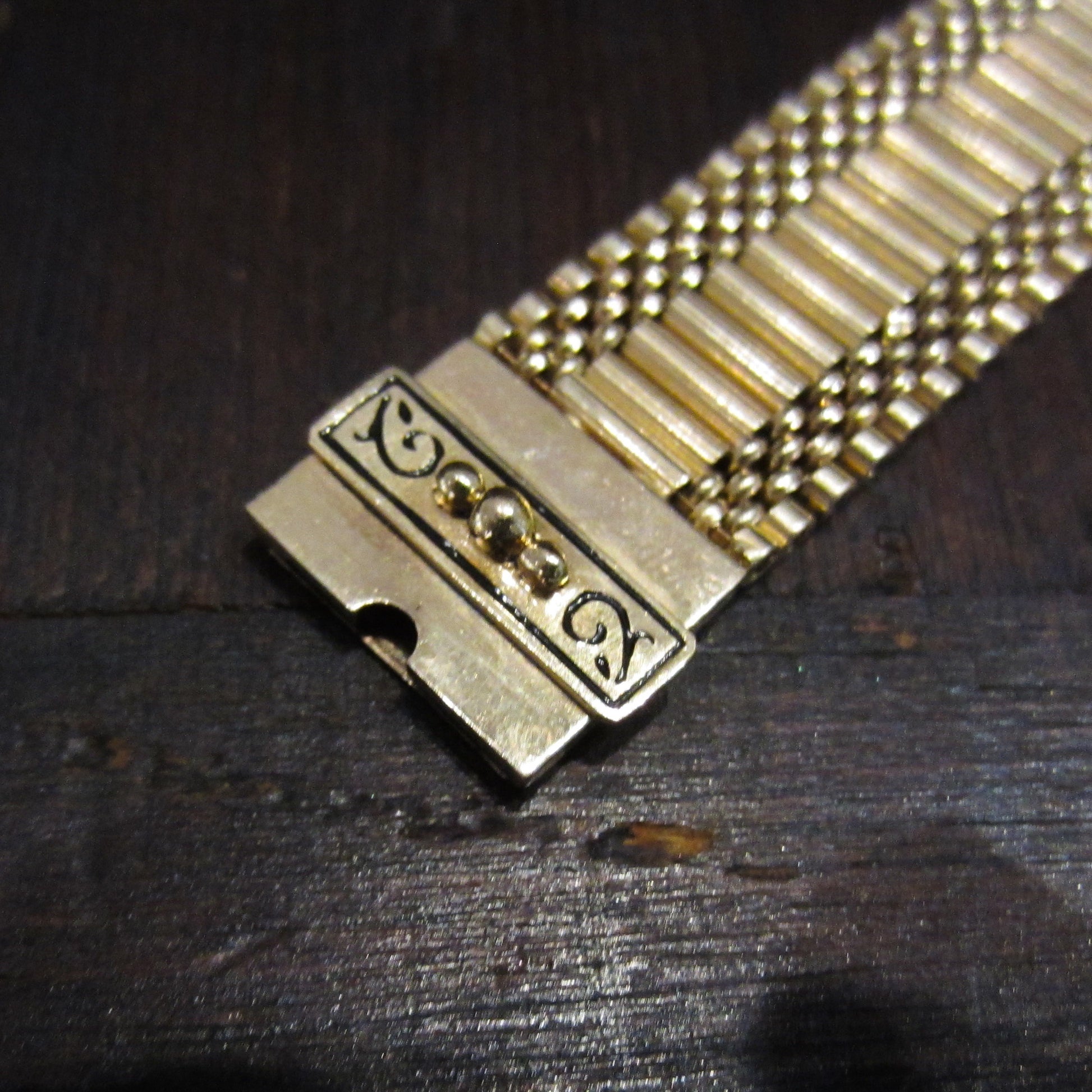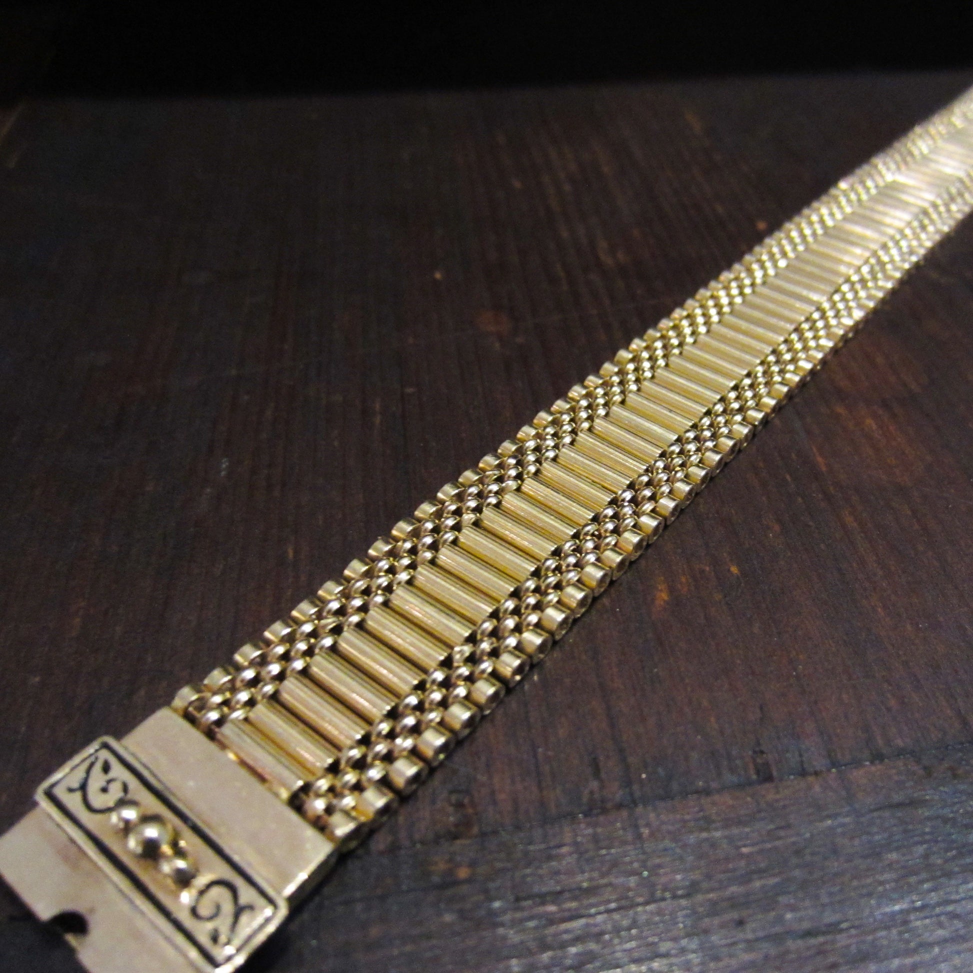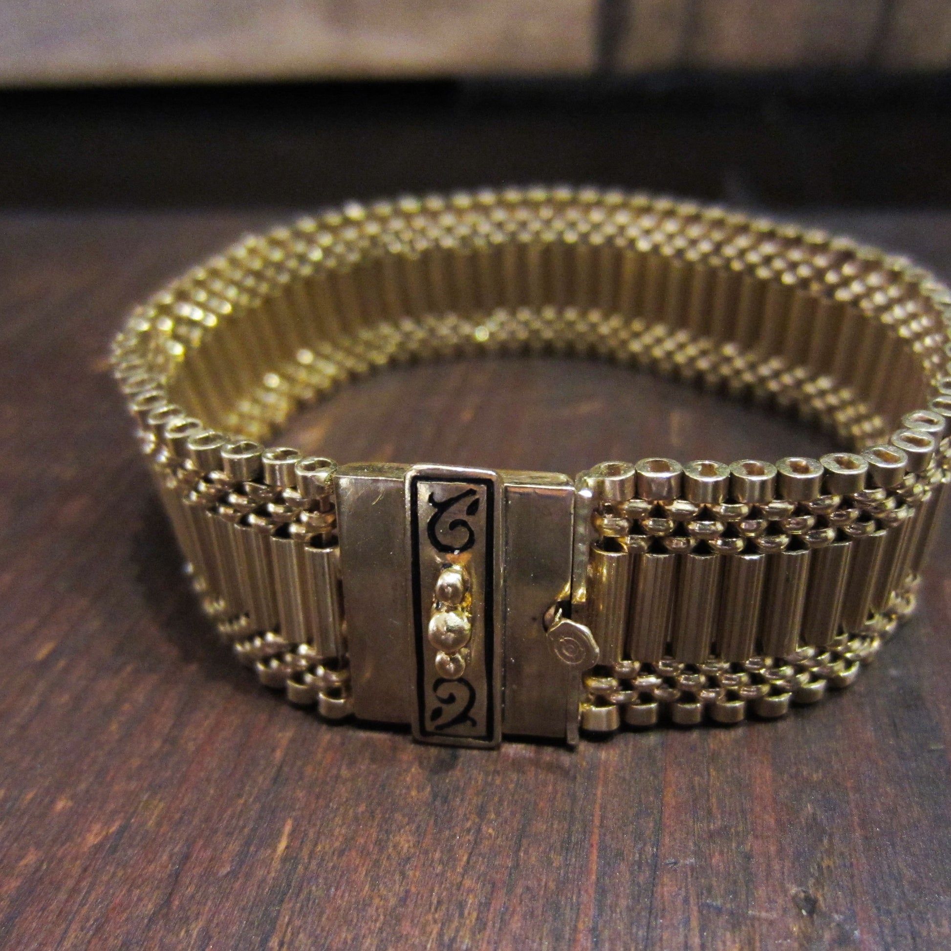 Made in the Victorian Revival era of the 1950's, this gorgeous bracelet is both timeless and eminently wearable. It also looks GREAT in a stack! Made in 14k with black enamel details on the box clasp and intricate flexible tube links.