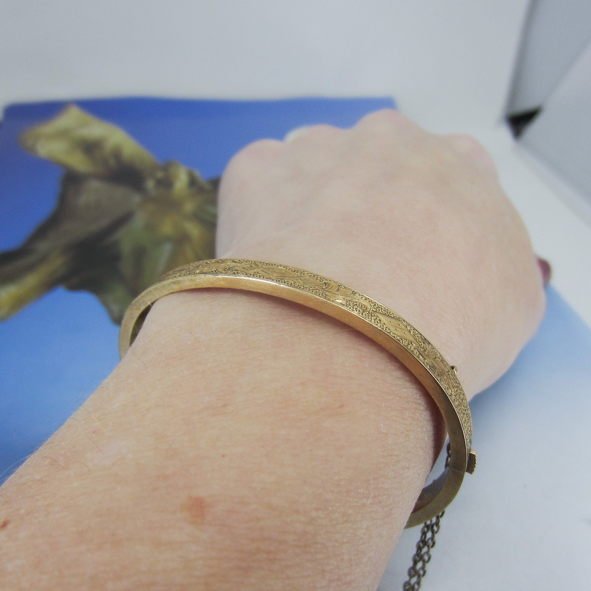 A late Victorian hinged bangle in a smaller size, with delicate engraved pattern all the way around. Made in 14k circa 1900. Sweet and romantic, this bracelet can be worn alone or stacked with other bangles!