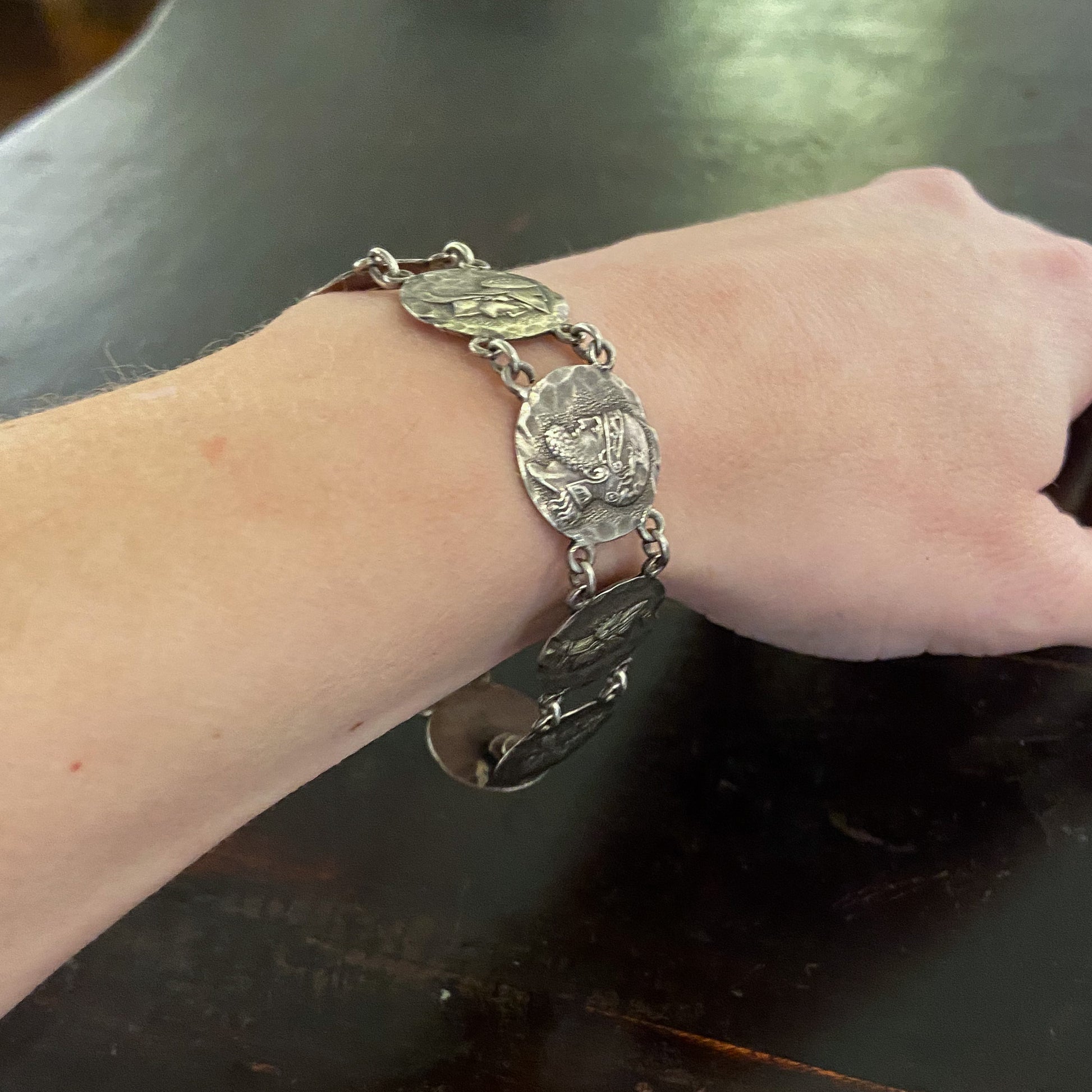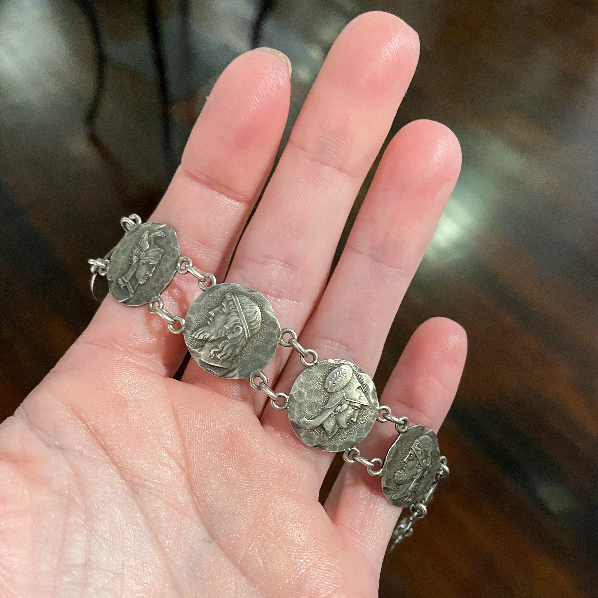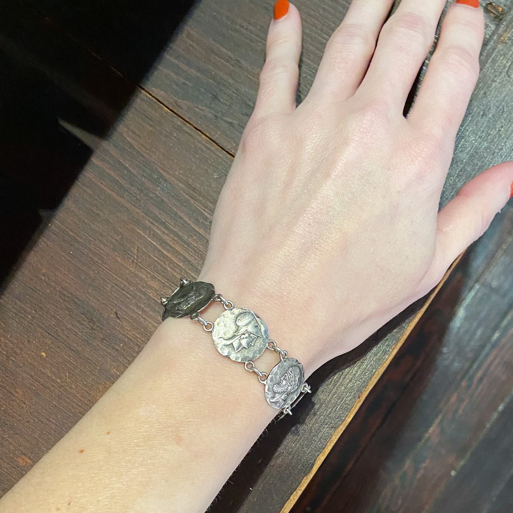 SOLD— Victorian Etruscan Revival Coin Bracelet Sterling c. 1884