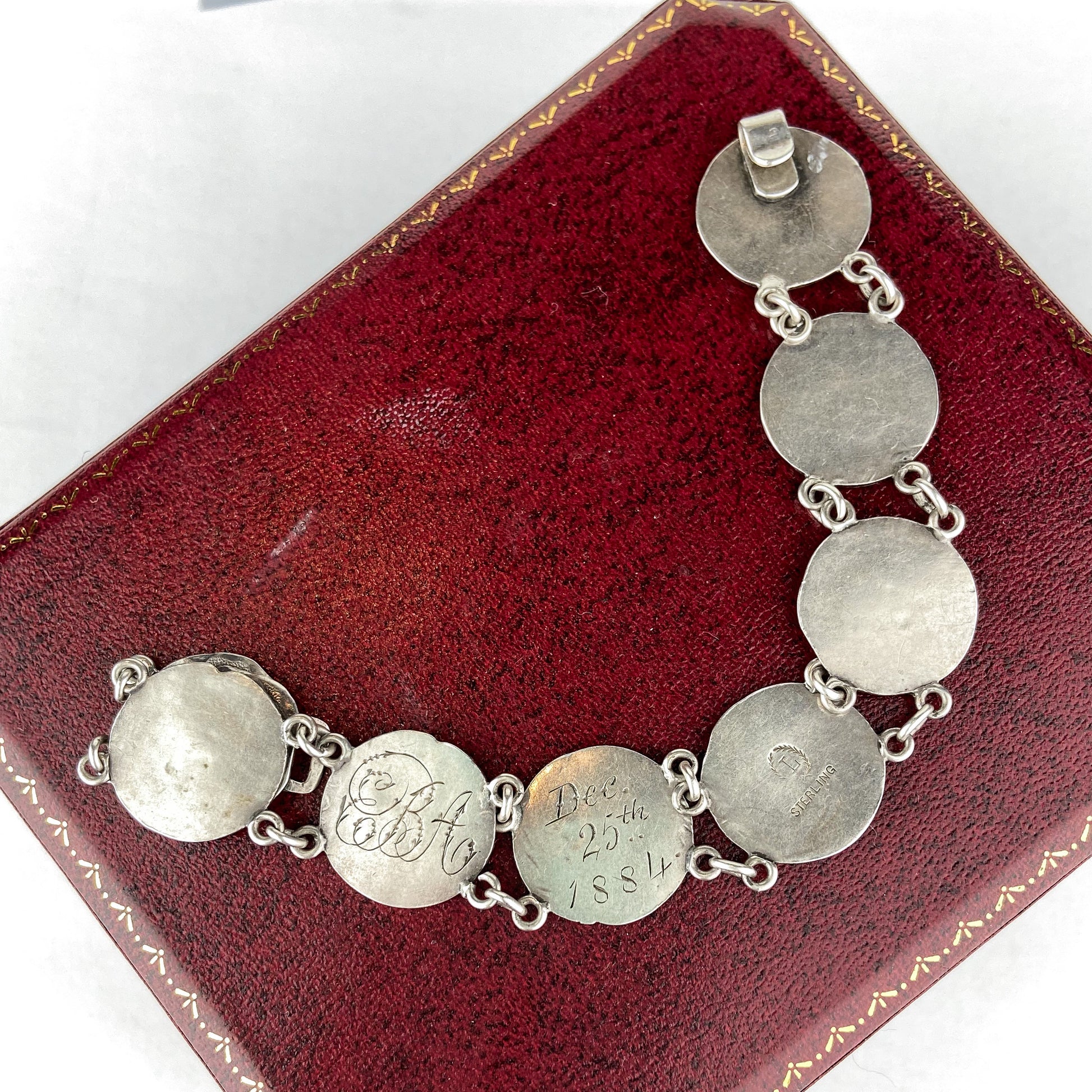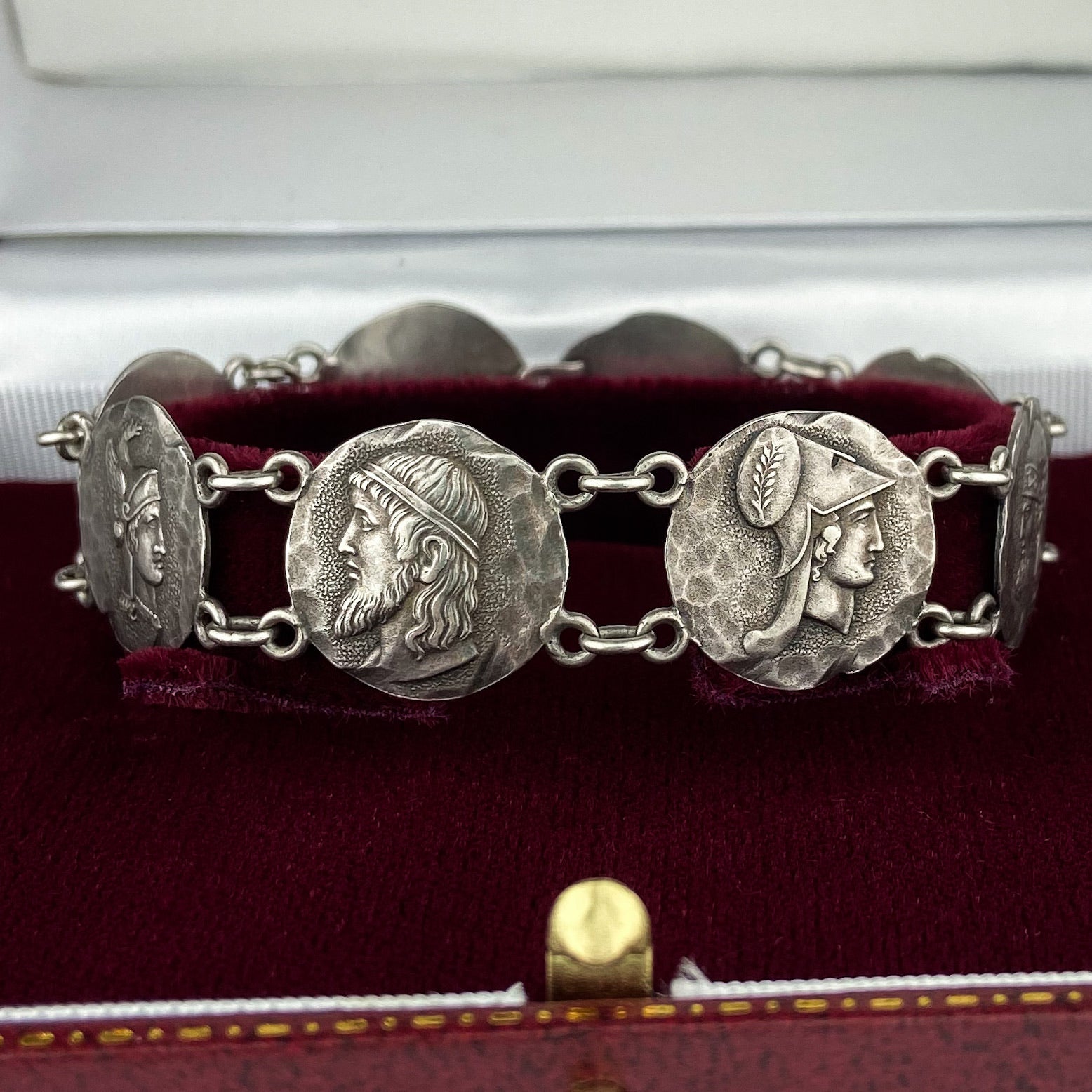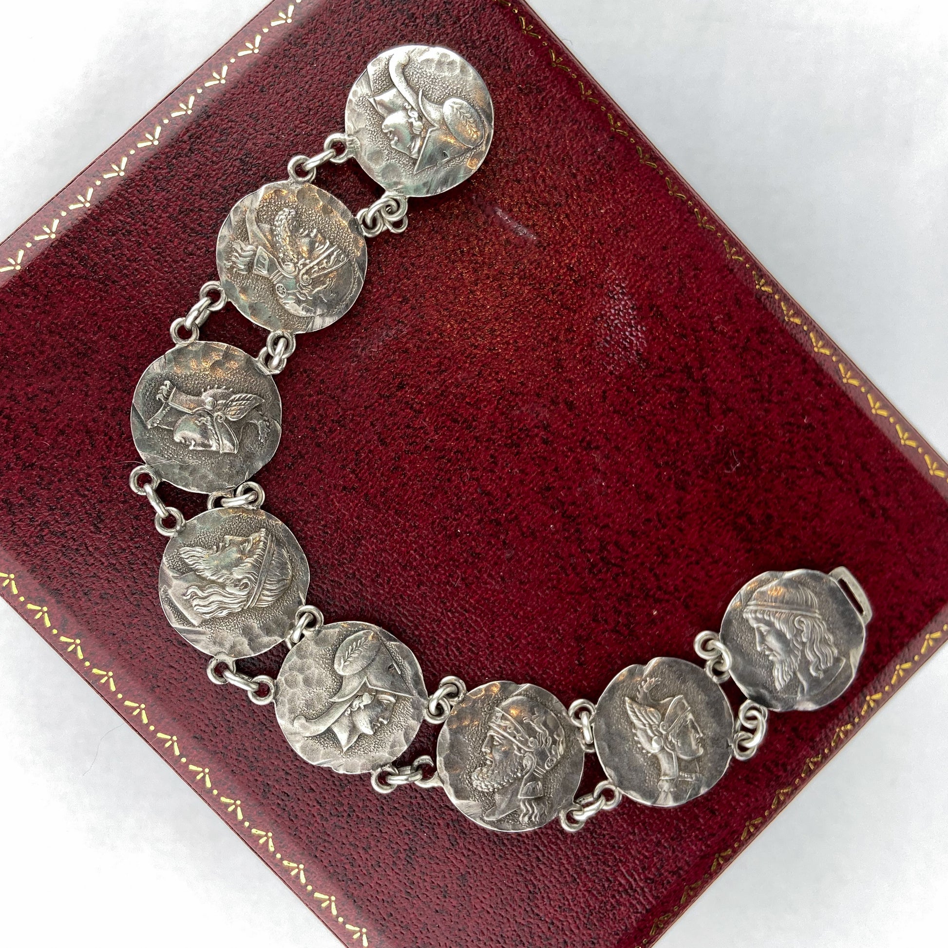 A true heirloom, this Victorian bracelet features eight Etruscan Revival style coins with classical profiles against a hammered background in sterling silver. Engraved on the reverse "Dec 25th 1884" with mark for Lewis Brothers.