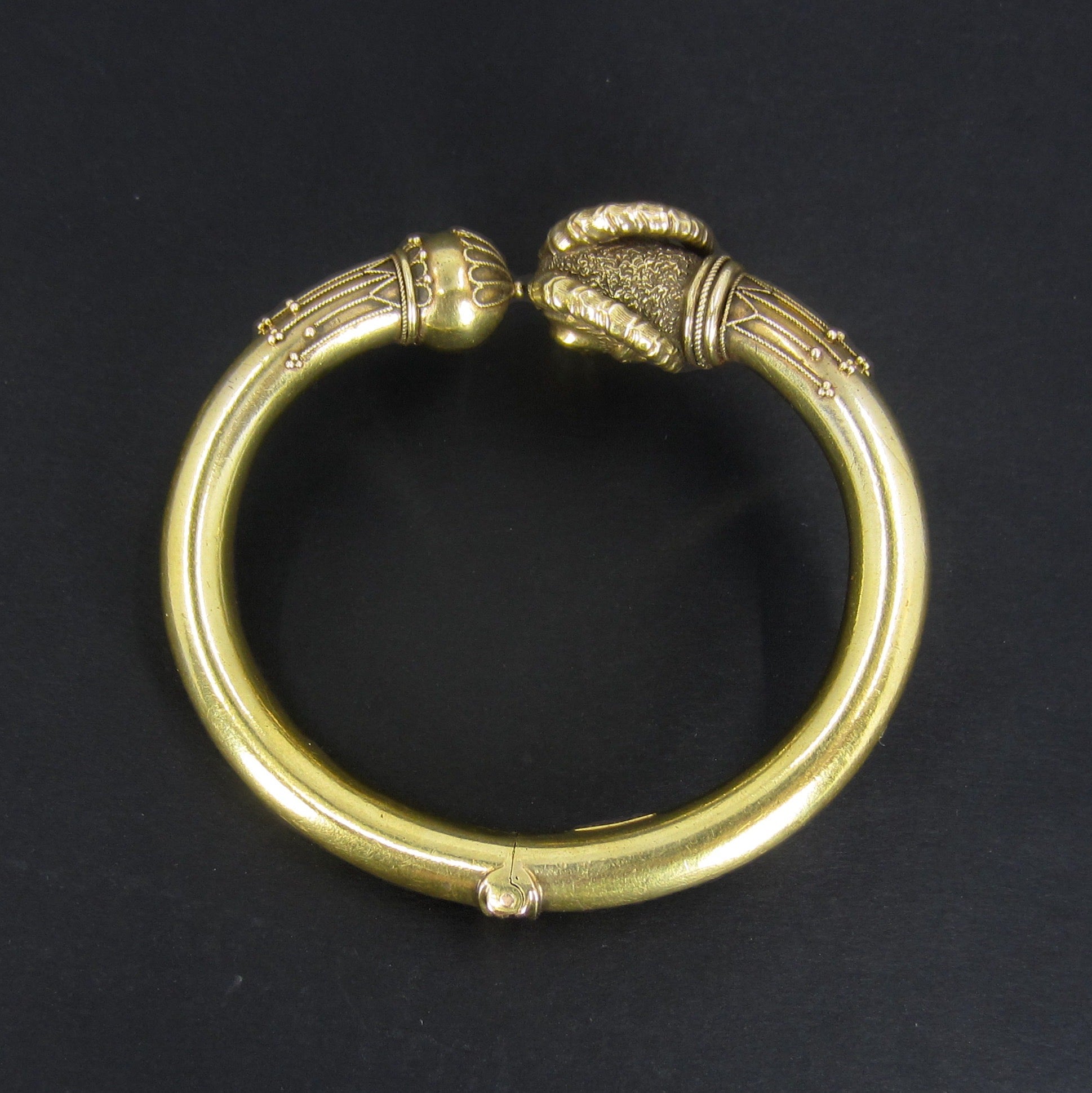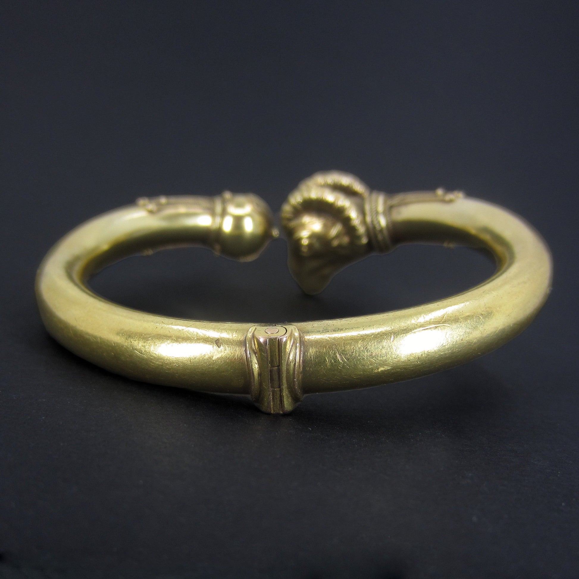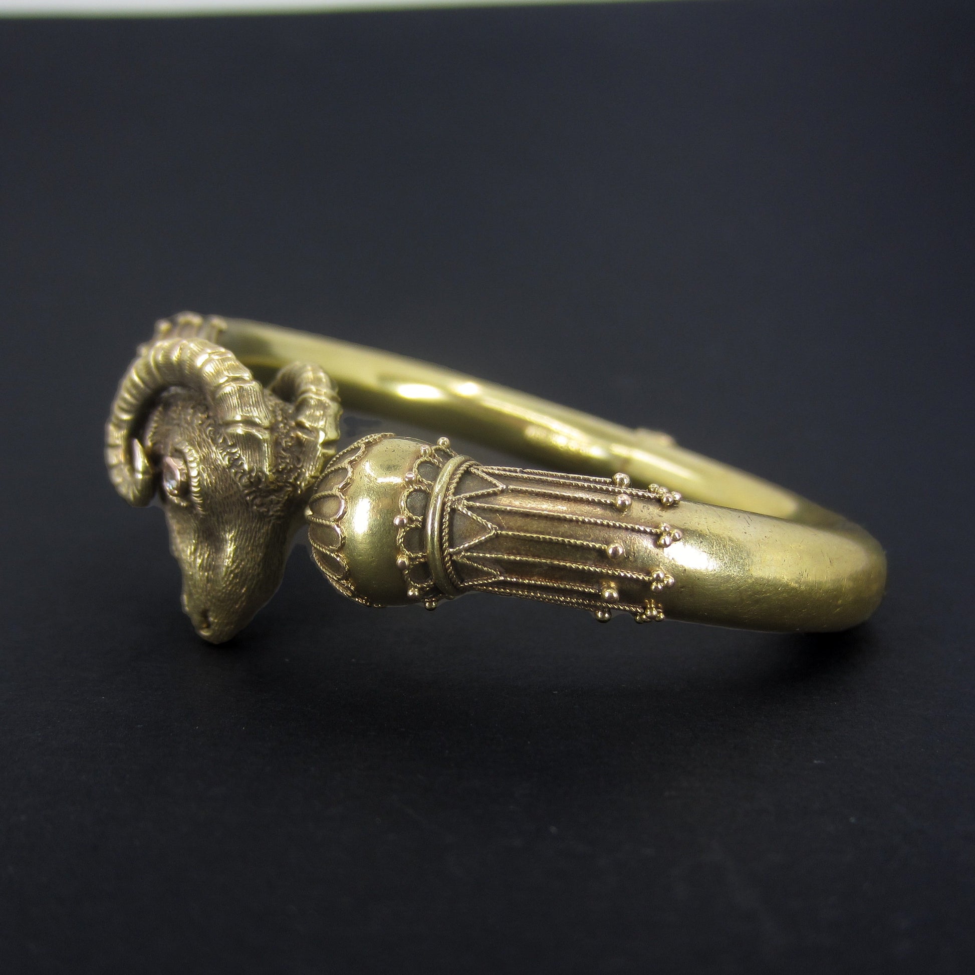 SOLD--Victorian Etruscan Revival Rams Head Hinged Bangle 14k c. 1880