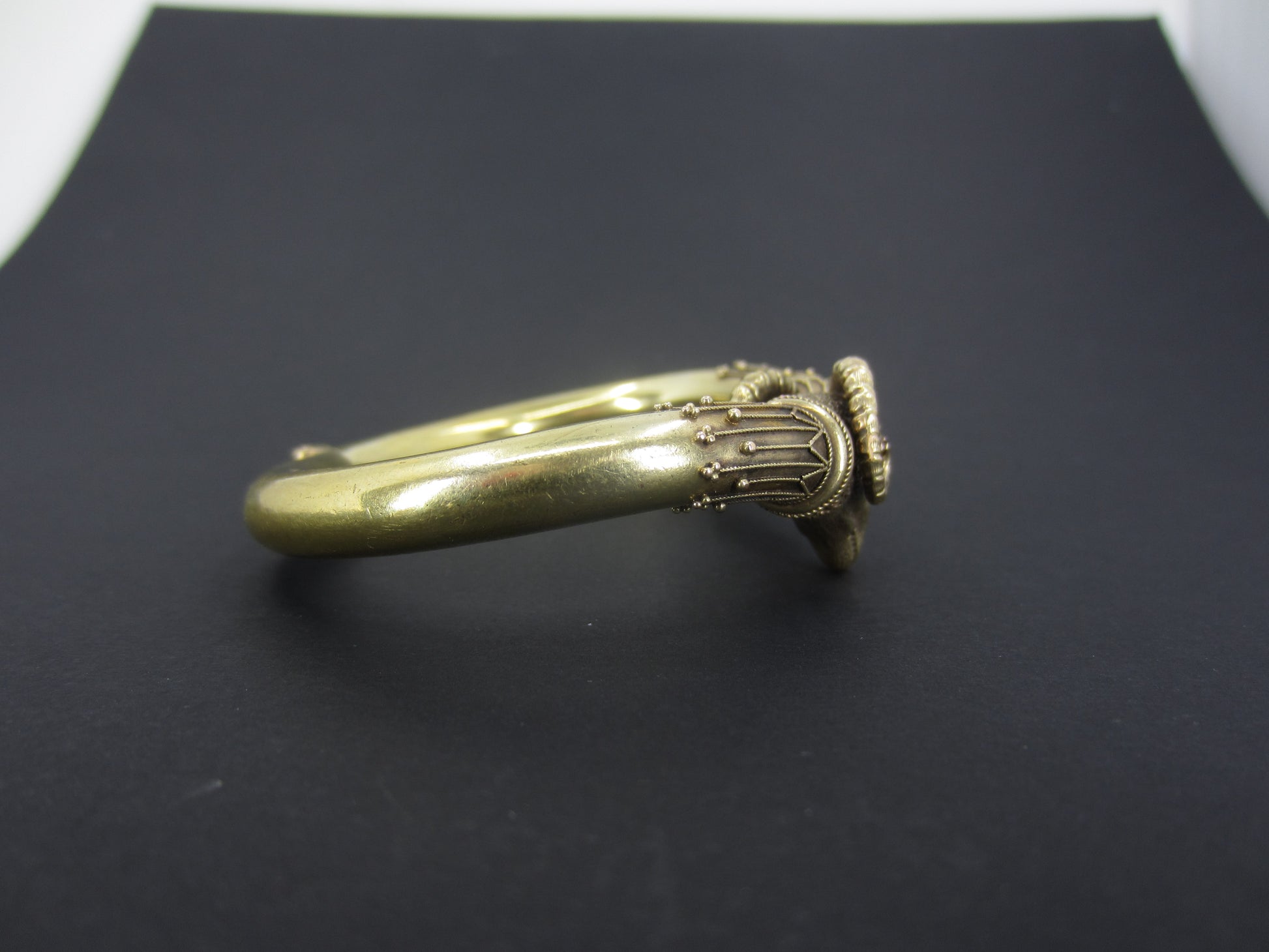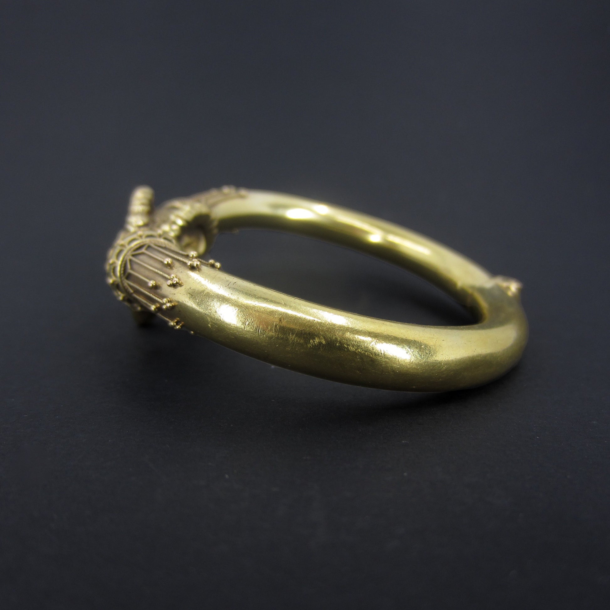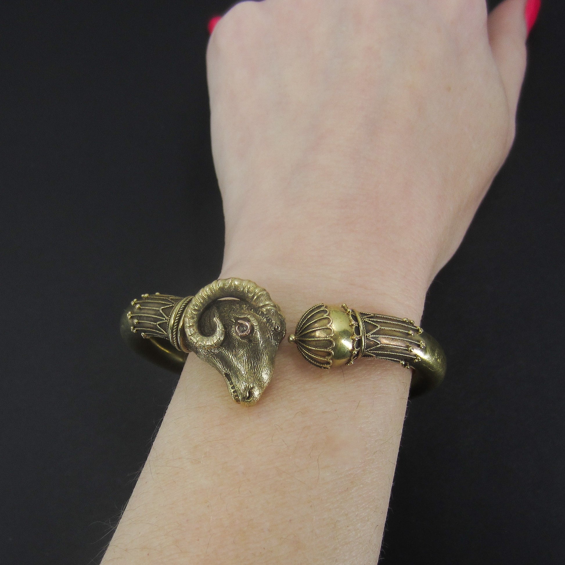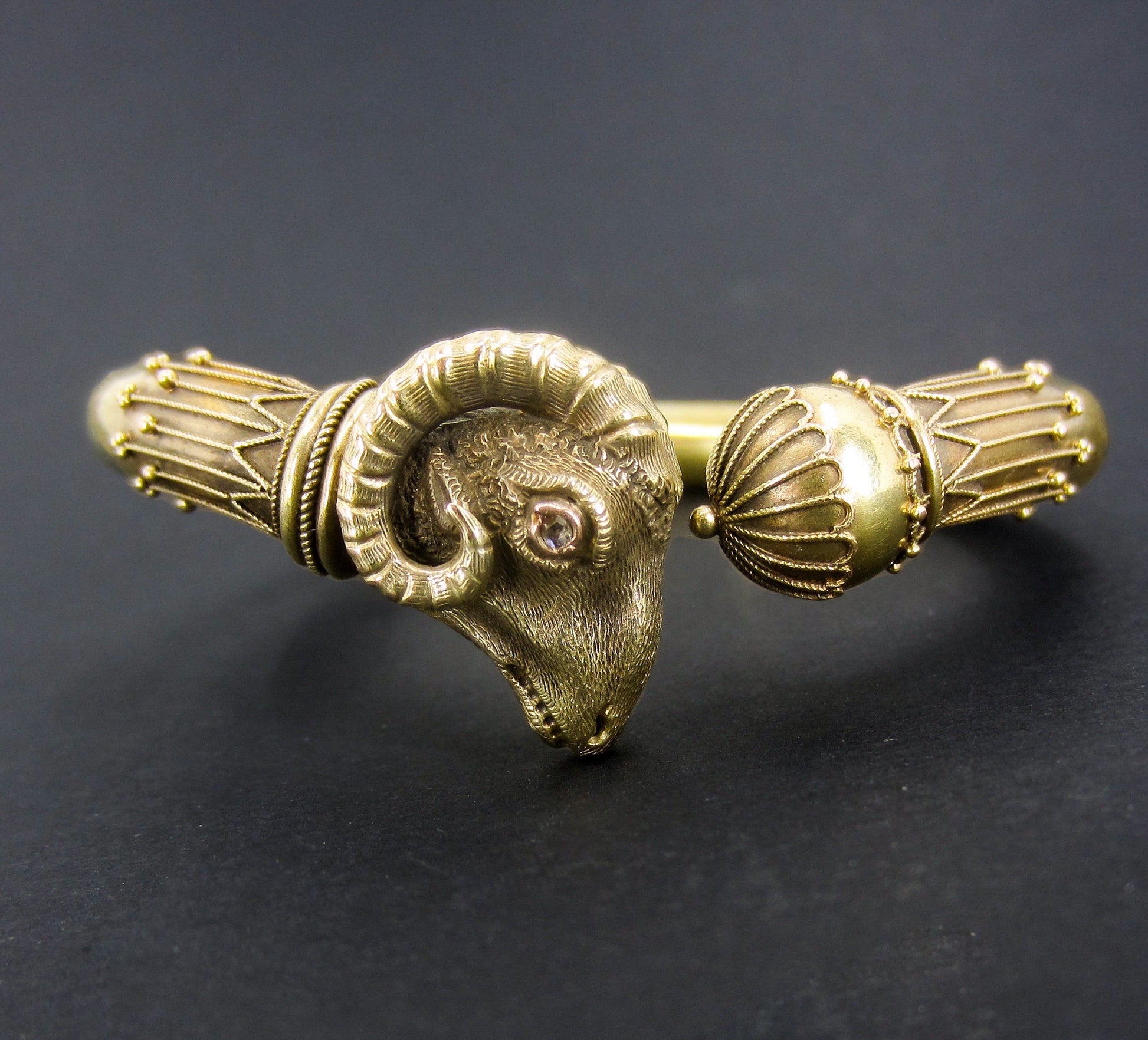 SOLD--Victorian Etruscan Revival Rams Head Hinged Bangle 14k c. 1880