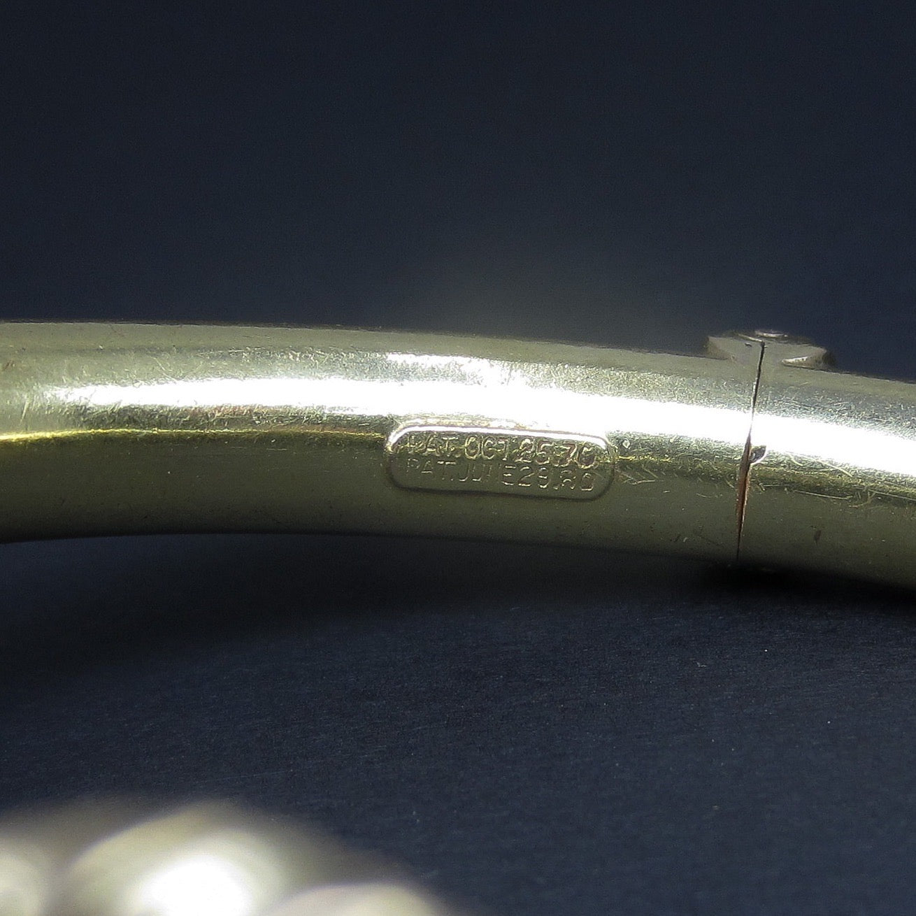 This Victorian bracelet is a stunning example of the Etruscan Revival style that was so popular in the 1860's-80's. Featuring a beautifully sculpted ram's head with a rose cut diamond eye and exquisite wirework and granulation. Made in 14k circa 1880. This bangle is hinged at the bottom and opens wide enough to accommodate small to medium wrists. Stamped with patent date for 1880.