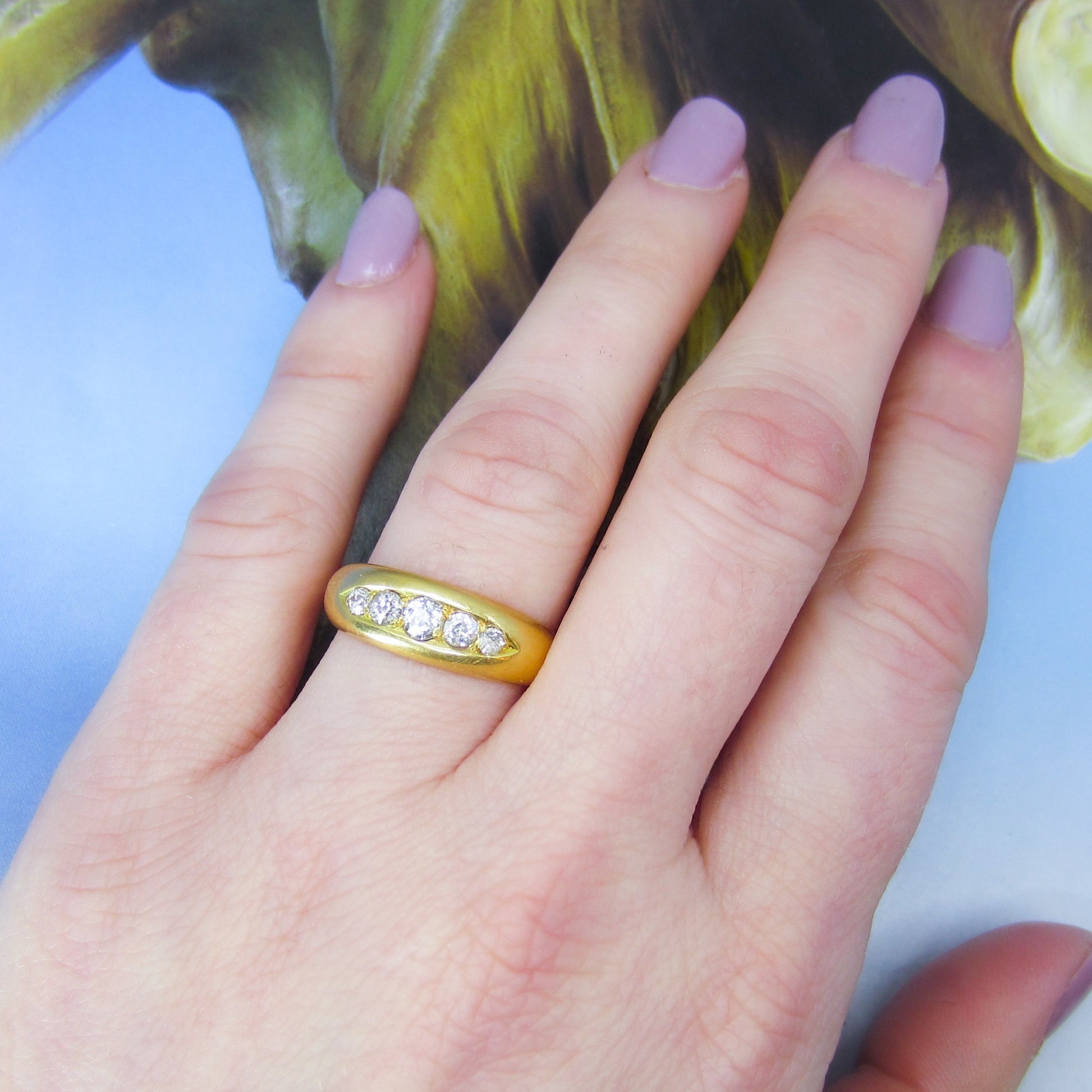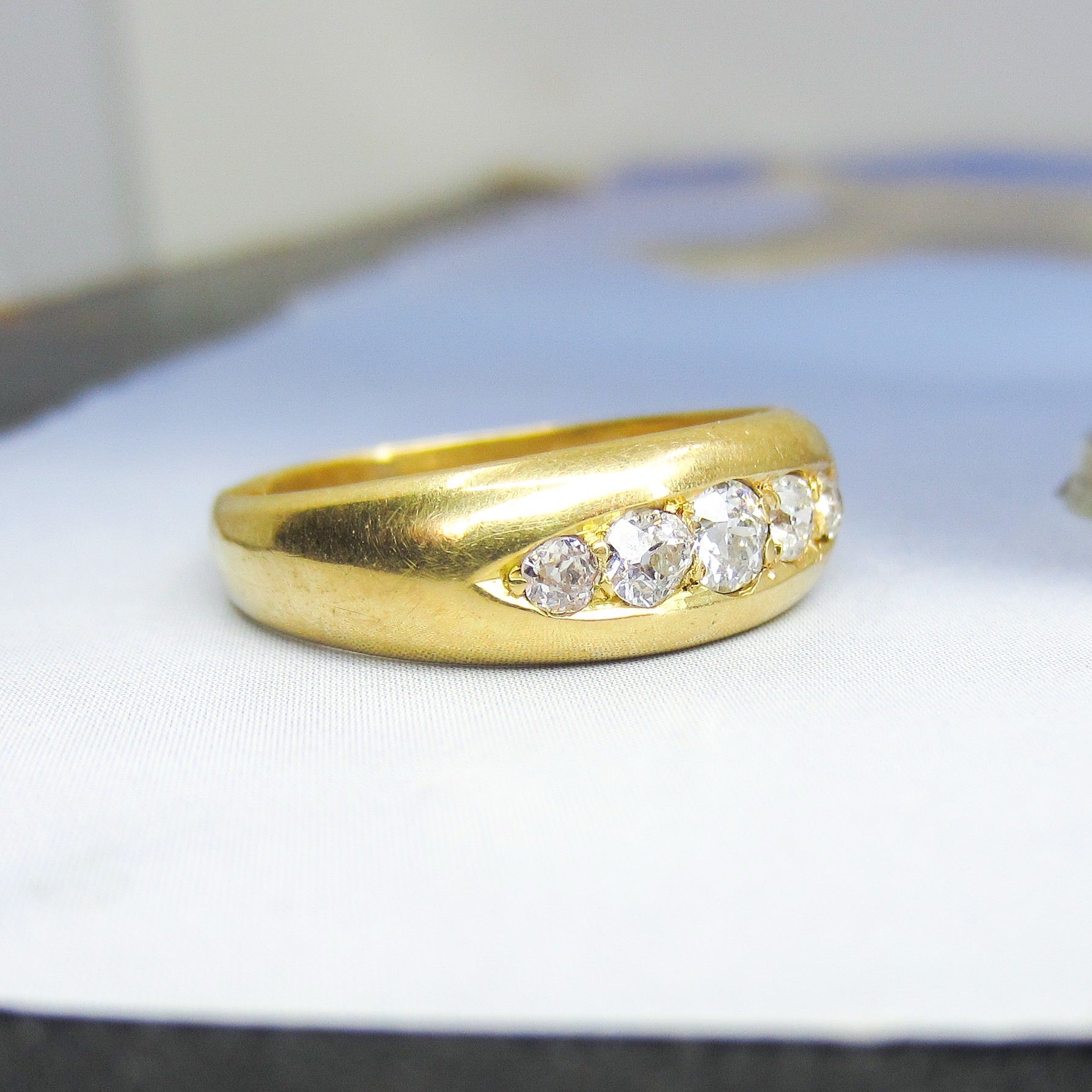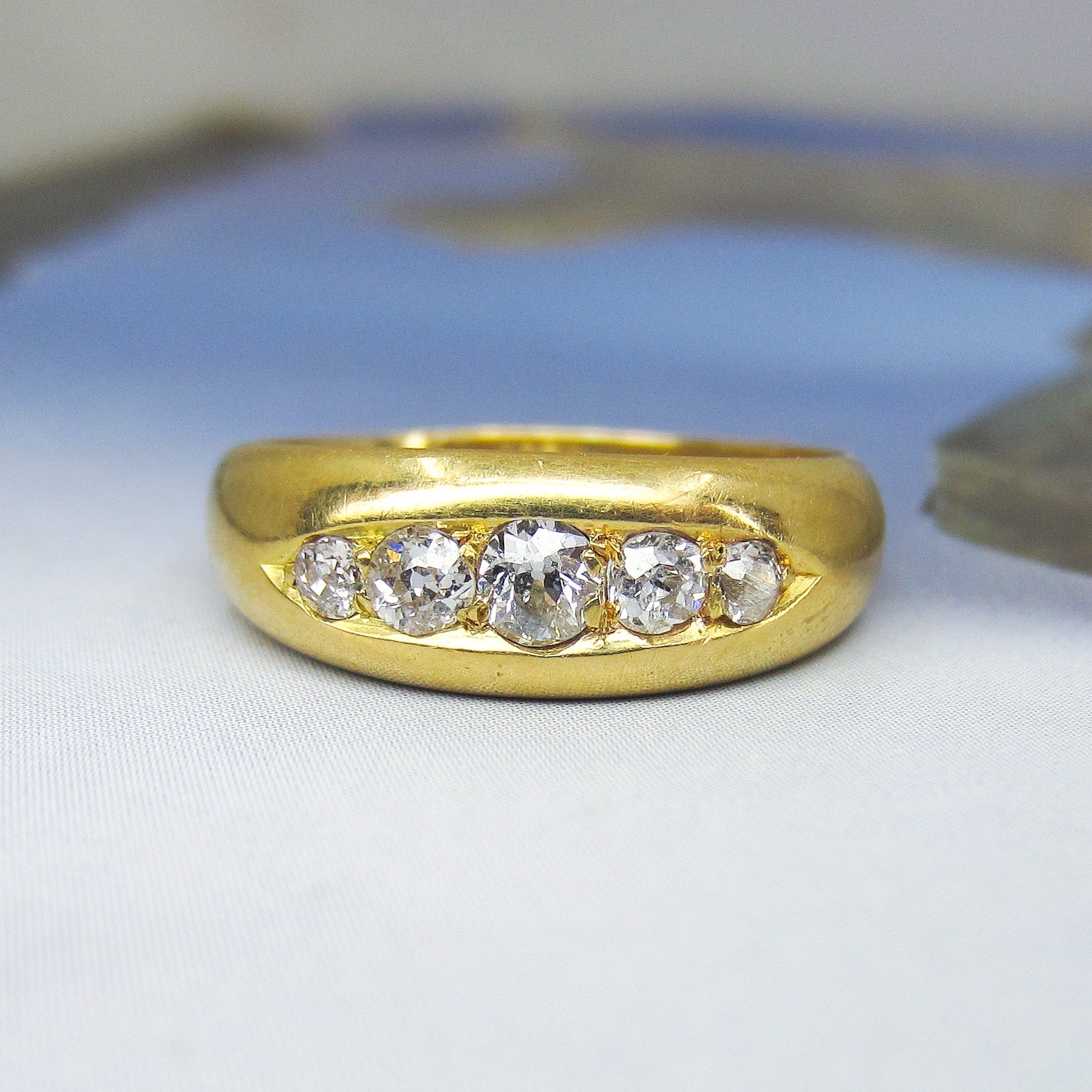 A gorgeous antique band, made in 18k yellow gold and set with five Old Mine Cut diamonds. Full British hallmarks for Chester, 1900 and 18k gold.