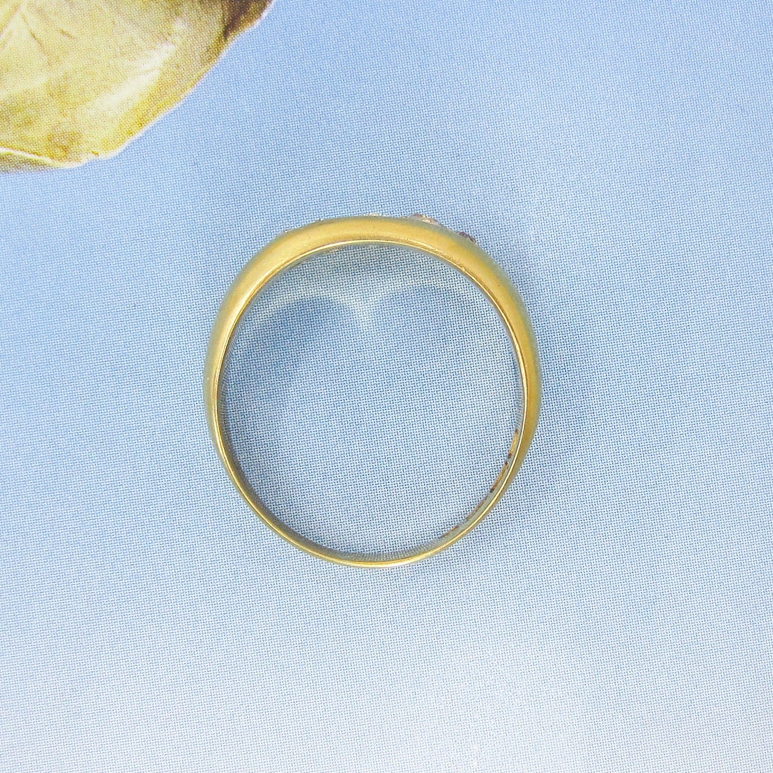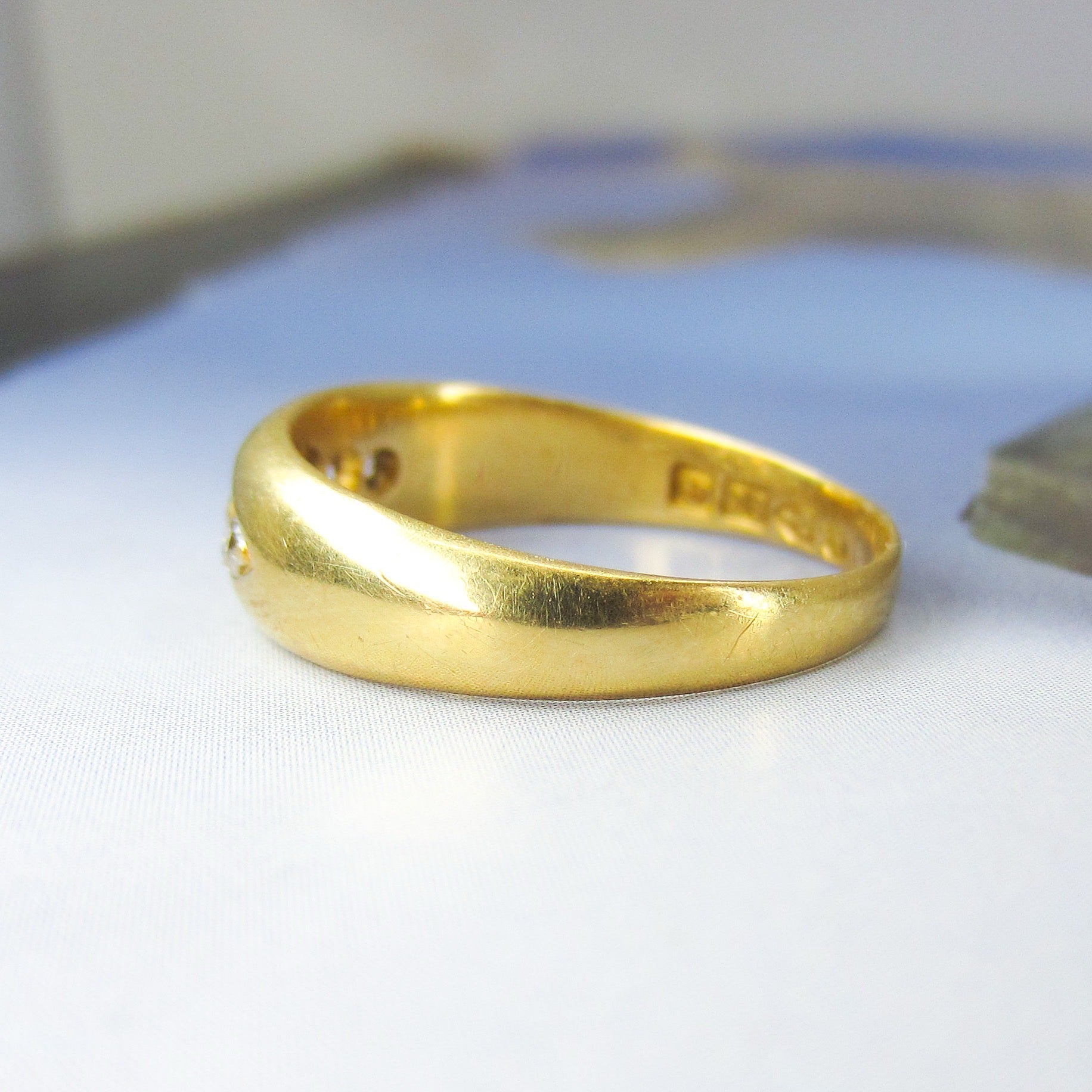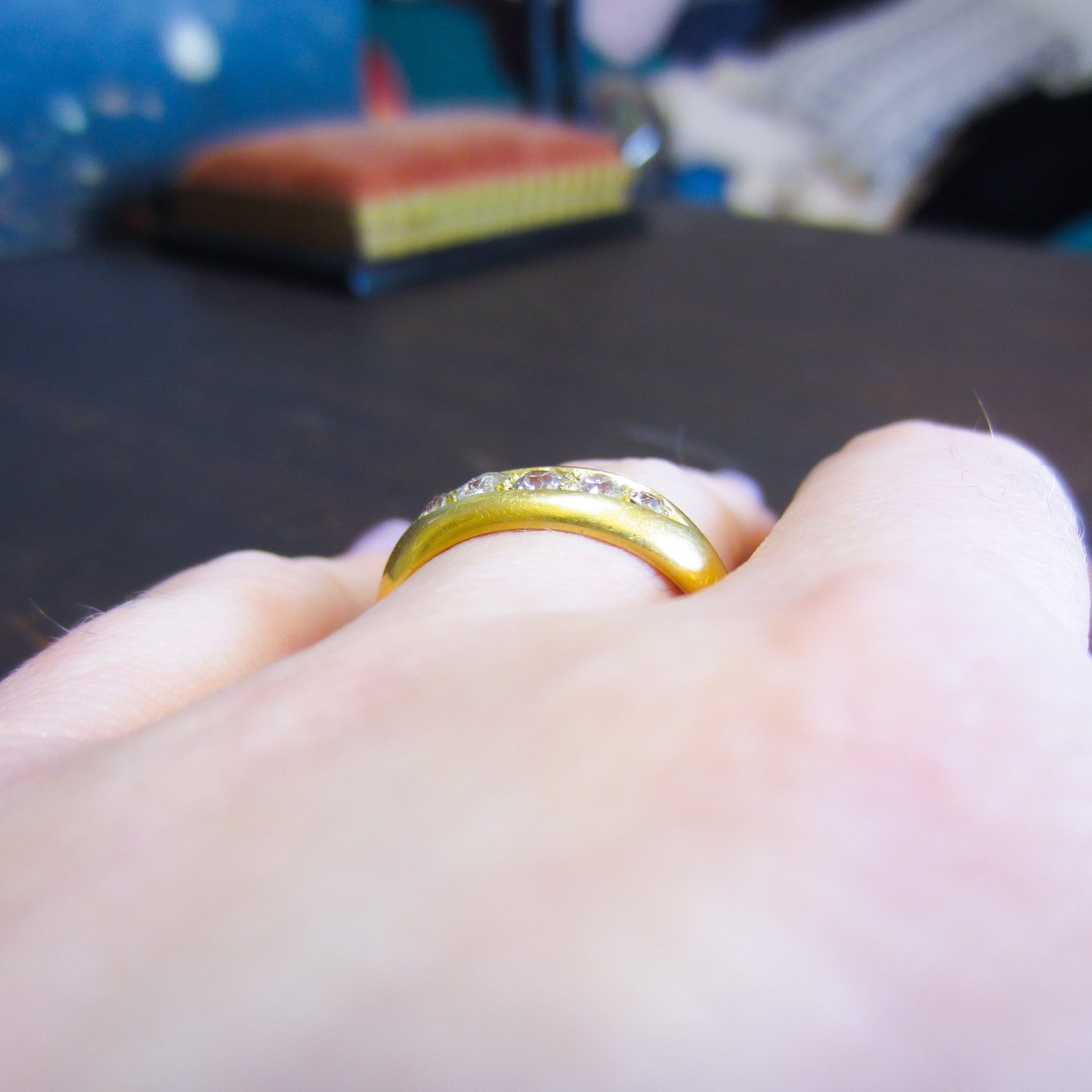 A gorgeous antique band, made in 18k yellow gold and set with five Old Mine Cut diamonds. Full British hallmarks for Chester, 1900 and 18k gold.
