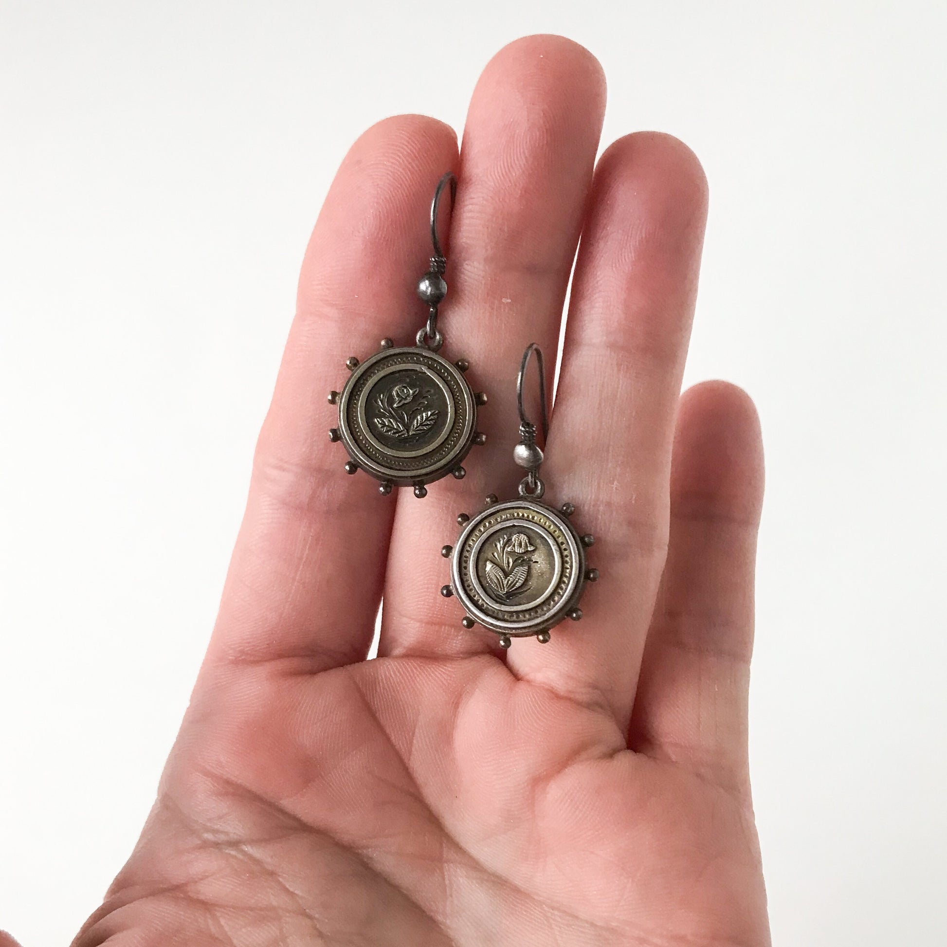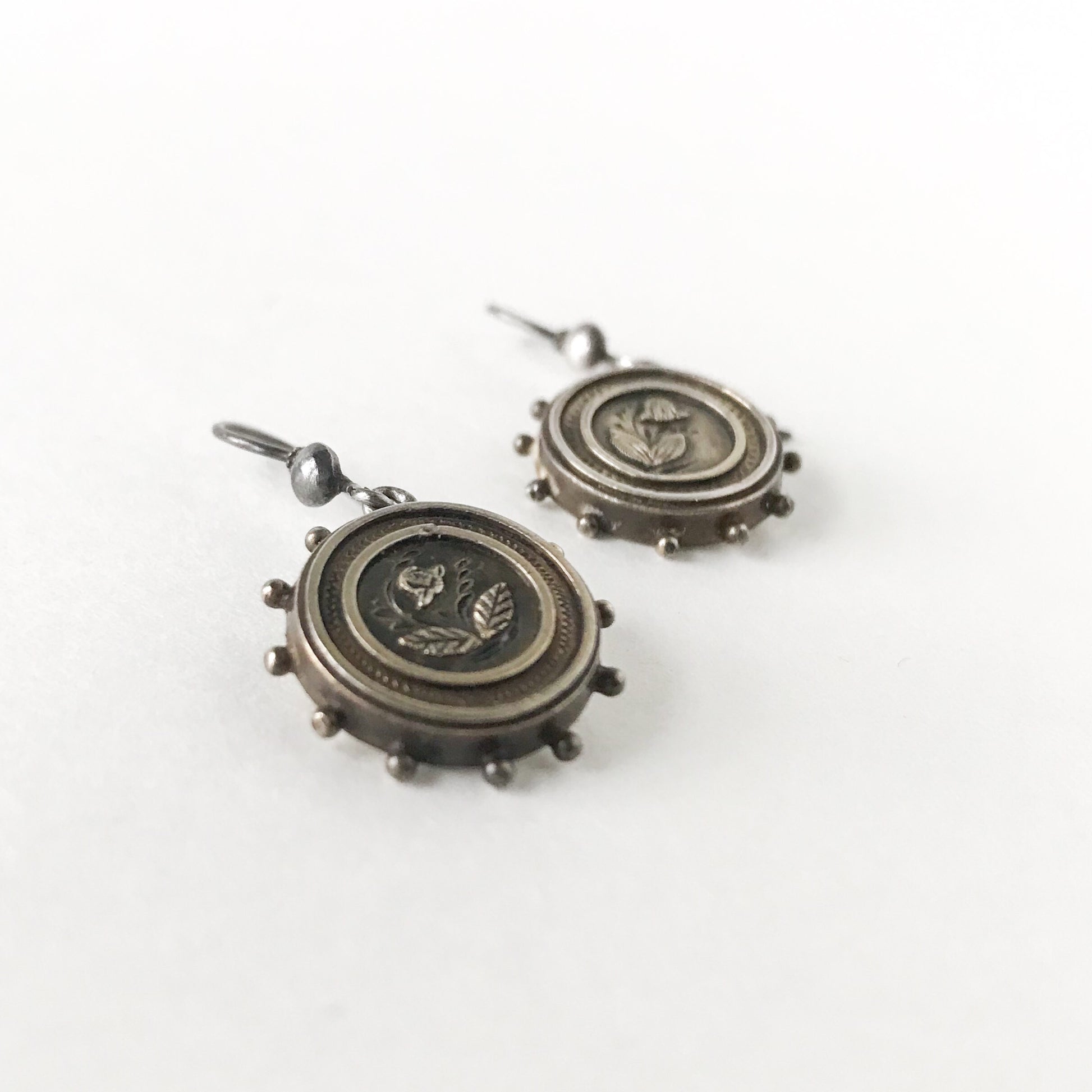 A pretty and wearable pair of Victorian silver earrings circa 1890, depicting a flower motif in an Etruscan Revival frame.