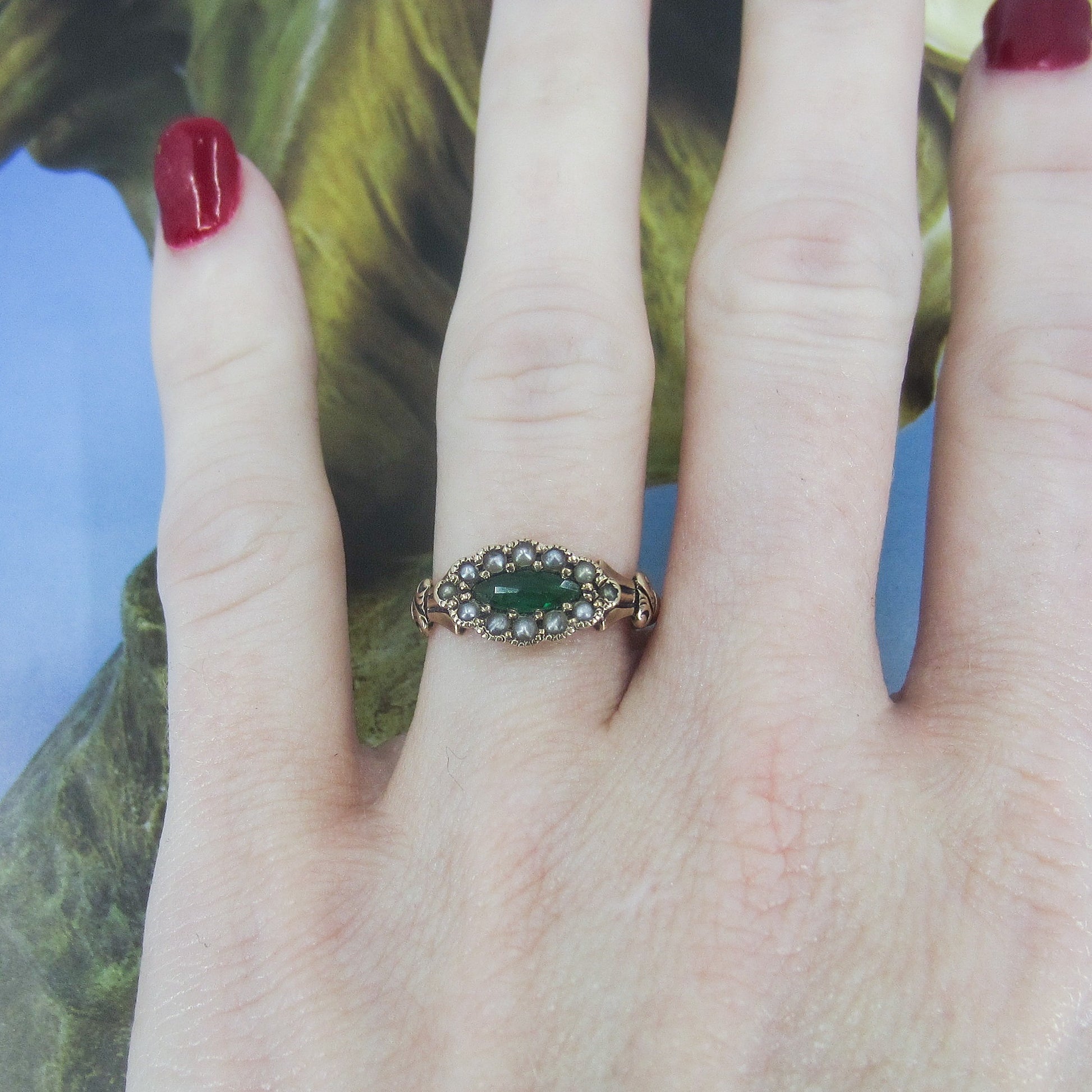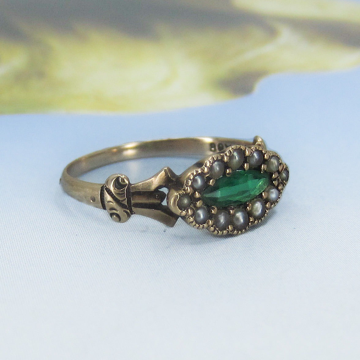 SOLD Victorian Green Glass and Seed Pearl Ring 14k c. 1880