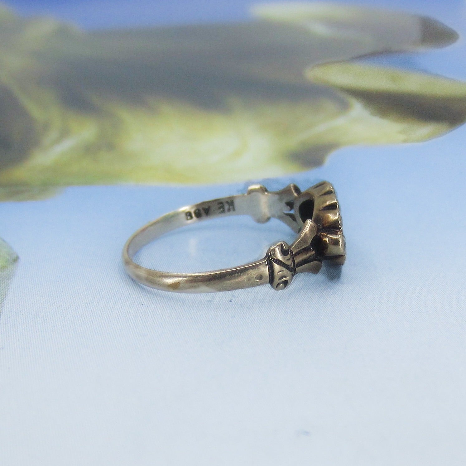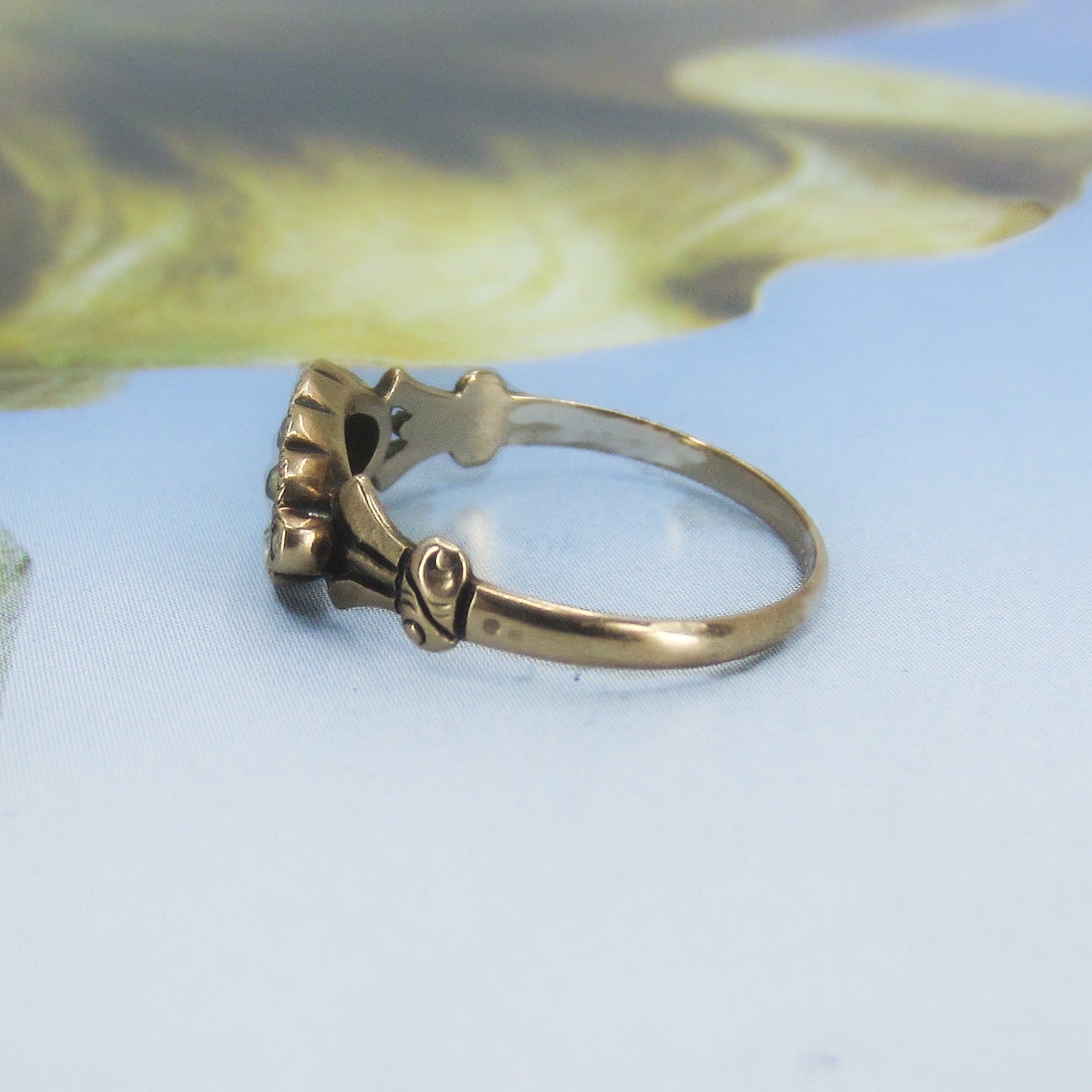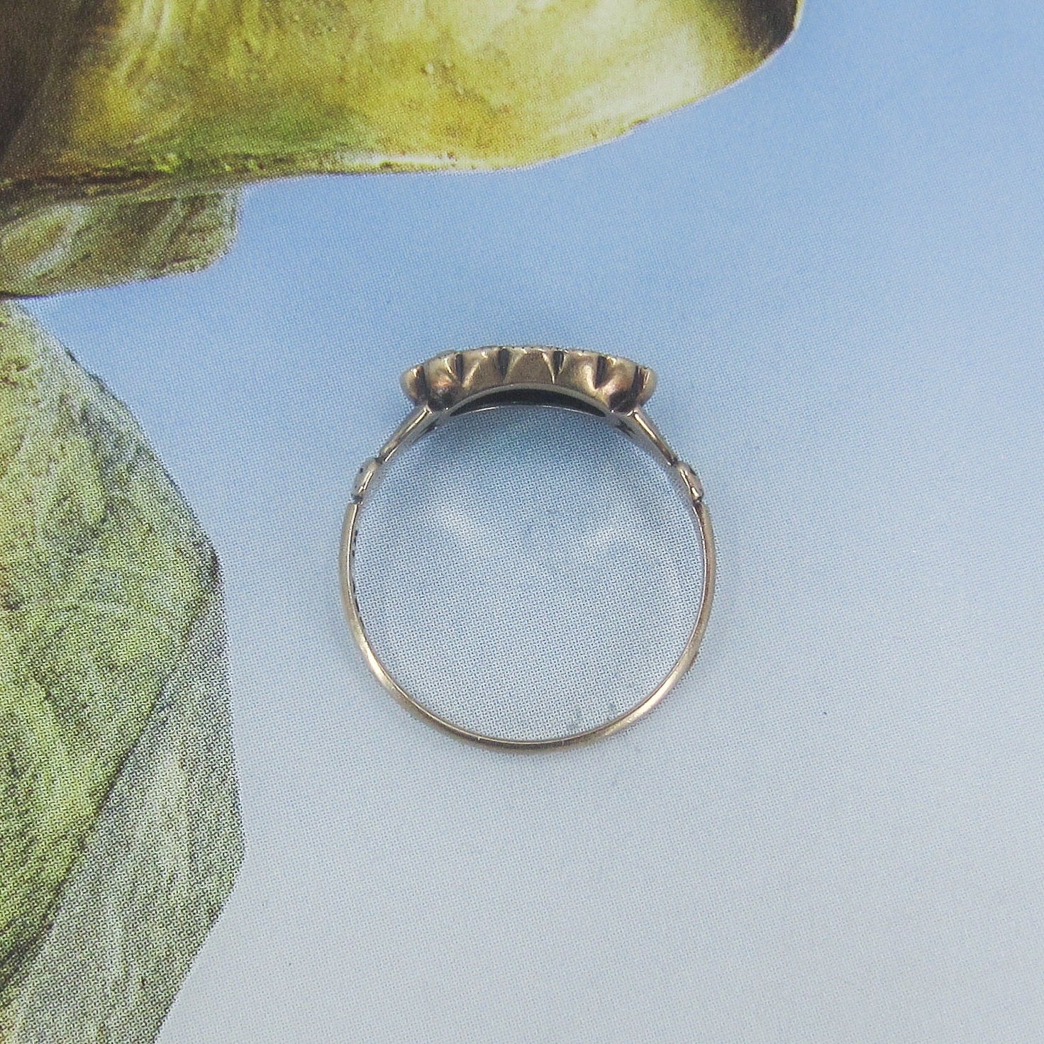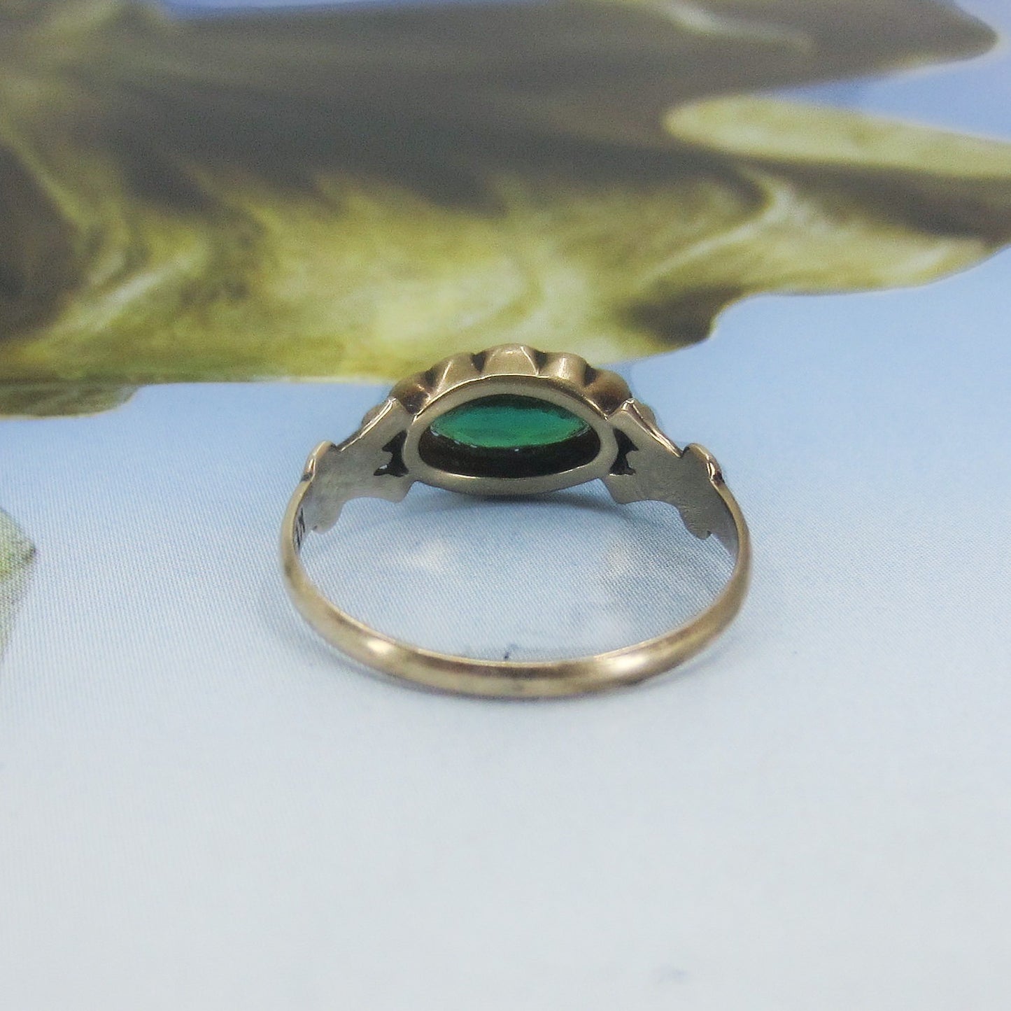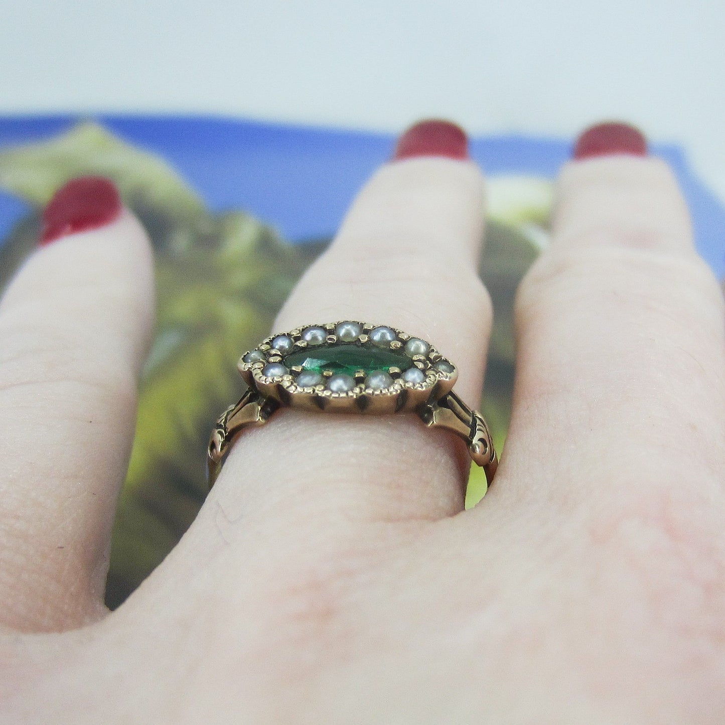 This sweet little ring was made in the late Victorian period circa 1880 and features a marquise cut green glass stone surrounded by a frame of natural seed pearls in 14k gold. This is an example of early mass production jewelry, where buyers would typically order a piece from a catalog. Prior to this only the wealthy were able to afford fine jewelry, but in the 1880's many notable companies emerged as manufacturers in more affordable price points for the middle class. I love to think of who might have been the original owner of a piece like this--maybe it was the very first ring they ever owned! This would make a lovely starter piece for an antique jewelry collector.