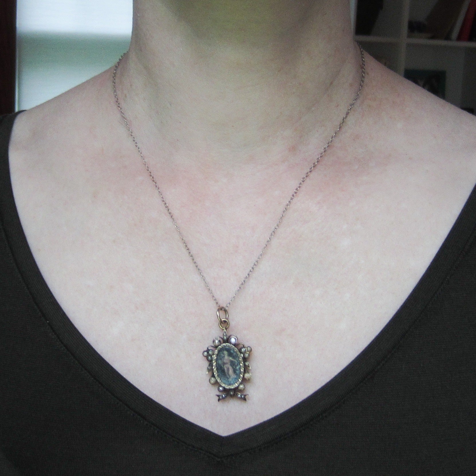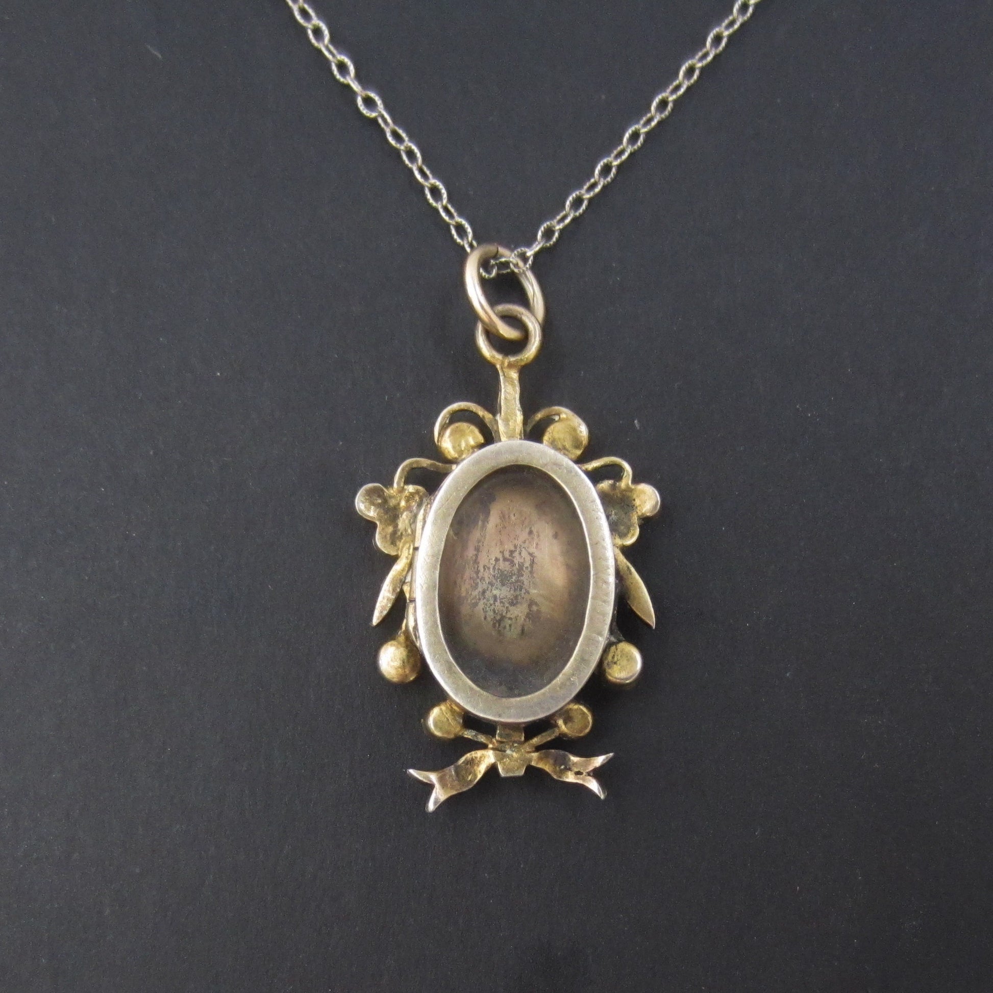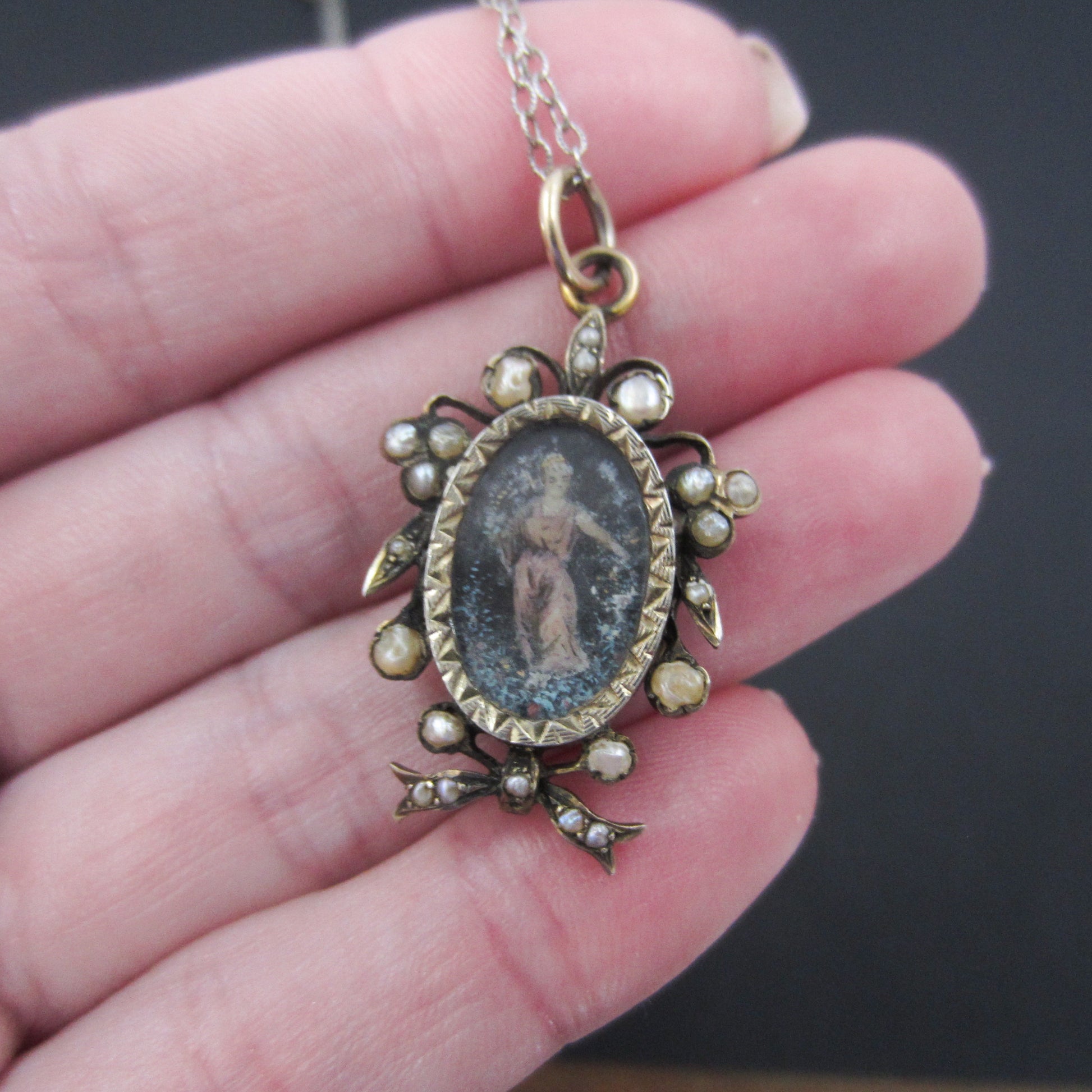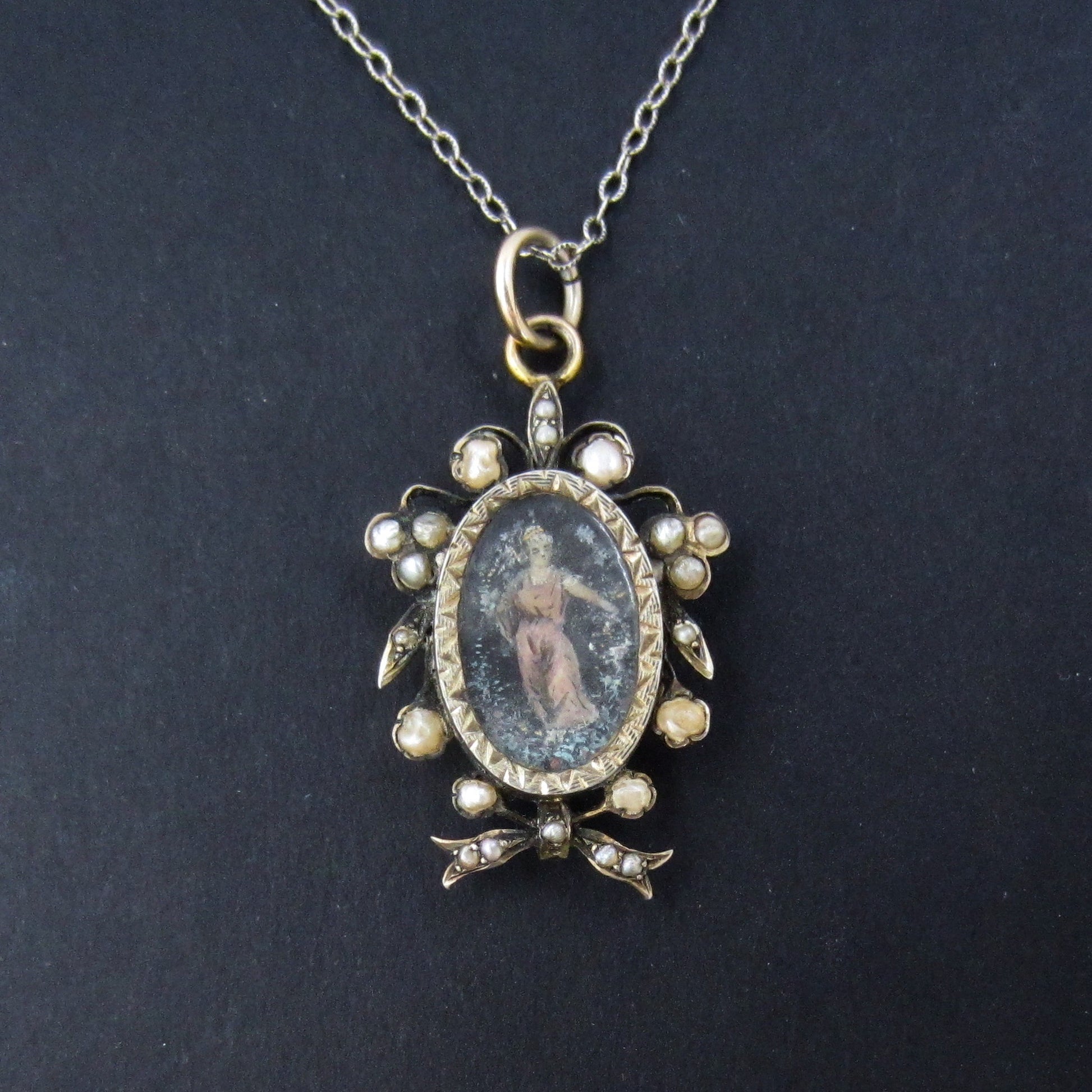 A sweet, romantic little antique locket that would have held a lock of hair or another keepsake. Made circa the 1880's, this Victorian locket features a hand painted portrait of a classical dancer set in a foliate frame of seed pearls in gilt silver. The back opens to reveal a deep compartment with the original glass. Though made in the Victorian era, this piece has that sort of Rococo styling that was so popular in Europe in the late 1800's!